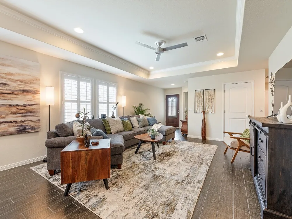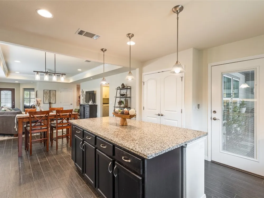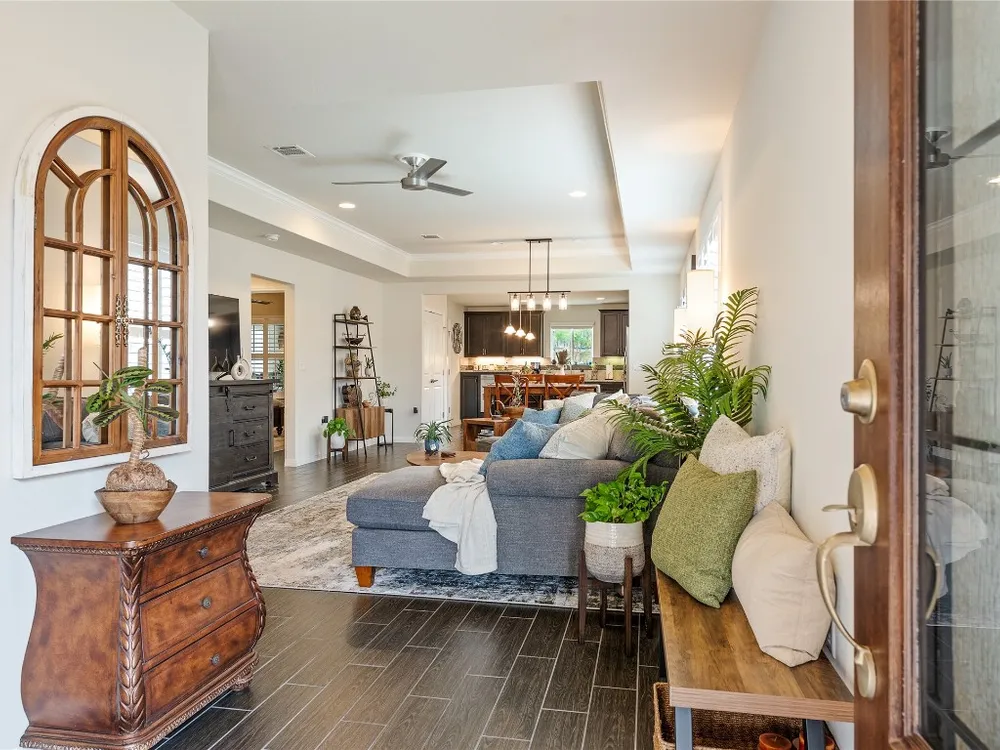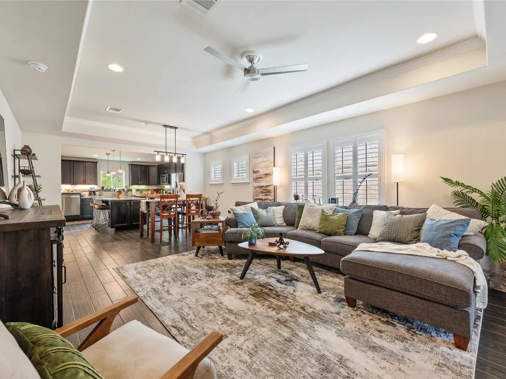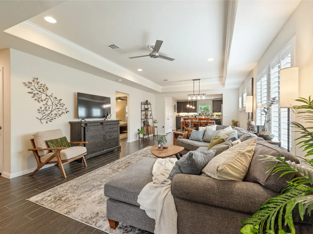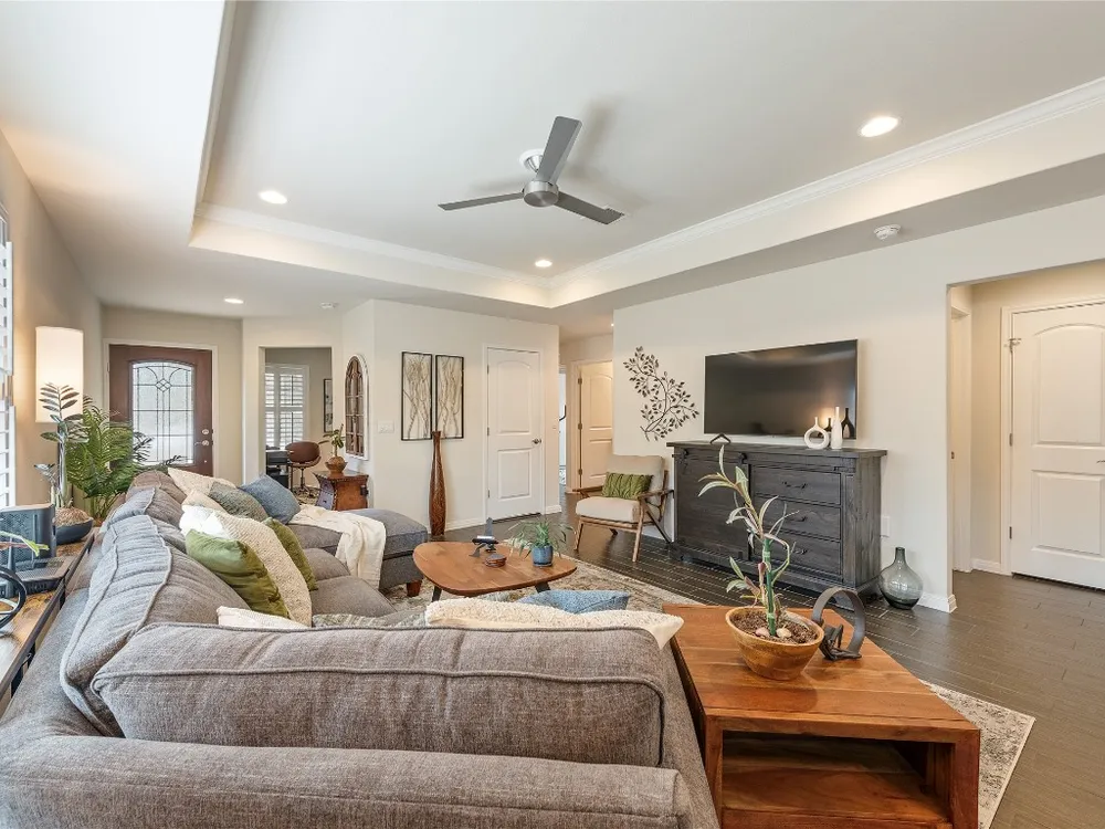 - Tray Ceiling(s), Ceiling Fan(s), Chandelier, Crown Molding, Double Vanity, Granite Counters, Kitchen Island, Multiple Living Areas, Main Level Primary, MurphyBed, NoInteriorSteps, Open Floorplan, Recessed Lighting, Walk-In Closet(s), High Speed Internet