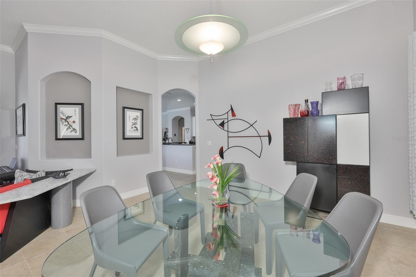 - Built-in Features, Ceiling Fan(s), Crown Molding, Eat-in Kitchen, High Ceilings, Kitchen/Family Room Combo, Living/Dining Room, Split Bedrooms, Stone Counters, Tray Ceiling(s), Walk-In Closet(s)