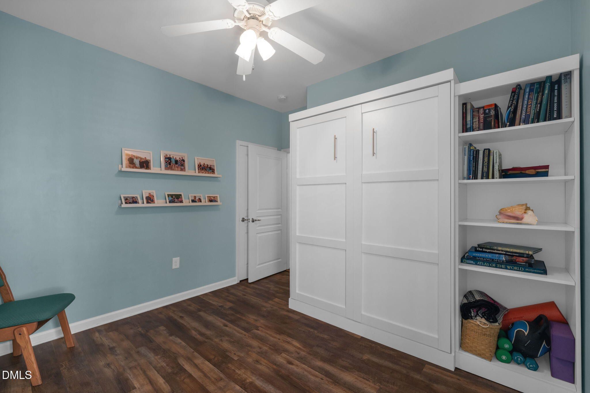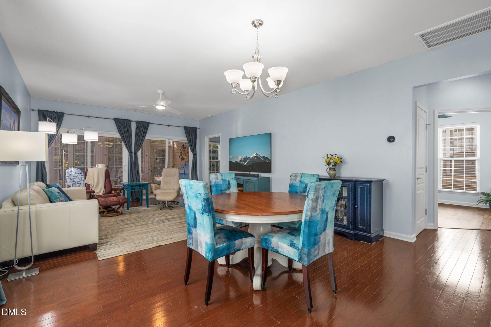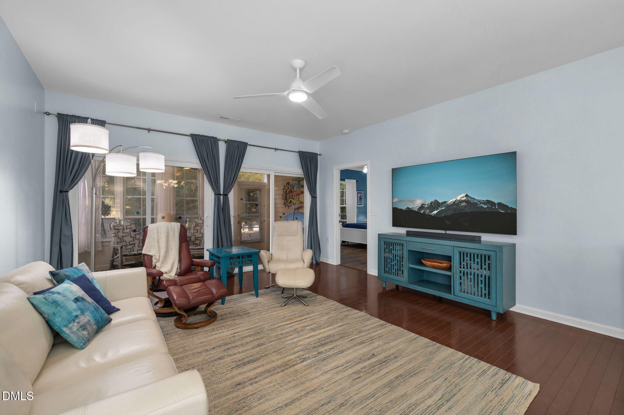 Pretty meets practical in this lovely Gray Myst floor plan with thoughtful improvements! The utility of the kitchen has been greatly enhanced to include extra cabinetry and builtins, an additional pantry, slider cabinet drawers and under cabinet lighting. Pleasant breakfast nook with lots of windows, granite counters, & newer garbage disposal. The deep walk-in closet off of the living room features tons of storage as well as in the extra-insulated attic accessed by pull-down stairs. The guest bedroom showcases a queen Murphy Bed that allows for flexibility of use of the room and the other secondary bedroom/office has a wall of shelving and desk area. The living/dining combo transitions easily to the 3-season room with EZ Breeze windows. Hardwood and LVP flooring throughout (no carpet). The primary bedroom with walk-in closet (shelving will stay) and private bath features triple windows with a pretty view of the back yard. All appliances convey as well as the garage workbench. Located in west Cary's premier 55+ active adult community with top notch amenities including indoor/outdoor pools, pickle ball, tennis, gym, pocket parks, access to trails, etc.