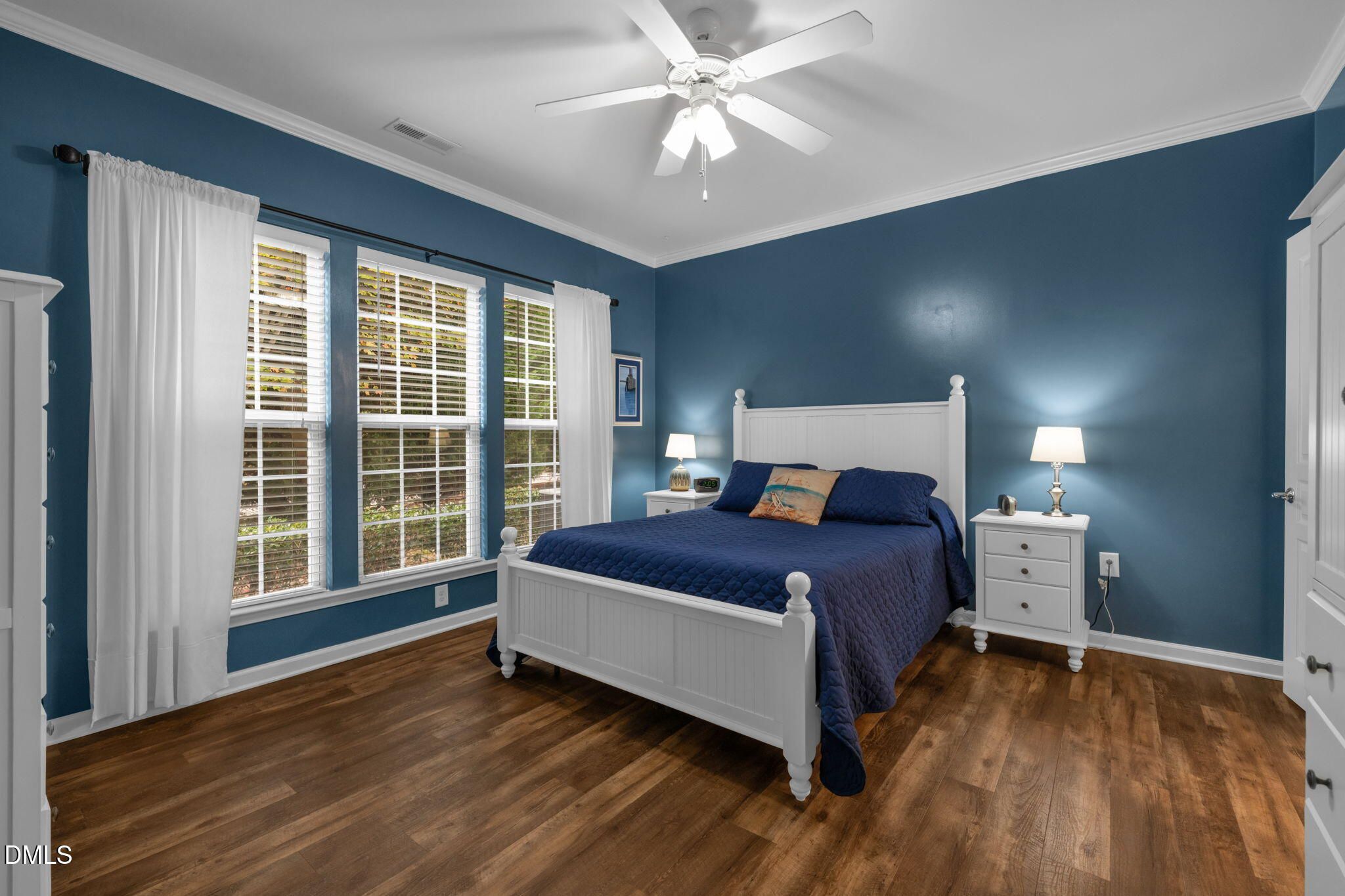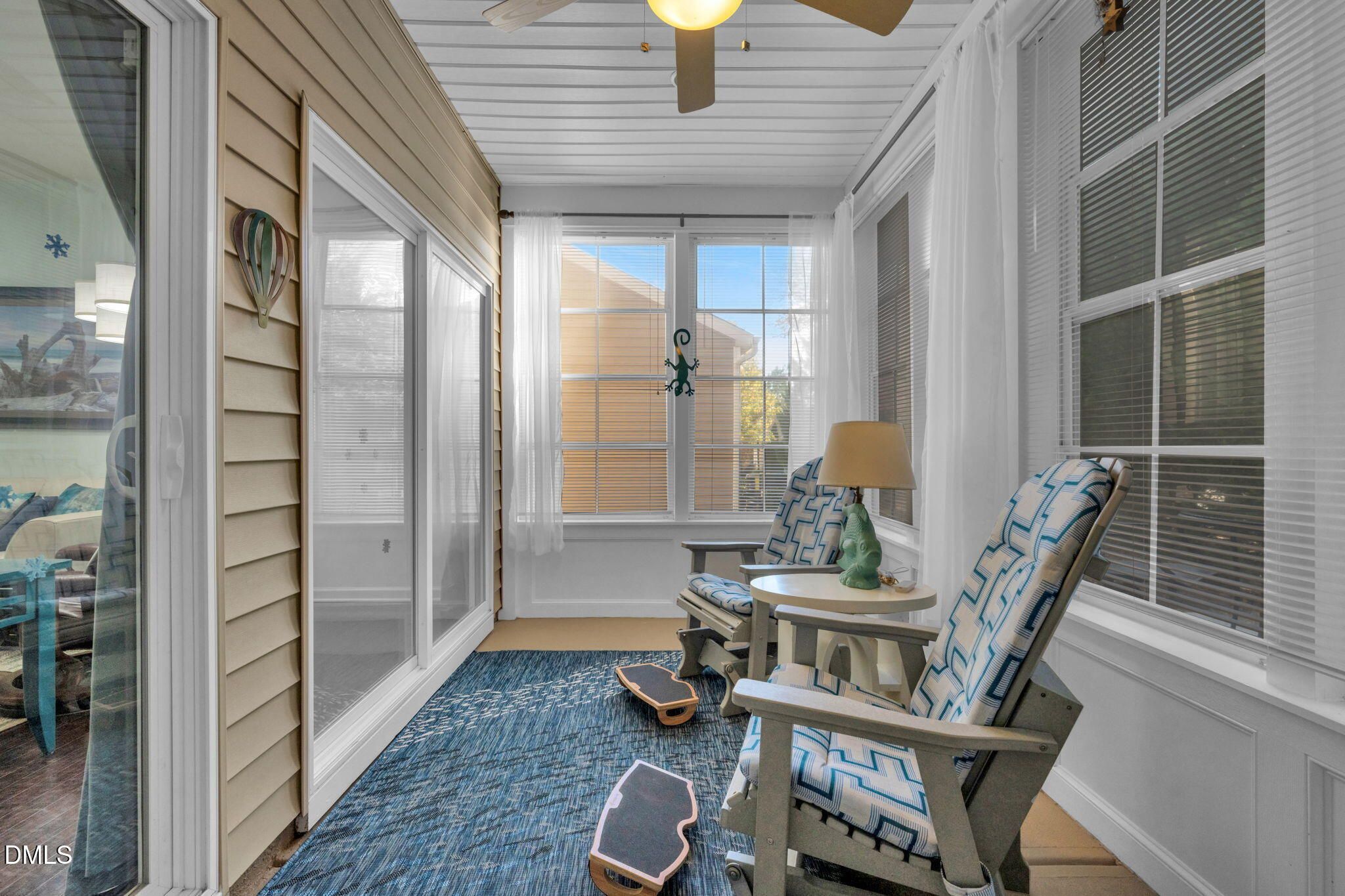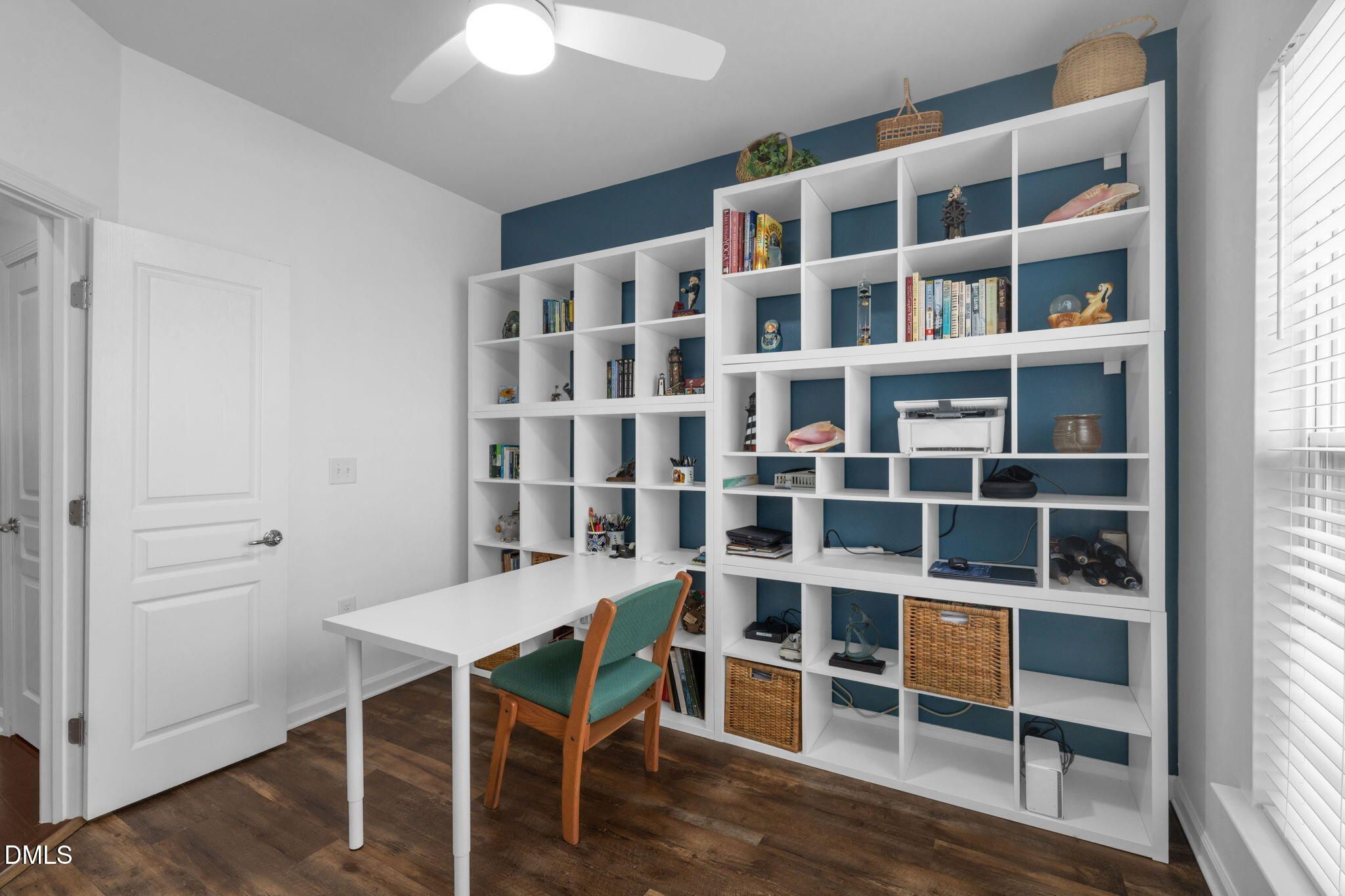 Pretty meets practical in this lovely Gray Myst floor plan with thoughtful improvements! The utility of the kitchen has been greatly enhanced to include extra cabinetry and builtins, an additional pantry, slider cabinet drawers and under cabinet lighting. Pleasant breakfast nook with lots of windows, granite counters, & newer garbage disposal. The deep walk-in closet off of the living room features tons of storage as well as in the extra-insulated attic accessed by pull-down stairs. The guest bedroom showcases a queen Murphy Bed that allows for flexibility of use of the room and the other secondary bedroom/office has a wall of shelving and desk area. The living/dining combo transitions easily to the 3-season room with EZ Breeze windows. Hardwood and LVP flooring throughout (no carpet). The primary bedroom with walk-in closet (shelving will stay) and private bath features triple windows with a pretty view of the back yard. All appliances convey as well as the garage workbench. Located in west Cary's premier 55+ active adult community with top notch amenities including indoor/outdoor pools, pickle ball, tennis, gym, pocket parks, access to trails, etc.