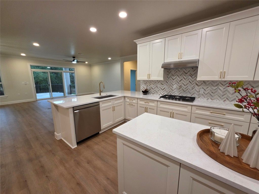 This beautifully fully renovated home features a Devaca floor plan that elevates both style and function. Set on a quiet street with one of the most exceptional greenbelts with NE exposure for shaded afternoons. This Sun City gem blends thoughtful design with high-end finishes throughout. Step inside to an all-new open-concept layout featuring a versatile office/bedroom combo and an exceptionally large custom storage/pantry closet. The brand-new designer kitchen features custom cabinetry, quartz countertops, a striking backsplash, a gas cooktop with a vent hood, stainless steel appliances, and upgraded plumbing and lighting fixtures. The home continues to shine with new luxury vinyl plank flooring, updated plugs and switches, new recessed lighting, ceiling fans, and fresh designer paint on all walls, doors, and trim. Both bathrooms have been fully transformed. The primary suite offers new cabinetry, quartz counters, custom tile and glasswork, and a curbless walk-in shower. The secondary bath mirrors the same elevated design, with all-new finishes and fixtures. Major exterior improvements add long-term value, including a new roof (Sept 2025), new gutters, freshly painted porch railings, repaired and calibrated irrigation system, new exterior light fixtures and fans, 12 new low-e glass window replacements (removing grids and maximizing views), professionally cleaned stonework, and a new garage door opener. This home delivers the rare combination of modern luxury, timeless comfort, and Sun City’s premier lifestyle. Move-in ready and beautifully renovated–a must-see.