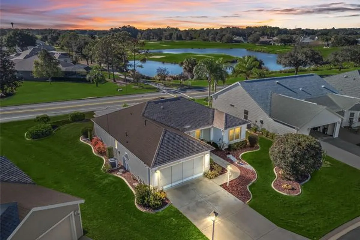 Stunning Custom 2/2 + Den Concrete Block and Stucco Carolina III/Sun Kissed model with a 2 Car Garage, Golf Course, and Pond View in the sought after location of the Village on Glenbrook, conveniently situation minutes from Lake Sumter Landing, and Spanish Springs Town Square, where you can enjoy nightly Entertainment 365 days a year! BOND PAID! This Exceptional home offers a Charming 16 x 6 Covered Front Porch, an Open and Split Floor plan, Vaulted ceilings, Whole House Water Softener, a Den with Archway entrance off the Dining area, and a Glass Enclosed Lanai. Upon entering this lovely home, you are greeted by the Living and Dining area combination featuring Vaulted ceilings, and Gorgeous Newer Luxury Vinyl Plank flooring! The Open Concept Floor Plan creates a Spacious Gathering area, Perfect for Entertaining Family and Friends! The Dining area flows seamlessly through sliding doors to the Glass Enclosed Lanai adding a Fantastic Additional Living Space flooded with Natural Light, and accesses the nice size Pergola Covered Back Patio, Enhancing the Outdoor Living Experience! The Open Kitchen showcases Granite countertops, Cabinets with Pullouts, Stainless appliances, New Dishwasher 2025, Refrigerator & Stove 2021, Pantry closet, GAS Hook Up Available for Range, and a Generous Breakfast Bar! The Split Floor plan offers Maximum Privacy for both the Owners and their Guest, with the Primary Suite commanding one side of the home, while the guest bedroom, Den, and bathroom are located on the opposite side of the home. The Luxurious Primary suite offers a Large Walk in Closet, and an En Suite bathroom. The En Suite bathroom features a New Marble Vanity, and a New Walk in Shower. The 22 x 20 Two Car Garage provides plenty of room for storage! Roof 2018 by Sacks Roofing, HVAC 2018 by Munns, This Charming Sun Kissed model is conveniently located near the Savannah Sports Pool and Regional Recreation Center, Hilltop Executive Golf Course, Glenview Country Club, El Santiago Executive Golf Course, and various recreational facilities, including Adult and Family Pools. In addition, you'll find plenty of Shopping Centers, Banking, Restaurants, The Villages Hospital, and the VA Center all just minutes away!