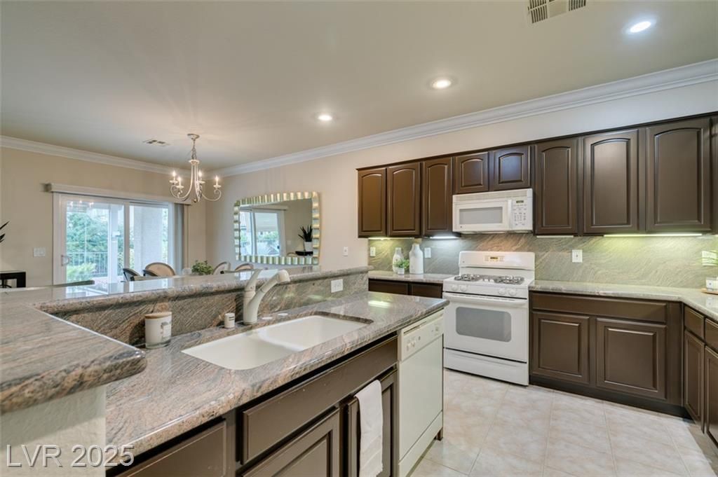 This home has it all! Welcome to this charming home featuring 2 spacious bedrooms , a versatile den, and 2 full baths. 1,715 sq. ft. Featuring tile and hardwood floors, granite counters, granite back splash, upgraded cabinets, and an island with a raised breakfast bar. Crown moldings add an elegant touch throughout. Additional features include garage built-in cabinets & water softener. The gorgeous backyard is fully fenced in with a large covered patio perfect for relaxing and enjoying the mountain views. Private lot with no neighbor on one side and direct access to walking paths.