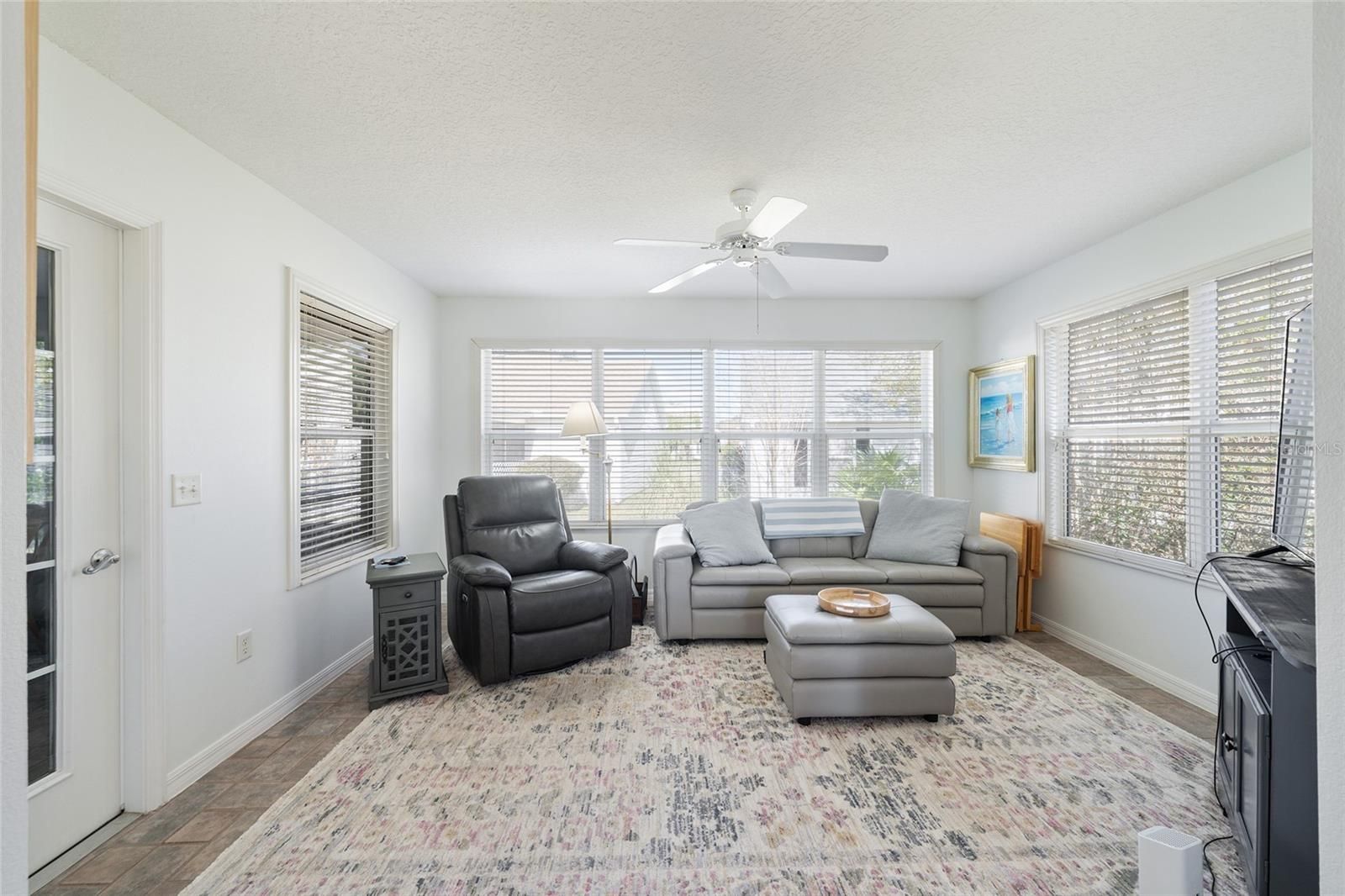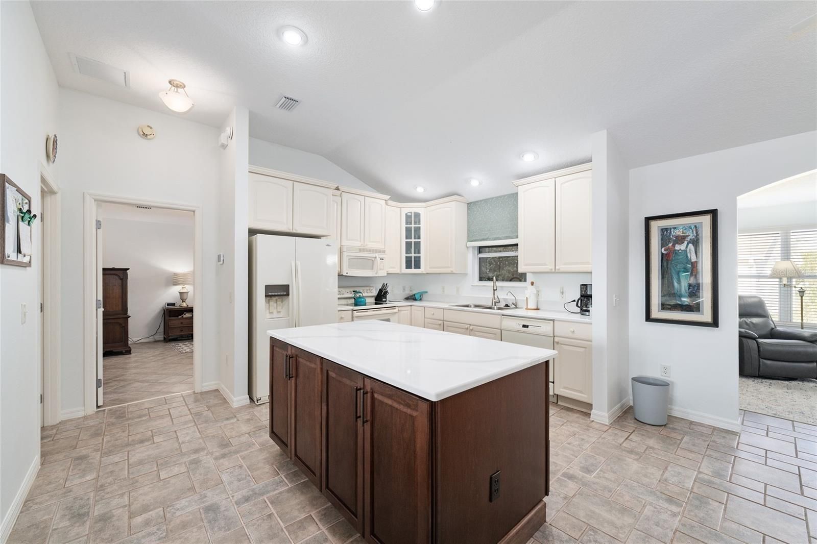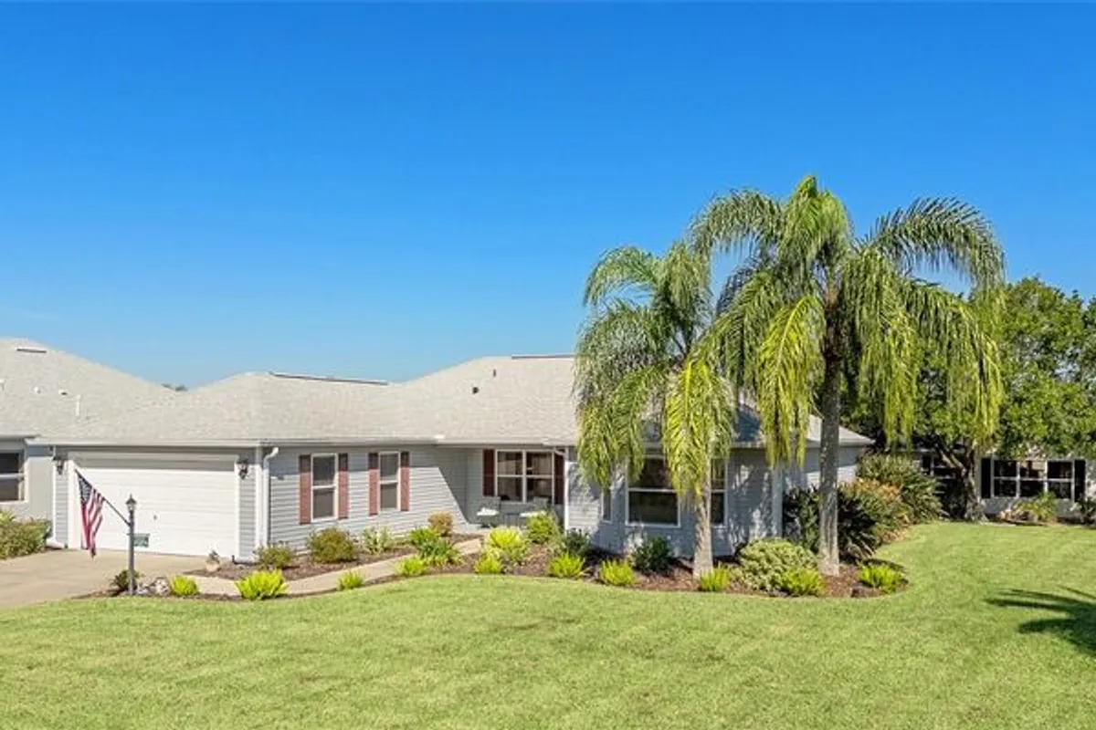 BOND PAID! This Expanded and Updated Designer Banyan Model is offered TURNKEY with the exception of artwork and personal items. Expanded 6 feet in the garage, 4 feet on the guest side of the home, 3 feet on the Florida Room and Lanai, this home has many upgrades including 2022 ROOF, 2022 WATER HEATER. 2024 HVAC, 2023/2024 FURNITURE UPGRADES, 2024 KITCHEN UPGRADE and 2024 POWER SCREENS ON LANAI. Floors are tiled throughout with exception of the 2 guest rooms, which are carpeted. The split bedroom plan has the PRIMARY SUITE with lighted ceiling fan, WALK IN CLOSET and EN SUITE BATH with 2022 CABINETS and CORIAN COUNTERTOP on one side of the home and on the opposite side of the home, the GUEST WING offers TWO AMPLE GUEST ROOMS, one with BAY WINDOW, BUILT IN MURPHY BED / STORAGE, lighted ceiling fan, WALK IN CLOSET and BUILT IN DESK WITH OVERHEAD STORAGE. The other guest room has QUEEN BED and FURNITURE SET, lighted ceiling fan and WALK IN CLOSET. A JACK AND JILL BATH connects to each guest room and has STORAGE TOWERS on either side of a WIDE VANITY with TWO SINKS, plus a JETTED TUB WITH SHOWER. The Kitchen has 42" SOFT WHITE CABINETS with PULL OUT SHELVES, new SINK and QUARTZ COUNTER TOPS accented by a NEW CUSTOM KITCHEN ISLAND in RICH BROWN FINISH with QUARTZ TOP. The kitchen is open to both the DINING and LIVING AREAS, both of which have NEW FURNISHINGS, including a WALL MOUNTED TELEVISION. At the back of the home, the FAMILY ROOM/DEN also has NEW LEATHER FURNISHINGS and a LARGE SCREEN TV on entertainment stand, ceiling fan, windows on three sides and access to the COVERED SCREENED LANAI, complete with ceiling fan, DINING TABLE / 4 CHAIRS, SOFA and END TABLE plus POWERED PRIVACY SCREENS with REMOTE. The INDOOR LAUNDRY ROOM is between the kitchen and GARAGE and includes additional storage. The stretched garage houses WORK BENCH, storage cabinets and a whole house water filtration system and reverse osmosis drinking water system. The large corner lot has room expansion, pool or patio. Great location -2/10ths of a mile to GLENVIEW COUNTRY CLUB'S RESTAURANT & Bar, golf and pool, which is literally AT THE END OF THE STREET! Quick and easy to get to SAVANNAH CENTER with great ticketed events and NANCY LOPEZ COUNTRY CLUB with 2 RESTAURANTS. Also, very near two town squares - SPANISH SPRINGS and LAKE SUMTER LANDING, both with many restaurants and retailers plus LIVE NIGHTLY ENTERTAINMENT! Great opton for personal use or income property!