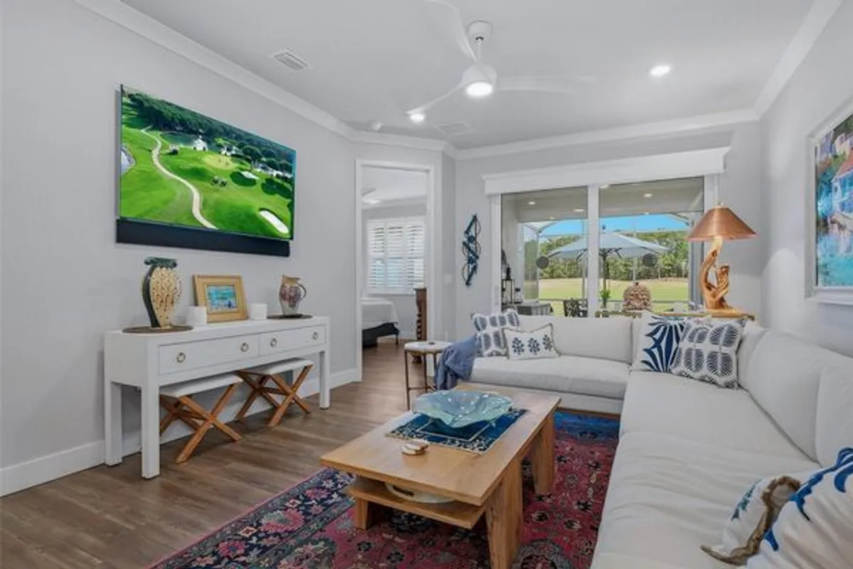 Better-than-new 4-bedroom, 3.5-bath Isles at Venetian Bay NSB townhome with golf course views! Built in 2023, this thoughtfully designed floor plan is ideal for large or multigenerational living, featuring two en-suite bedrooms that offer exceptional flexibility. The extensive list of custom upgrades include luxury vinyl flooring throughout, quartz countertops with mother-of-pearl kitchen backsplash, a 22kw whole-house generator, crown molding, plantation shutters, electric window shades on sliders, designer lighting and designer plumbing fixtures and stylish ceiling fans, and additional custom lighting and custom shelving in all closets and pantry. The chef’s kitchen is equipped with GE Café induction range, GE Café microwave/convection oven, and GE Profile refrigerator and there’s a wet bar with mini-fridge for effortless entertaining and a spare full-size refrigerator in the pristine garage with epoxy-finished floor and electric car charger. Washer/dryer is conveniently located upstairs, but there are hookups in the garage as well. Enjoy Florida living with an extended screened porch and paver patio overlooking the golf course. Close off the lanai and the upstairs balcony with electric roll down storm shutters for added protection. Isles residents enjoy exclusive access to a sparkling private pool, along with tennis, pickleball, and walking and biking trails throughout the Venetian Bay community. The level of customization and attention to detail in this home truly sets it apart—this home should not be missed.