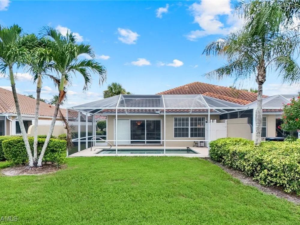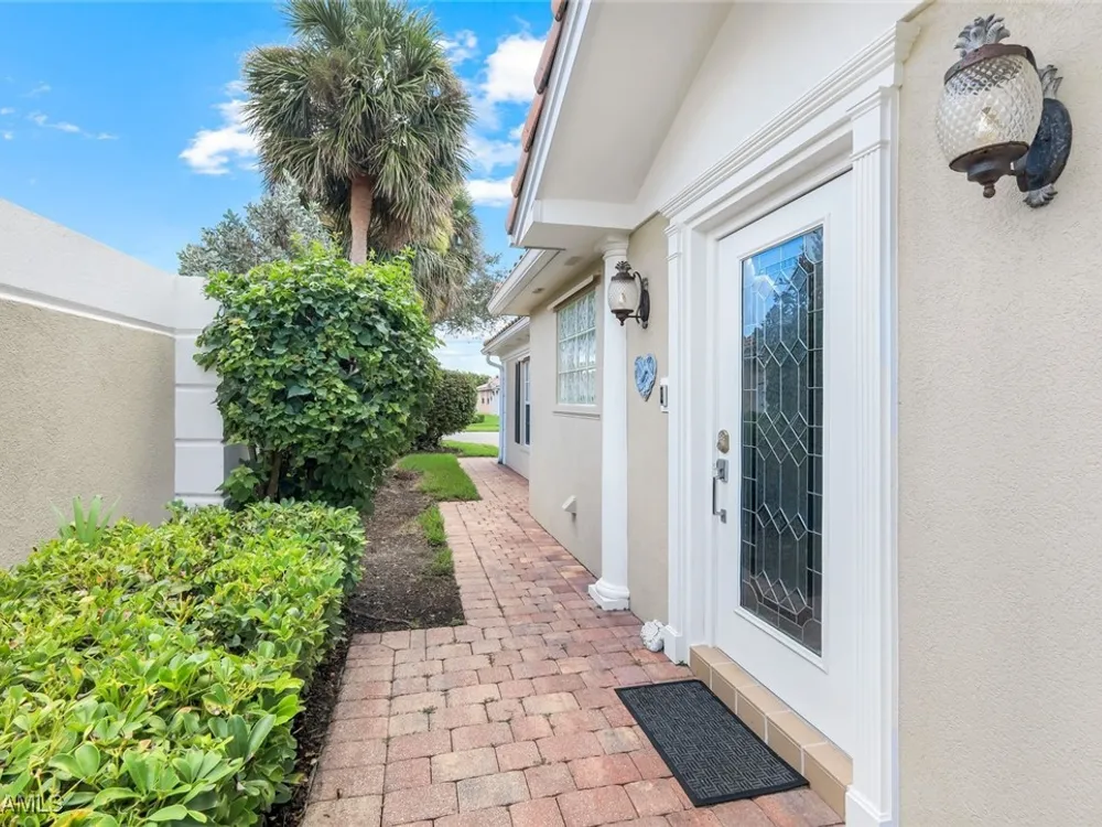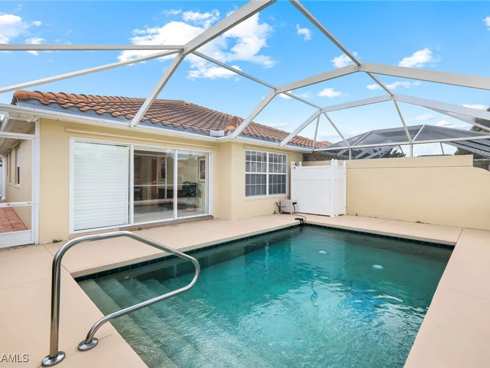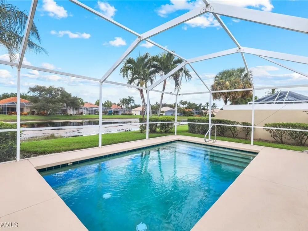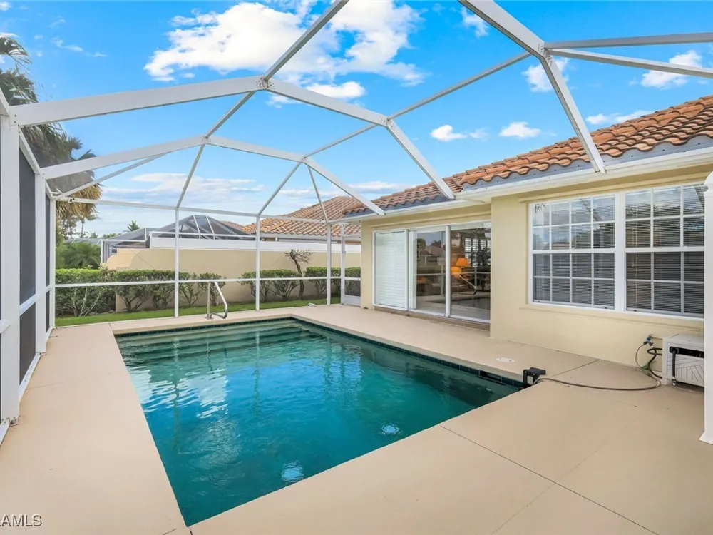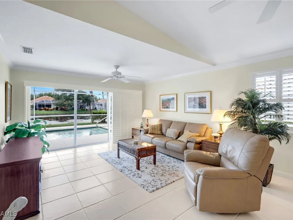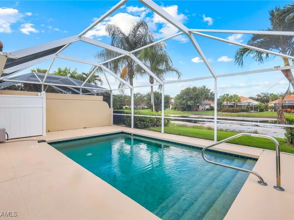 Welcome to 3077 Futuna Lane, an exquisite 2-bedroom lakefront pool Villa with extended living area and newer roof in the coveted Island Walk Community. This expansive floor plan boasts 2 bedrooms and 2 bathrooms, seamlessly blending contemporary design with vaulted ceilings and lots of windows that flood the interior with natural light, creating a warm and inviting atmosphere. Featuring an open concept kitchen with a spacious Granite Island and stainless appliances perfect for entertaining. The Great Room has wood floors and a built in wall unit. The living area also adorns Plantation shutters. Adjacent, the casual dining area overlooks your private heated pool and breathtaking water vistas, making every meal a scenic experience. Retreat to the primary suite, a sanctuary of comfort featuring an en-suite bathroom and incredible lake view. A generous guest suite with private bath is ideal for family or friends. Located in one of Naples' most sought-after neighborhoods, residents enjoy access to exclusive amenities including a Resort style pool, lap pool, a Towncenter, Tennis, pickleball, bocce, fitness center, Restaurant, Beauty and Nail Salons, Car Wash, Gas Station and Post Office. Close to Naples’ sandy beaches, wonderful shopping, and dining.