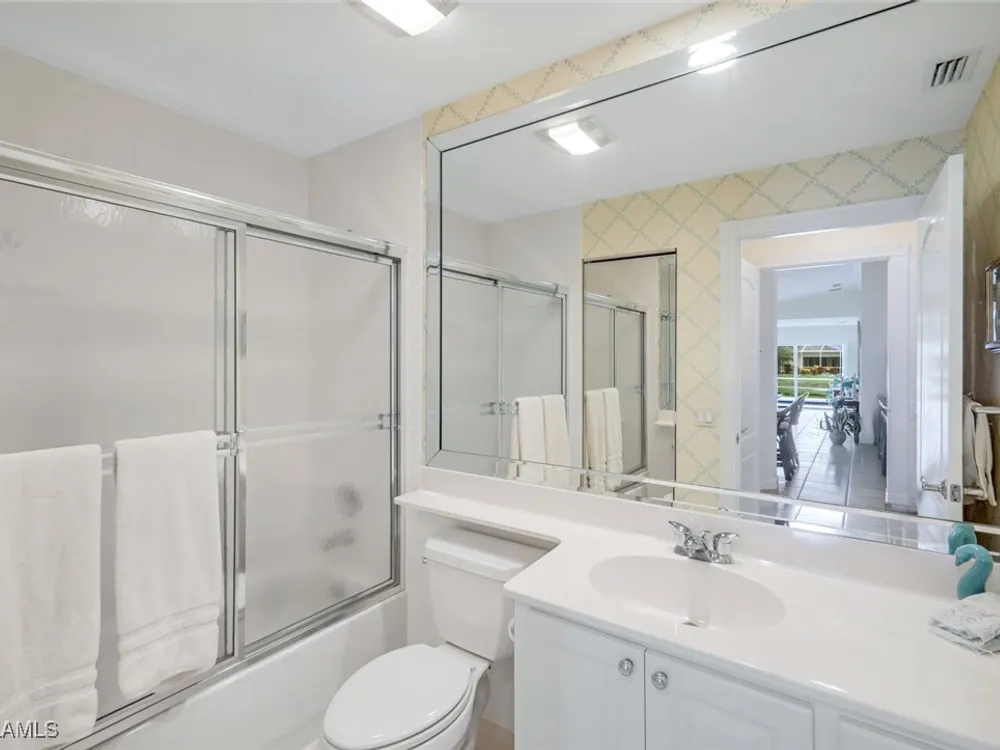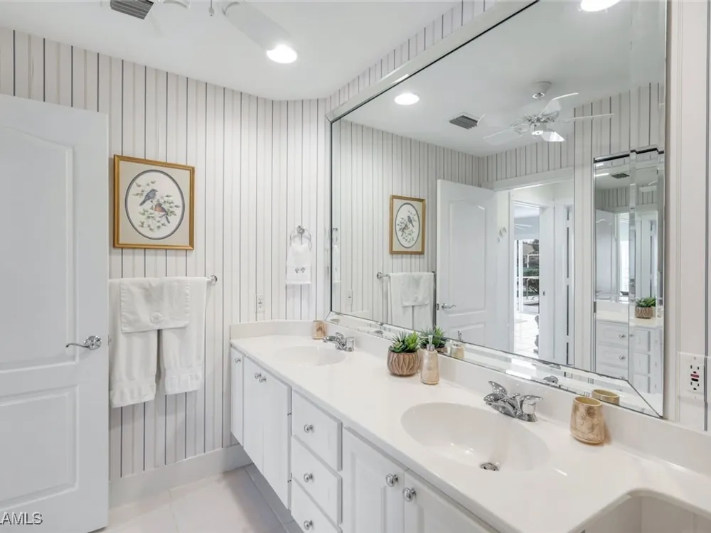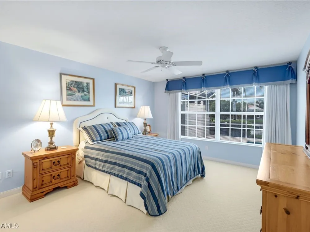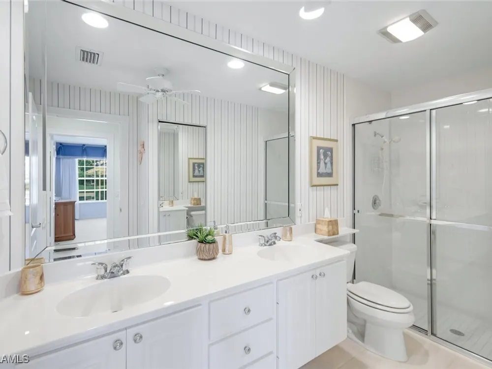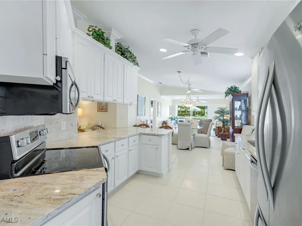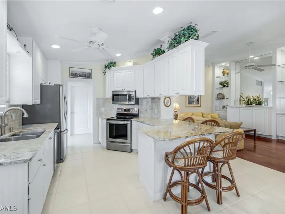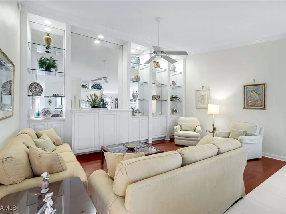 Welcome to 3077 Futuna Lane, an exquisite 2-bedroom lakefront pool Villa with extended living area and newer roof in the coveted Island Walk Community. This expansive floor plan boasts 2 bedrooms and 2 bathrooms, seamlessly blending contemporary design with vaulted ceilings and lots of windows that flood the interior with natural light, creating a warm and inviting atmosphere. Featuring an open concept kitchen with a spacious Granite Island and stainless appliances perfect for entertaining. The Great Room has wood floors and a built in wall unit. The living area also adorns Plantation shutters. Adjacent, the casual dining area overlooks your private heated pool and breathtaking water vistas, making every meal a scenic experience. Retreat to the primary suite, a sanctuary of comfort featuring an en-suite bathroom and incredible lake view. A generous guest suite with private bath is ideal for family or friends. Located in one of Naples' most sought-after neighborhoods, residents enjoy access to exclusive amenities including a Resort style pool, lap pool, a Towncenter, Tennis, pickleball, bocce, fitness center, Restaurant, Beauty and Nail Salons, Car Wash, Gas Station and Post Office. Close to Naples’ sandy beaches, wonderful shopping, and dining.