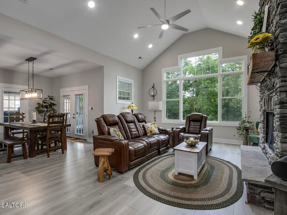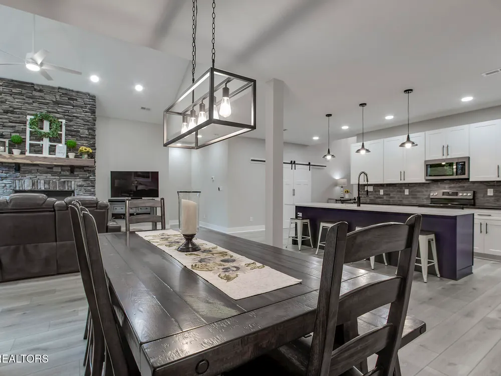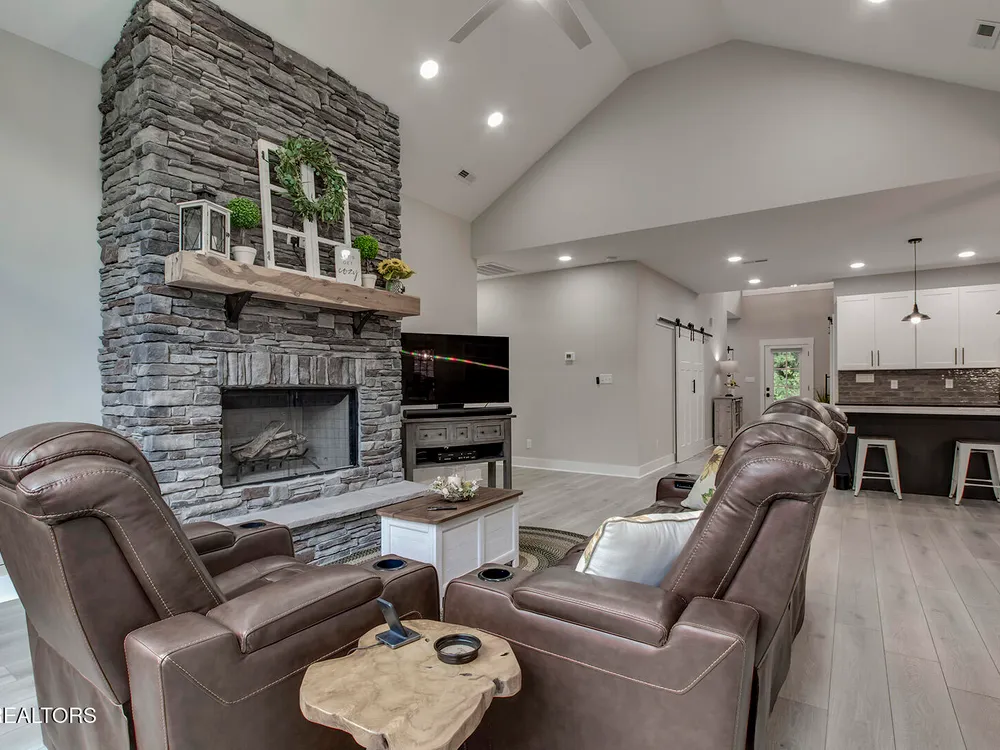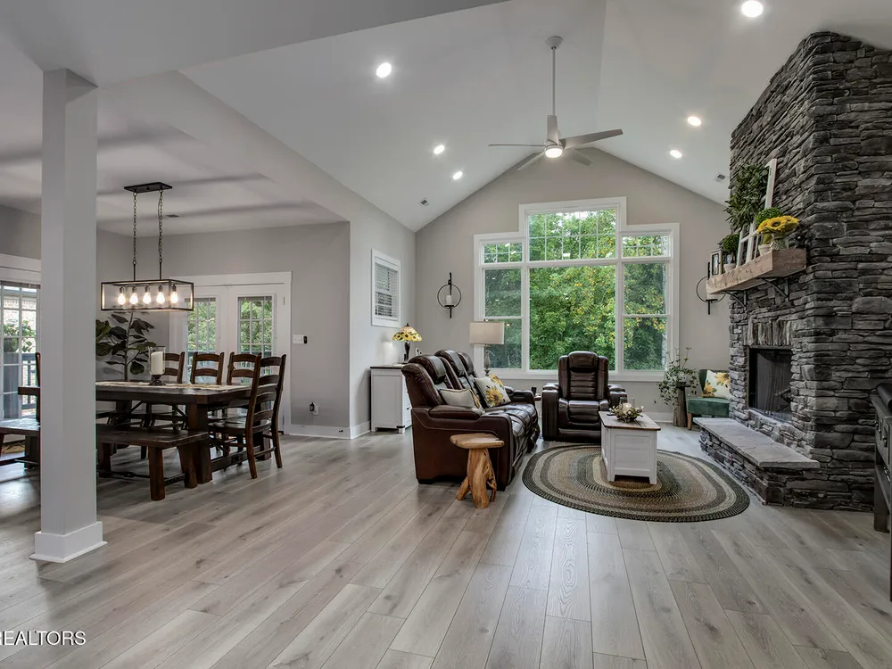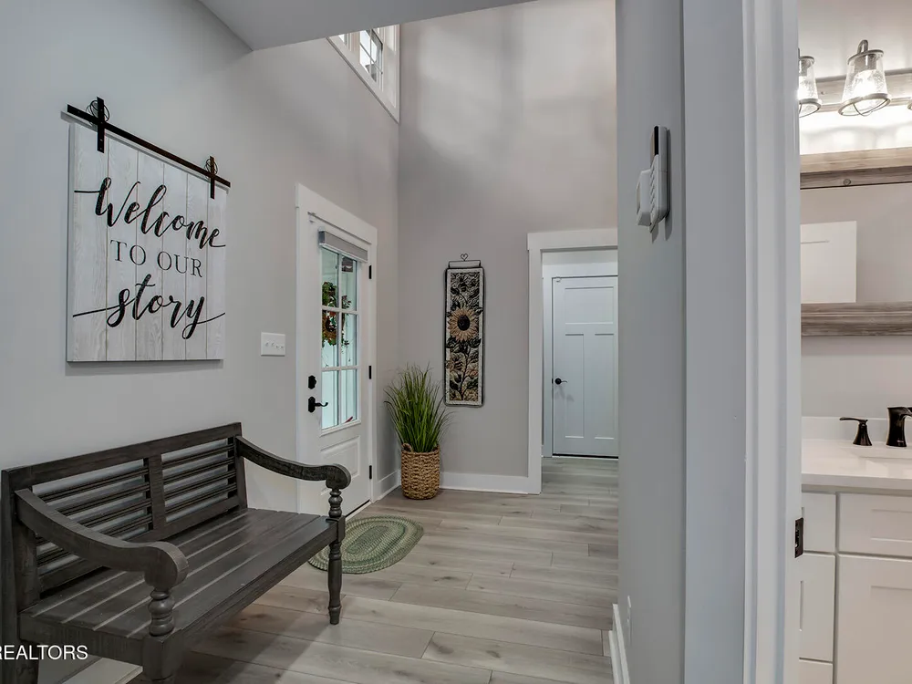 - Better Than New! The stunning covered front porch welcomes you to this sophisticated 1 1/2 level home with an open concept flowing floor plan. Fall in love with the soaring ceilings throughout, grand foyer, spacious great room with stone wood burning fireplace, and abundant windows. Chef's kitchen offers stainless steel appliances, quartz countertops, pantry, 42 inch cabinets and soft close drawers, large spacious island perfect for entertaining and opens to the dining area flooded with natural light. The luxurious owner's suite offers a walk-in closet and boasts an en-suite spa-like bathroom with a large custom free standing tub, glass walk-in shower and private water closet. This split bedroom floor plan for privacy adds spacious guest rooms and generous closets. The laundry room off the garage with room to add storage. The custom quality construction and fine finishes throughout the home include light Luxury Vinyl floors and Joanna Gaines style light fixtures. The bonus room is the perfect spot for an office, exercise or a 4th bedroom. The covered wrap around deck with room for dining and seating to relax on. The backyard is the perfect retreat lined by mature trees. Don't miss the concrete pad storage area in the crawl space and the oversized 3 car tandem garage. In this home, Dreams really do come true.
