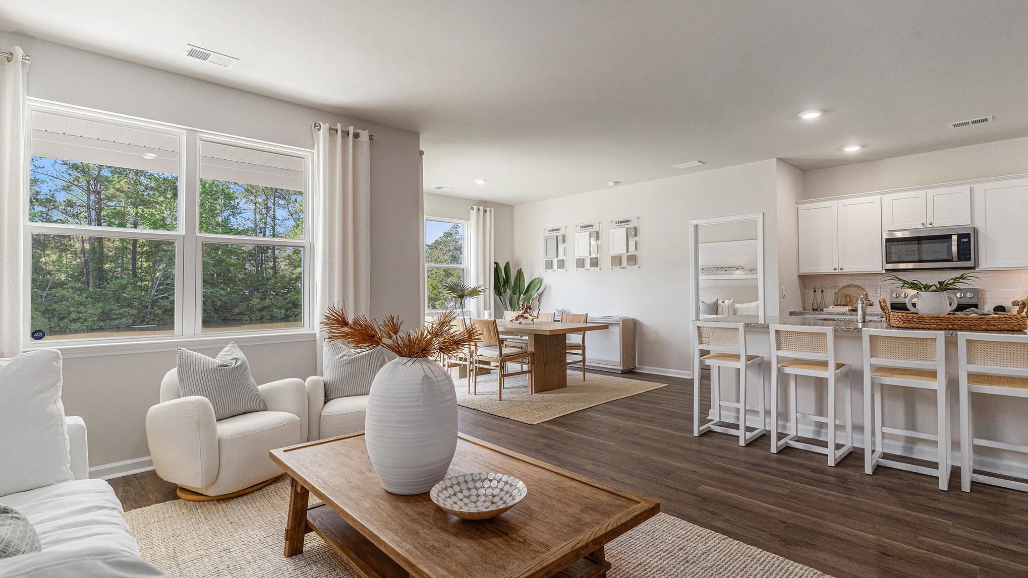 This thoughtfully designed one level home is one of our most popular floor plans! With an open concept living room, dining room and kitchen, this home is bright, spacious, and designed for entertaining guest or comfortably interacting with family. The kitchen features granite countertops, a tile backsplash, 36" cabinets, a spacious pantry, stainless steel appliances including a refrigerator, and island with breakfast bar! Your primary suite awaits off the back of the home with a spacious walk-in closet and master bath with double sinks, a linen closet and 5' shower. Two secondary bedrooms are at the front of the home providing separation from the primary suite. Enjoy the coastal air from the back porch as you wind down in the evening! This is America's Smart Home! Each of our homes comes with an industry leading smart home technology package that will allow you to control the thermostat, front door light and lock, and video doorbell from your smartphone. *Photos are of a similar Aria home. Pictures, photographs, colors, features, and sizes are for illustration purposes only and will vary from the homes as built. Home and community information, including pricing, included features, terms, availability and amenities, are subject to change and prior sale at any time without notice or obligation. Square footage dimensions are approximate. Equal housing opportunity builder.