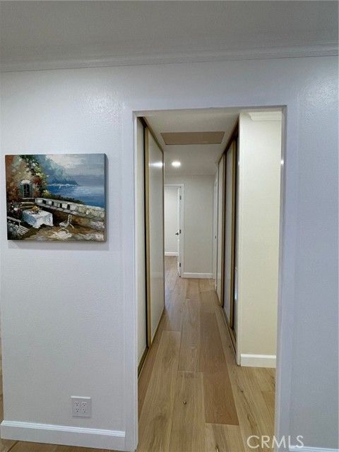 Stunning, newly remodeled Ventura-model single-level home! Featuring a designer kitchen with high quality natural stone countertops and brand-new GE refrigerator and stove, this home offers a spacious living and dining area with an excellent floor plan. The bedrooms and bathrooms have all been freshly remodeled. Additional highlights include central heating and air conditioning, a full-size new washer and dryer in the hallway closet, dual-pane windows, updated interior doors, smooth ceilings, crown molding, recessed lighting, and four skylights located in the bathrooms, kitchen, and dining room. Beautiful engineered hardwood floors run throughout the home. The property also features a newly added 161-sf enclosed patio with a skylight, plus a small private yard—perfect for relaxing at sunset or enjoying your morning coffee as the sun rises. Laguna Woods Village offers exceptional amenities, including 9 hole Executive par 3 & 27 hole championship golf courses, 7 clubhouses, 5 Swimming pools, tennis, pickleball, ping pong, 2 fitness centers horseback riding, sport courts, fare free bus service, equestrian center, woodshop and more—everything you’d expect from a top senior community. HOA fee includes water, sewer, trash and basic cable ( 150+ Channels) This home blends stylish updates with an active, resort-style lifestyle in a prime location near the coast. Start a new chapter in your beautiful new home today!
