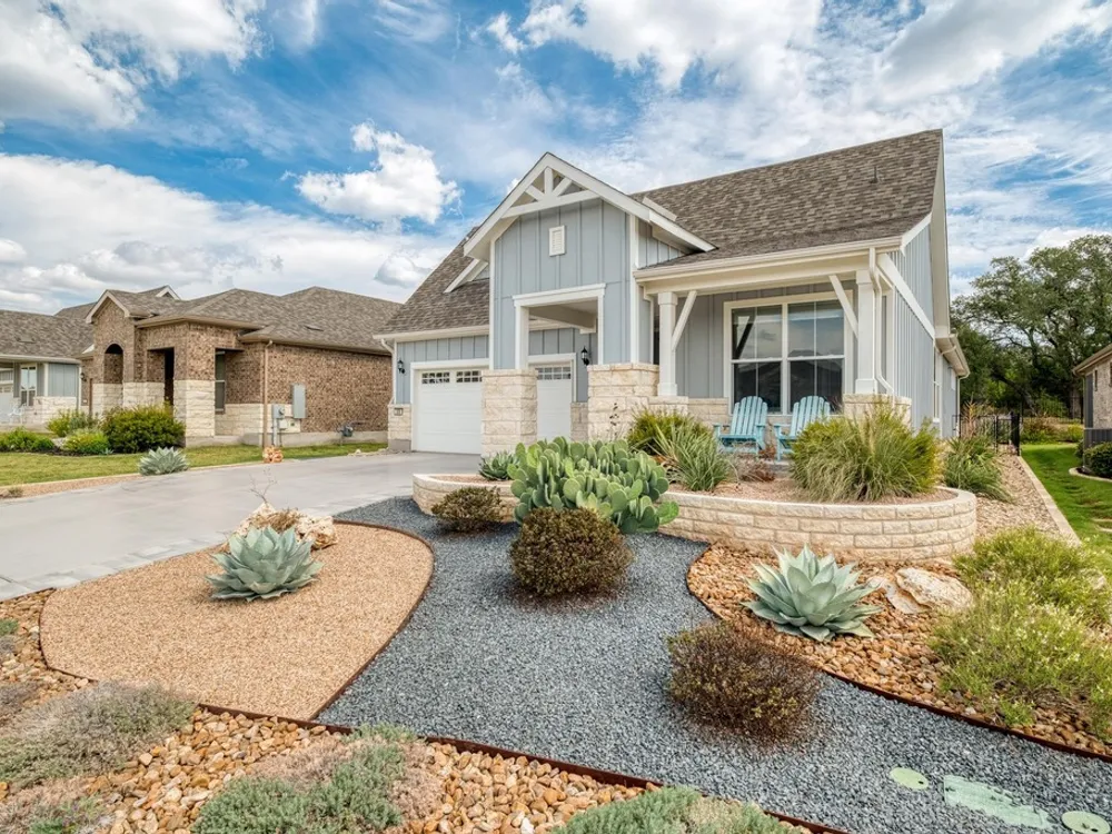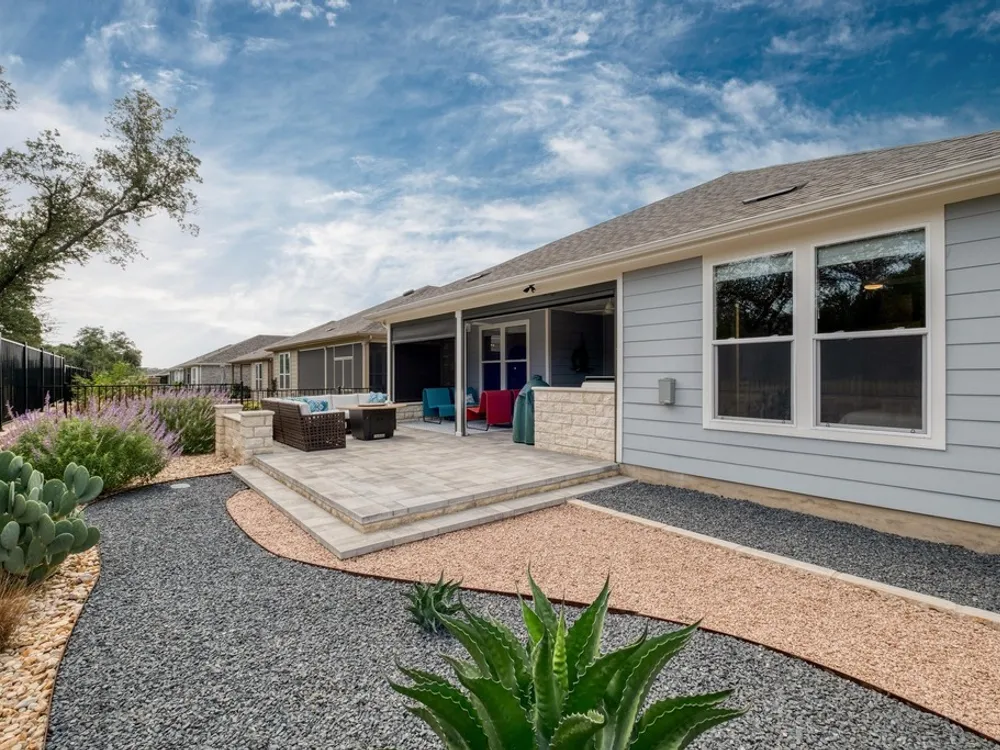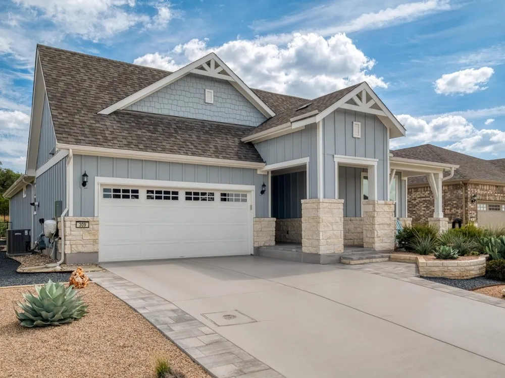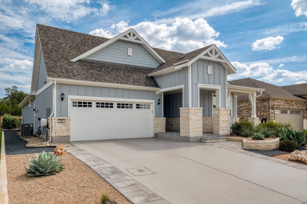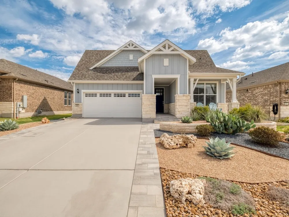 Immaculate single-owner Sun City home filled with premium upgrades and a scenic greenbelt backdrop. Hill Country elevation with board & batten siding and limestone posts. Full front, back, and side hardscaping with drip irrigation provides beauty and low-maintenance living. The interior features wood-look tile flooring, crown molding, and Hunter Douglas window treatments. Convenience features include a floor outlet in the gathering room and pre-wired audio in the gathering room, primary bedroom, and patio plus overhead storage racks and durable tile flooring in the garage. The upgraded kitchen boasts maple cabinets, pull-out cabinetry, soft-close doors, quartz counters, under-cabinet lighting. Top-tier KitchenAid appliances including double ovens, microwave/oven combo, and a 5-burner gas cooktop with vented hood. Two bedrooms plus a flex space ideal for an office or third bedroom. The primary suite includes two walk-in closets and a spacious walk-in shower. Enjoy the outdoors through an 8’ sliding door that leads to a covered patio with electric privacy screens and an outdoor kitchen. Side fencing and limestone borders are solely owned by this property. Meticulously maintained and move-in ready!