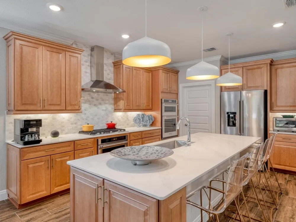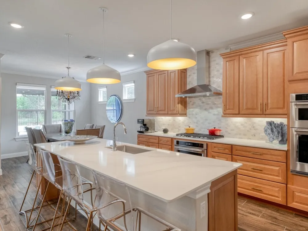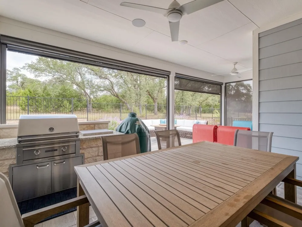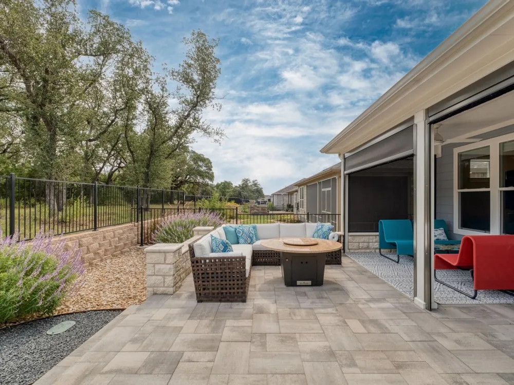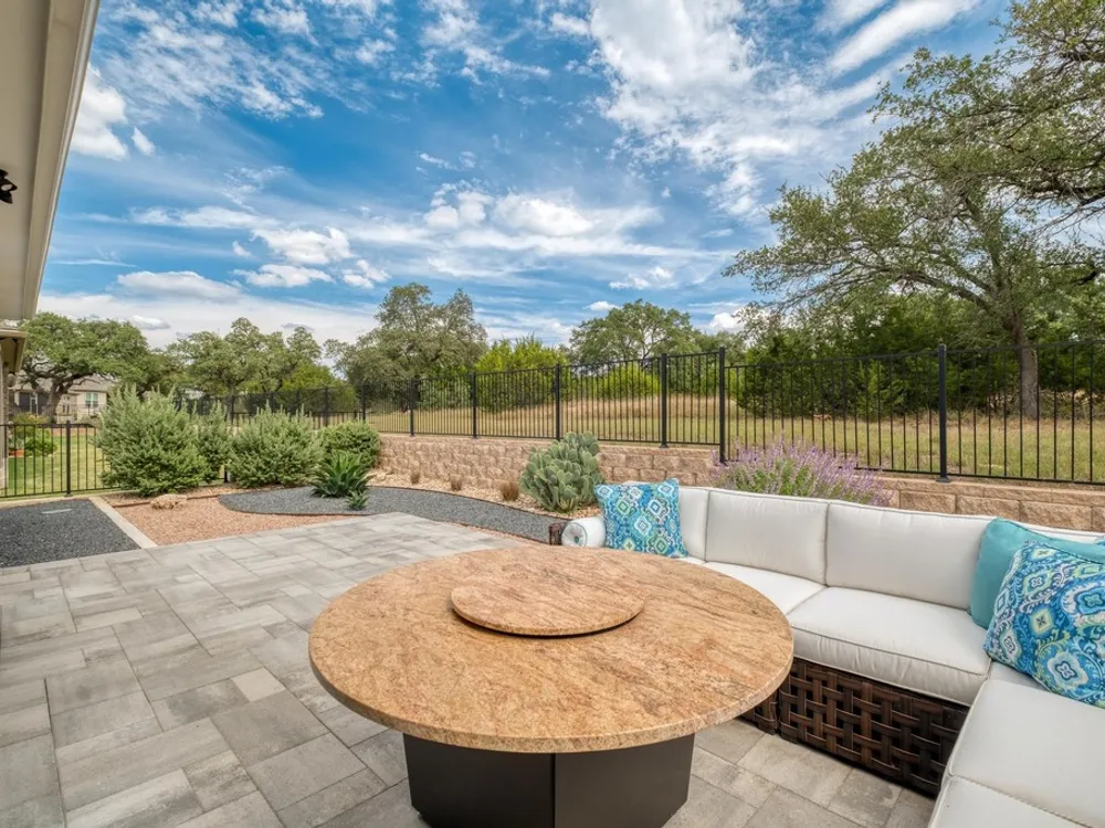 Immaculate single-owner Sun City home filled with premium upgrades and a scenic greenbelt backdrop. Hill Country elevation with board & batten siding and limestone posts. Full front, back, and side hardscaping with drip irrigation provides beauty and low-maintenance living. The interior features wood-look tile flooring, crown molding, and Hunter Douglas window treatments. Convenience features include a floor outlet in the gathering room and pre-wired audio in the gathering room, primary bedroom, and patio plus overhead storage racks and durable tile flooring in the garage. The upgraded kitchen boasts maple cabinets, pull-out cabinetry, soft-close doors, quartz counters, under-cabinet lighting. Top-tier KitchenAid appliances including double ovens, microwave/oven combo, and a 5-burner gas cooktop with vented hood. Two bedrooms plus a flex space ideal for an office or third bedroom. The primary suite includes two walk-in closets and a spacious walk-in shower. Enjoy the outdoors through an 8’ sliding door that leads to a covered patio with electric privacy screens and an outdoor kitchen. Side fencing and limestone borders are solely owned by this property. Meticulously maintained and move-in ready!
