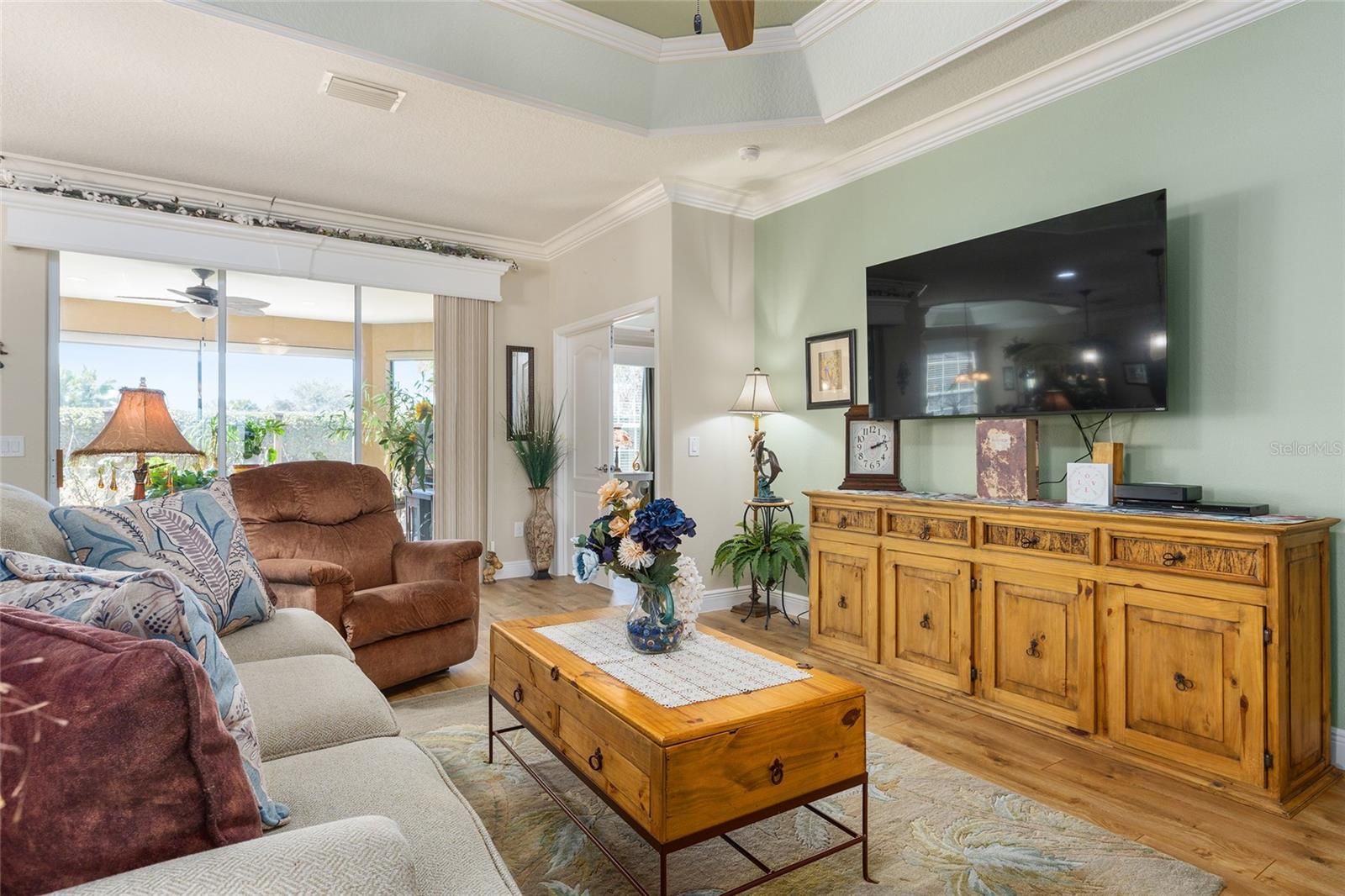 BOND PAID on this beautifully maintained BLOCK/STUCCO designer home in The Village of SANIBEL, one of the most desirable areas in The Villages! The ORIGINAL OWNERS of this home have replaced the systems most important to you: HVAC (2025), HWH (2026), ROOF (2026, scheduled before closing). The STUNNING 3-bedroom, 2-bath MODIFIED BRIDGEPORT MODEL has no back neighbors and offers a perfect blend of style and comfort featuring TRAY CEILINGS, CROWN MOLDING (2021) and professionally painted interior/exterior. Luxury vinyl plank flooring (2024) flows throughout most of the home including in the spacious PRIMARY SUITE which features 2 walk-in closets, a tray ceiling and bay window. The Primary Bathroom offers a tiled ROMAN SHOWER and dual vanities. The 2nd Bedroom fits a King-sized bed and has its own walk-in closet. The expansive KITCHEN has an abundance of cabinets and DOUBLE OVENS, along with a built-in DESK. The lush hedge landscaping creates a private feel with NO BACK NEIGHBORS. The 2-CAR GARAGE plus GOLF CART GARAGE has two separate work areas and a pull-down attic. And every day you are welcomed home with a painted driveway and a compass rose. CALL NOW for your private showing, the location can’t be beat - just one minute from Morse Blvd., 4 Championship Golf Courses close by, between Lake Sumter Landing and Brownwood Square, multiple recreation centers, Bonifay Country Club and a quick walk to the Captiva pool. WELCOME HOME!