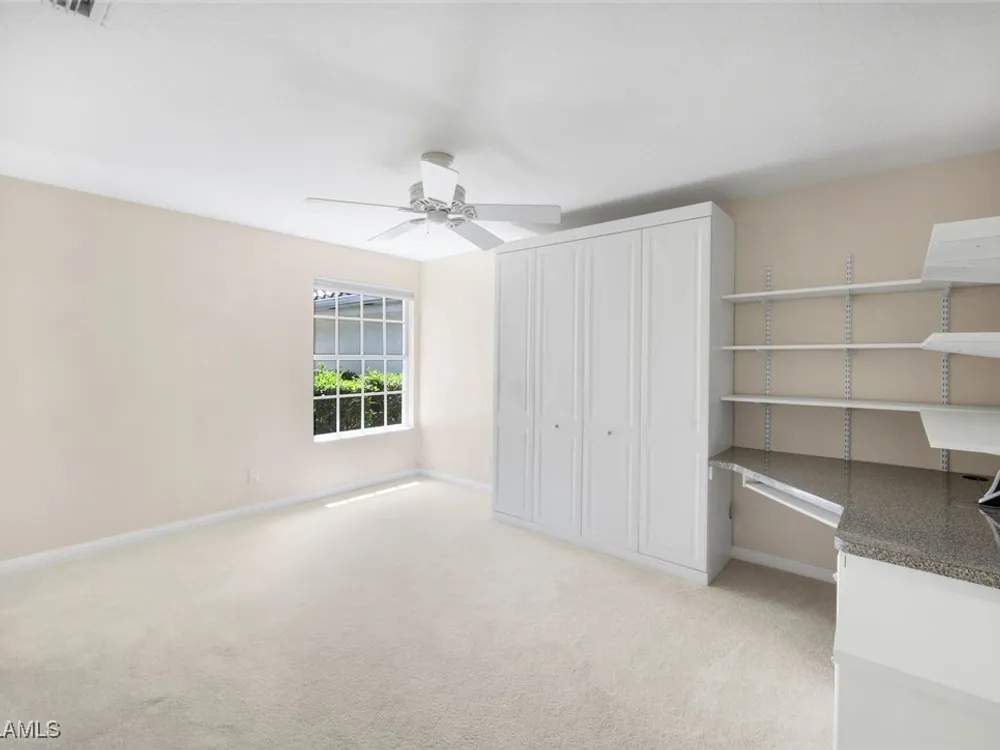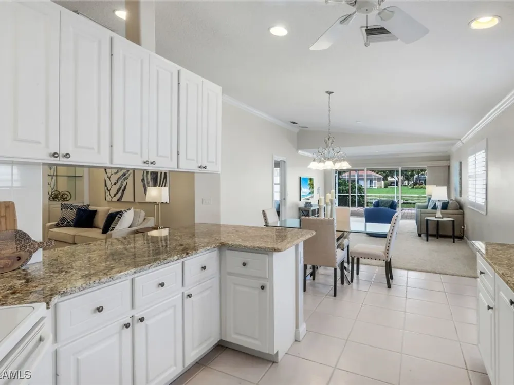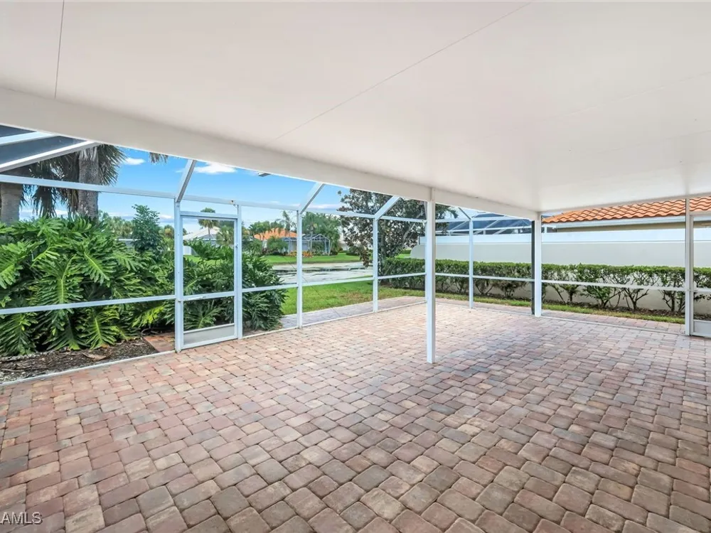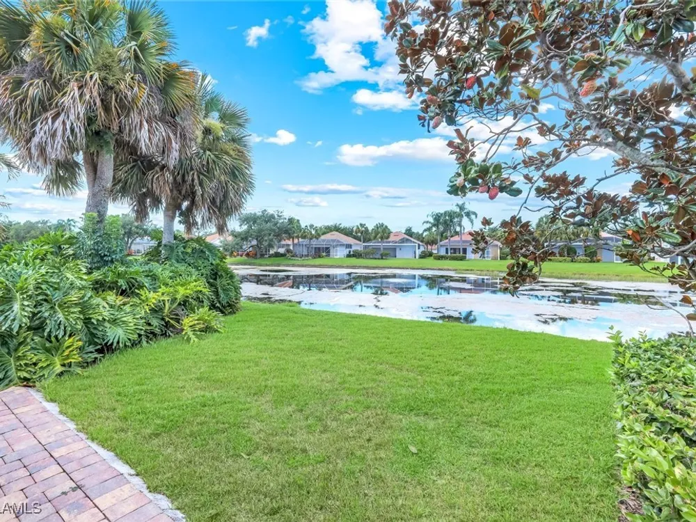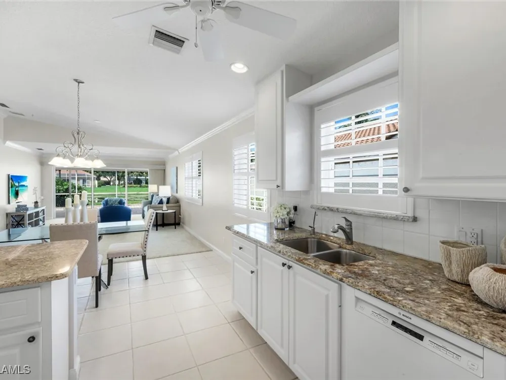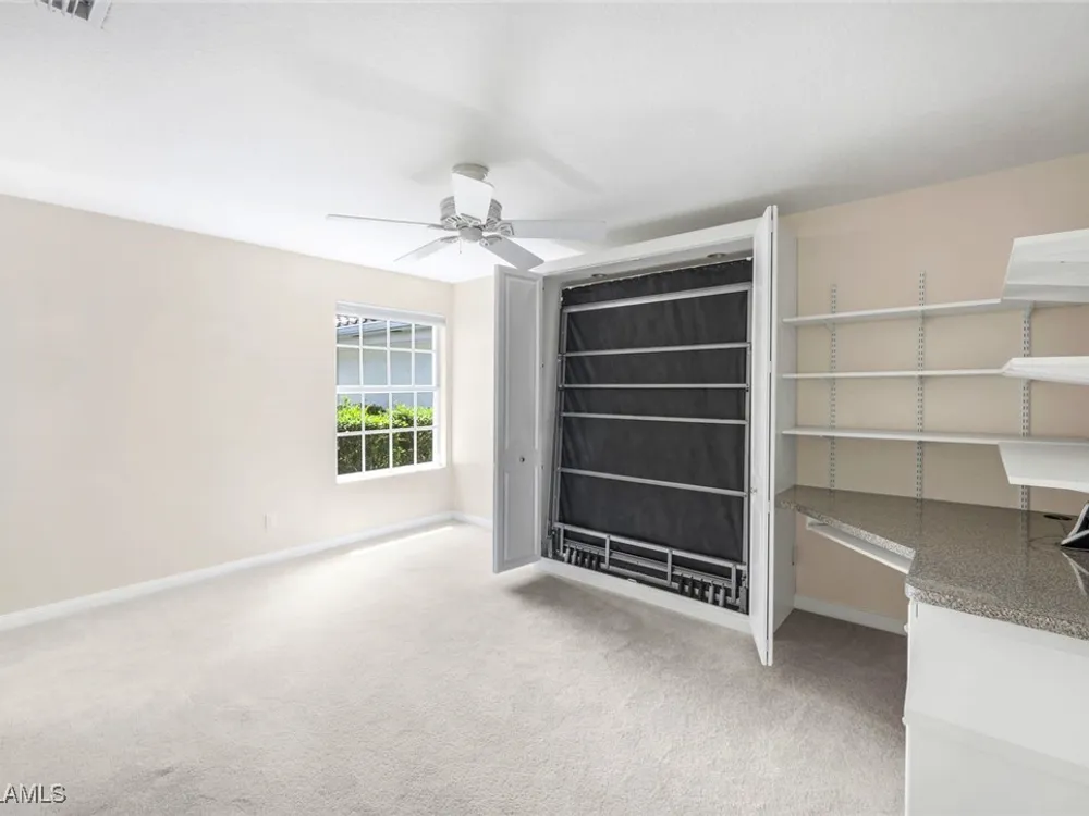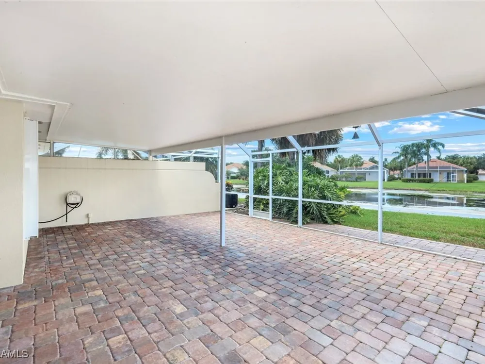 Immaculate Extended Capri Villa with Oversized Lakefront Lanai in Island Walk. This meticulously maintained 2 bedroom plus den, 2 bathroom villa with a 2 car garage is located on a quiet cul-de-sac in the award-winning Island Walk community. A rarely available extended driveway accommodates up to four vehicles, adding both convenience and value. Inside, the home feels bright and welcoming with vaulted ceilings, an open floor plan, and a thoughtful split bedroom layout that balances comfort and privacy. The kitchen is highlighted by granite countertops and ample cabinetry. The primary suite showcases serene lake views and features a spacious walk-in closet, along with a well-appointed bathroom offering dual sinks and a walk-in shower. The versatile guest bedroom includes a murphy bed and desk, making it equally suited for working from home or comfortably hosting overnight visitors. Notable upgrades include a newer A/C, epoxy-finished garage floor, fresh interior paint, wood plantation shutters, and a water filtration system. The home is equipped with both roll-down and accordion storm shutters, providing added protection and peace of mind. The oversized, screened lanai is the true highlight of this home, offering expansive lake views and plenty of space to relax or entertain in a private, tranquil setting. Island Walk is more than a neighborhood, it is a lifestyle. Residents enjoy a guard gated entrance, resort and lap pools, a state-of-the-art fitness center, tennis and pickleball courts, a clubhouse with on-site dining, gas station, car wash, post office, and miles of scenic walking and jogging paths surrounded by lakes and bridges. Perfectly situated in central Naples, this home is just 15 minutes from Vanderbilt Beach, Mercato, shopping, dining, and golf, with easy access to I-75 and only 30 minutes to RSW Airport.