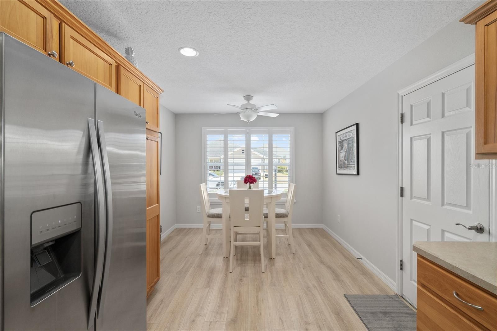 ~2025 ROOF~ ~BUILT 2015~ ~NO HOMES BEHIND~ ~PLANTATION SHUTTERS~ Welcome to this charming WISTERIA model in the desirable Village of PINE RIDGE in The Villages! This beautifully maintained home offers comfort, style, and thoughtful updates in a prime location. Laminate flooring flows throughout the main living areas, creating a warm and cohesive feel. The inviting living room features PLANTATION SHUTTERS, a HIGH VAULTED ceiling, and a ceiling fan, while the adjacent dining room also boasts soaring vaulted ceilings—perfect for both everyday living and entertaining. The kitchen is well-appointed with STAINLESS-STEEL appliances, PLANTATION SHUTTERS, a ceiling fan, and a bright EAT-IN AREA for casual dining. The spacious primary suite includes PLANTATION SHUTTERS, HIGH VAULTED ceilings, and an OVERSIZED WALK-IIN CLOSET. The ensuite bath offers a tiled ROMAN SHOWER, linen closet, and high laminate countertops. 2 comfortable guest bedrooms provide plenty of space for visitors, each featuring PLANTATION SHUTTERS, ceiling fans, and built-in closets. The guest bath includes CERAMIC tile flooring, a tiled tub/shower combination, linen closet, and high laminate countertops. The INSIDE LAUNDRY ROOM is equipped with CERAMIC tile flooring, a utility sink, cabinetry, shelving AND A LARGE CLOSET/PANTRY for added convenience. Enjoy year-round relaxation on the screened-in lanai featuring BLINDS, TELESCOPING PLANTATION SHUTTER and GLASS SLIDERS, and a ceiling fan. There is also an additional grilling area—all perfect for enjoying Florida’s beautiful weather in comfort. 2015 HVAC (serviced twice a year by Munns) and 2015 Hot Water Heater. Massey provides pest control and termite prevention as well. This lovely home combines classic Villages charm with modern updates in a fantastic location. Close to shopping and dining along CR 466A in Colony Plaza. A short ride to the Pine Ridge Pool, the Moyer Rec Center.