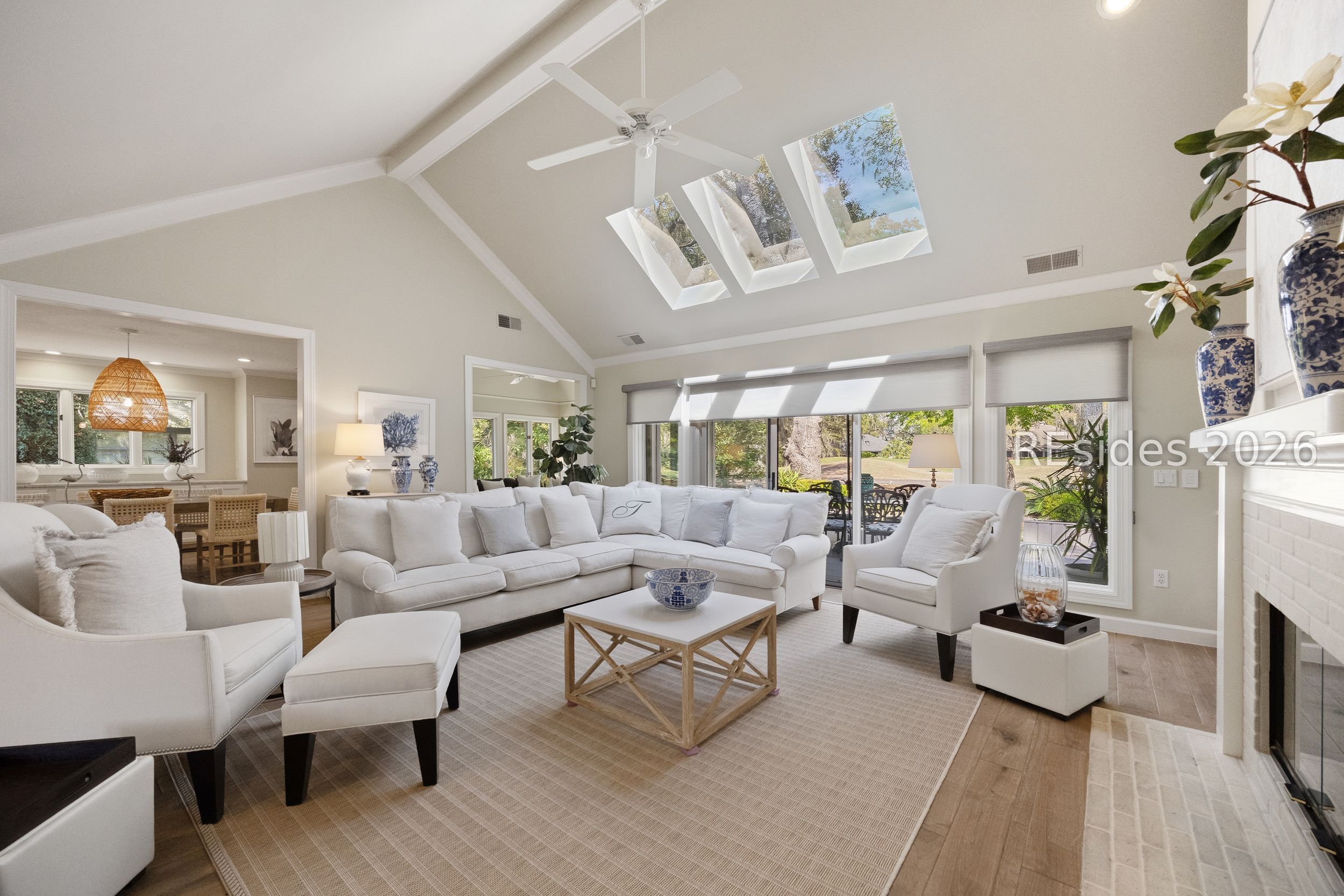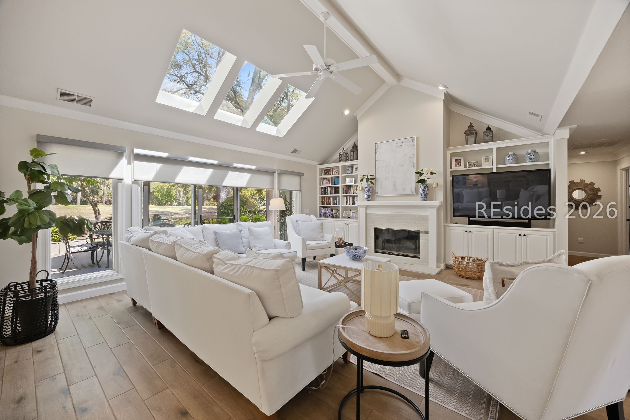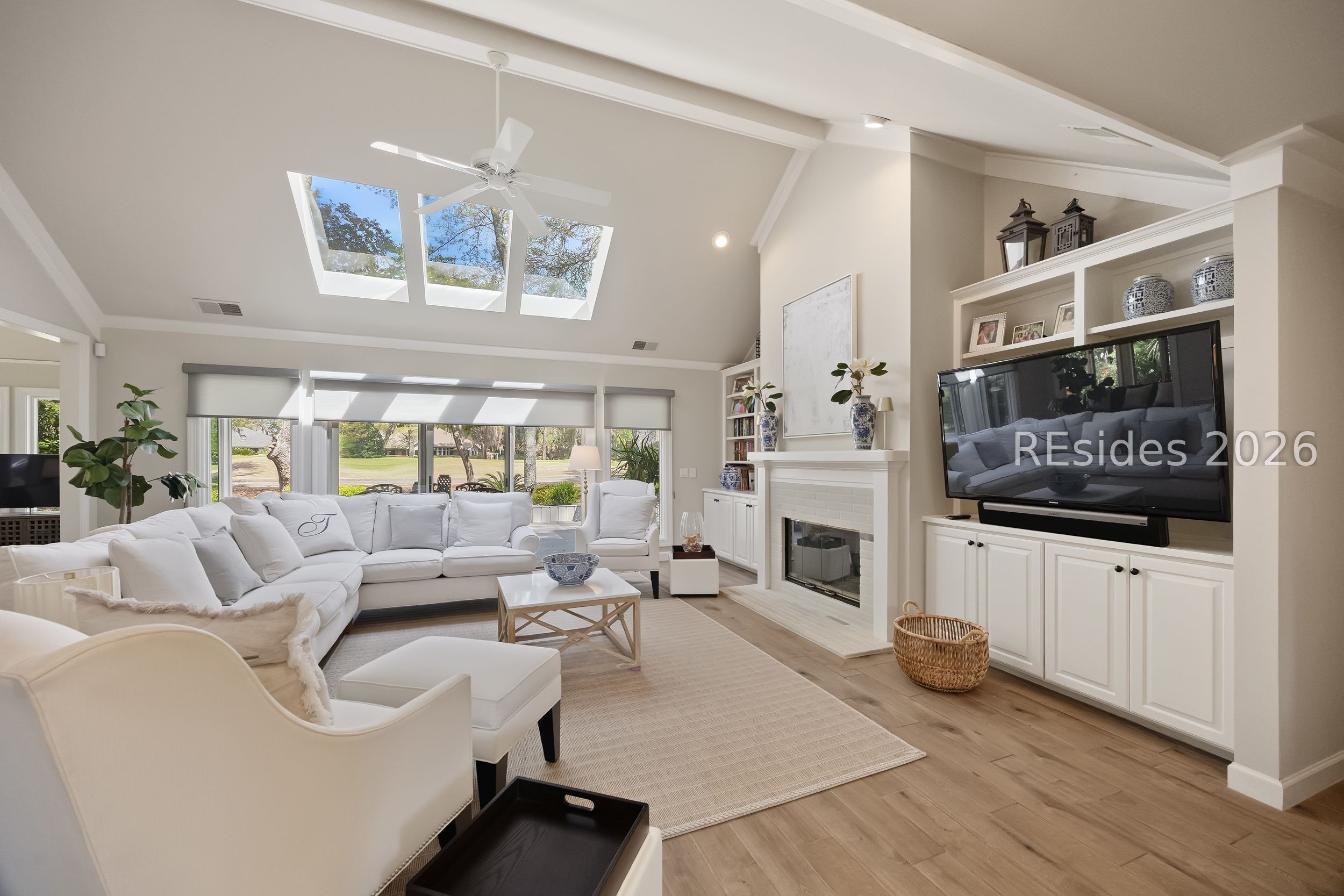 Totally remodeled, turn-key single-level home in Hilton Head Plantation! This 3-bedroom, 2.5-bath property features a 2-car side-entry garage and is ideally located near the amenities of the Country Club of Hilton Head. The updated kitchen showcases quartz countertops, a tile backsplash, gas range, and stainless-steel appliances. The living room offers vaulted ceilings, abundant windows for an open and airy feel, along with built-ins and a fireplace. A Carolina room provides additional living space, perfect for relaxing or entertaining. Enjoy picturesque views of the 17th green of the Country Club of Hilton Head course. The primary suite features a tray ceiling, walk-in closet, and a beautifully updated bath with double vanities and a walk-in shower. Additional highlights include crown molding throughout, new carpeting, a garage workstation, and a private cul-de-sac setting. Residents of Hilton Head Plantation enjoy exceptional amenities including four golf courses, a full-service marina, tennis and pickleball courts, leisure trails, multiple pools, Dolphin Head Recreation Area, waterfront park, and 24-hour gated security. Low-maintenance, move-in ready living ideal for a primary residence or retirement home.