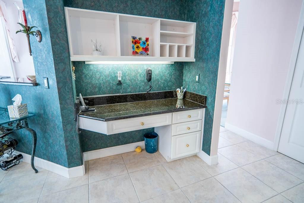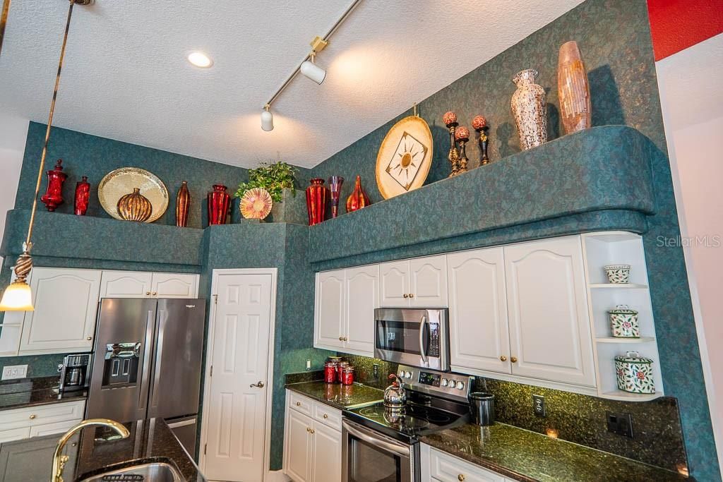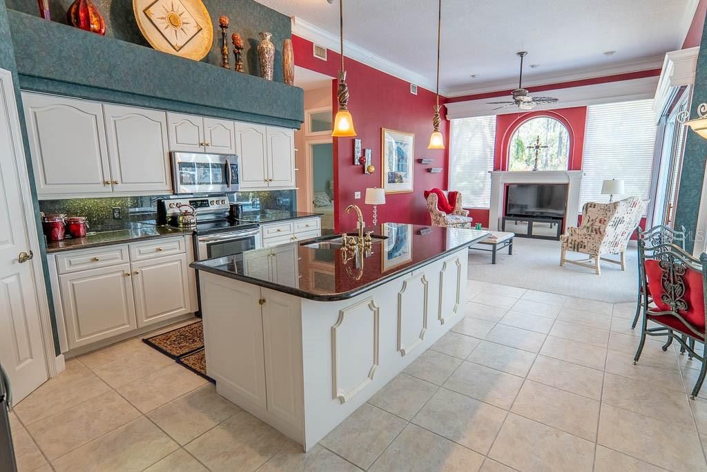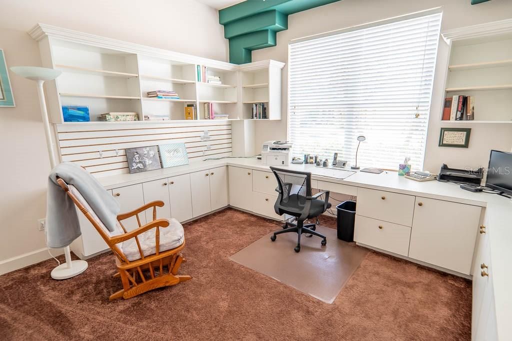 - Built-in Features, Ceiling Fan(s), Crown Molding, Eat-in Kitchen, High Ceilings, Kitchen/Family Room Combo, Open Floorplan, Main Level Primary, Solid Surface Counters, Split Bedrooms, Walk-In Closet(s), Window Treatments