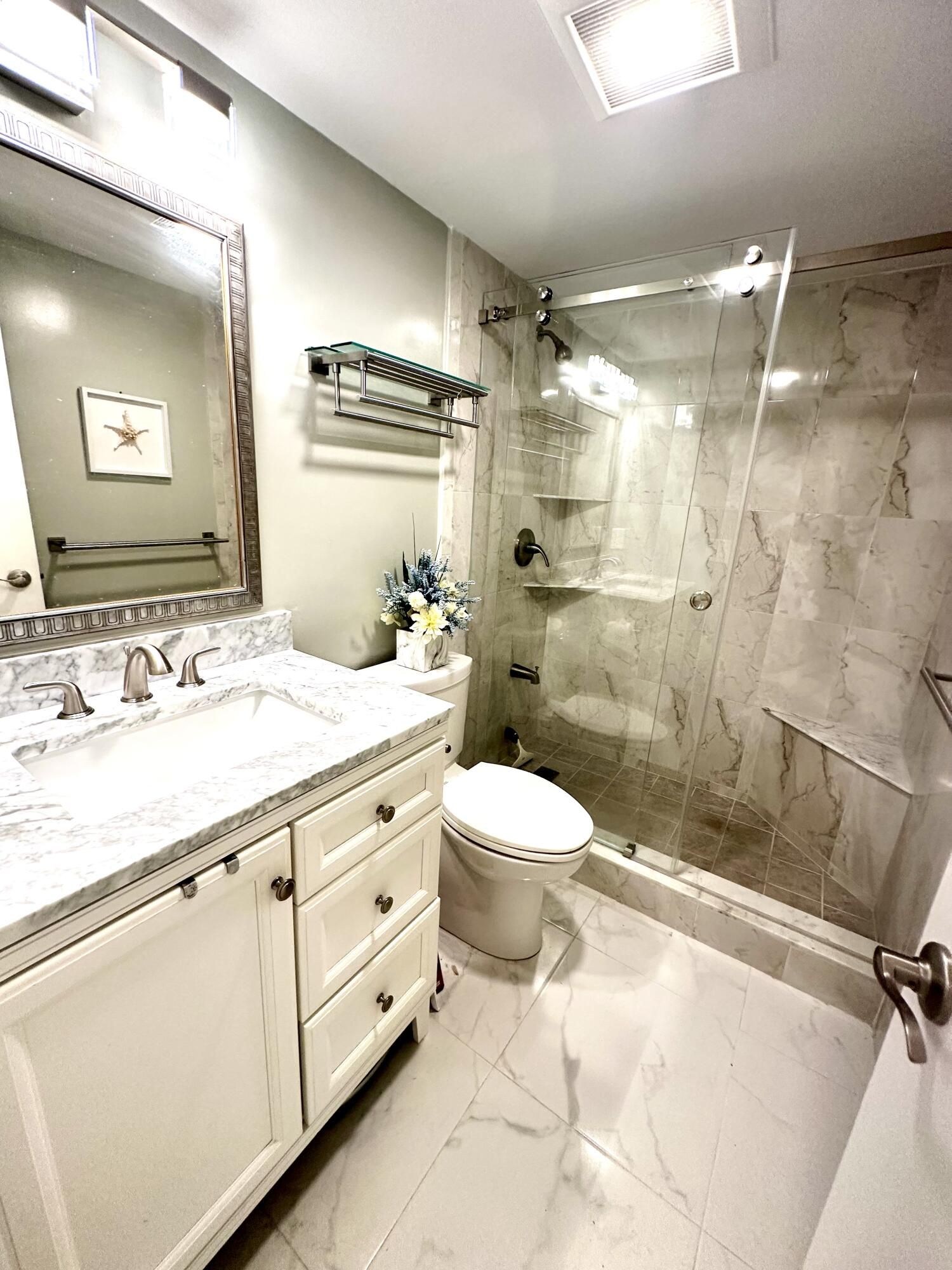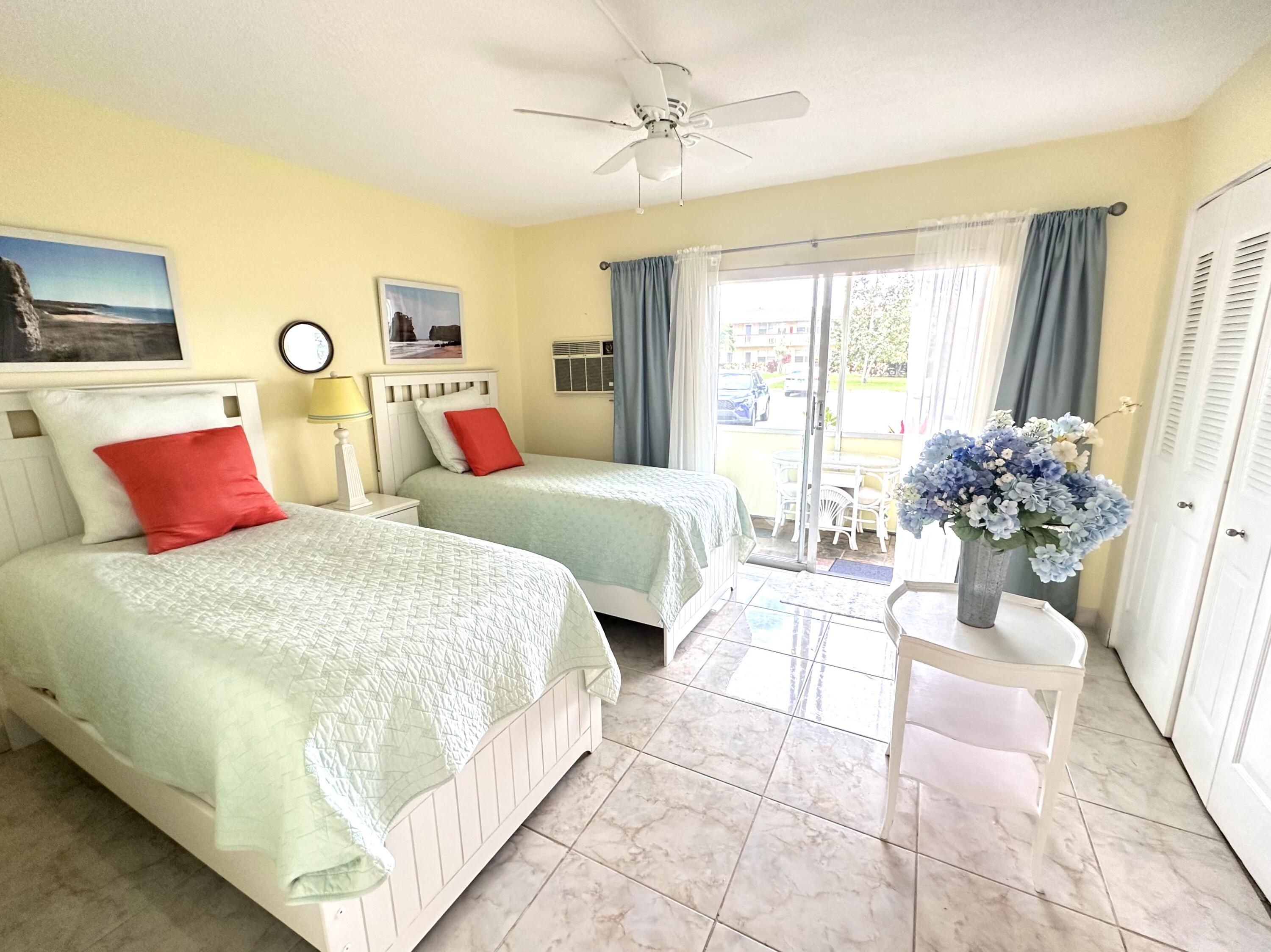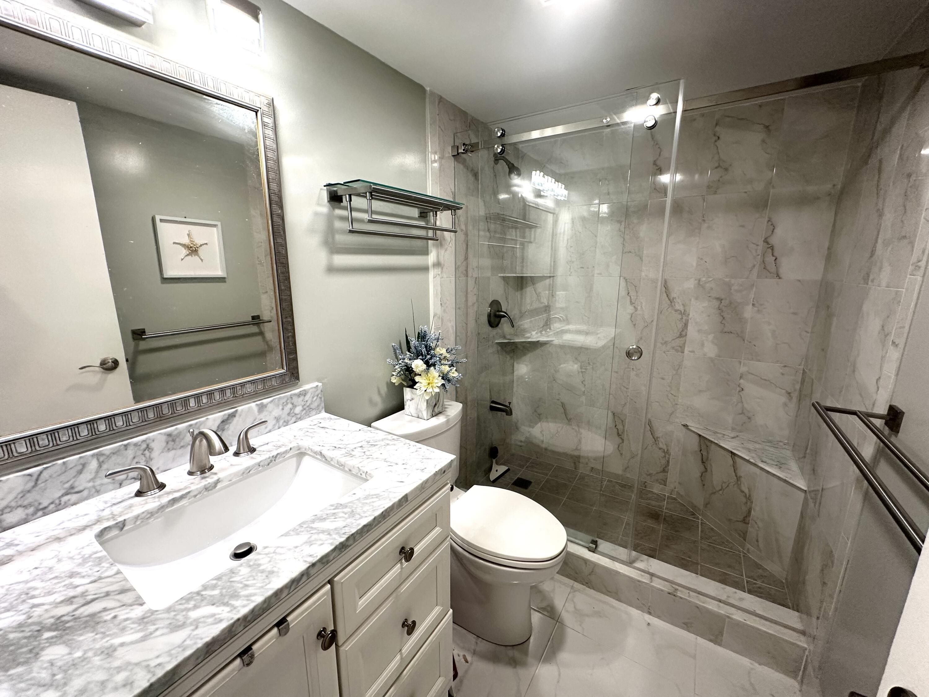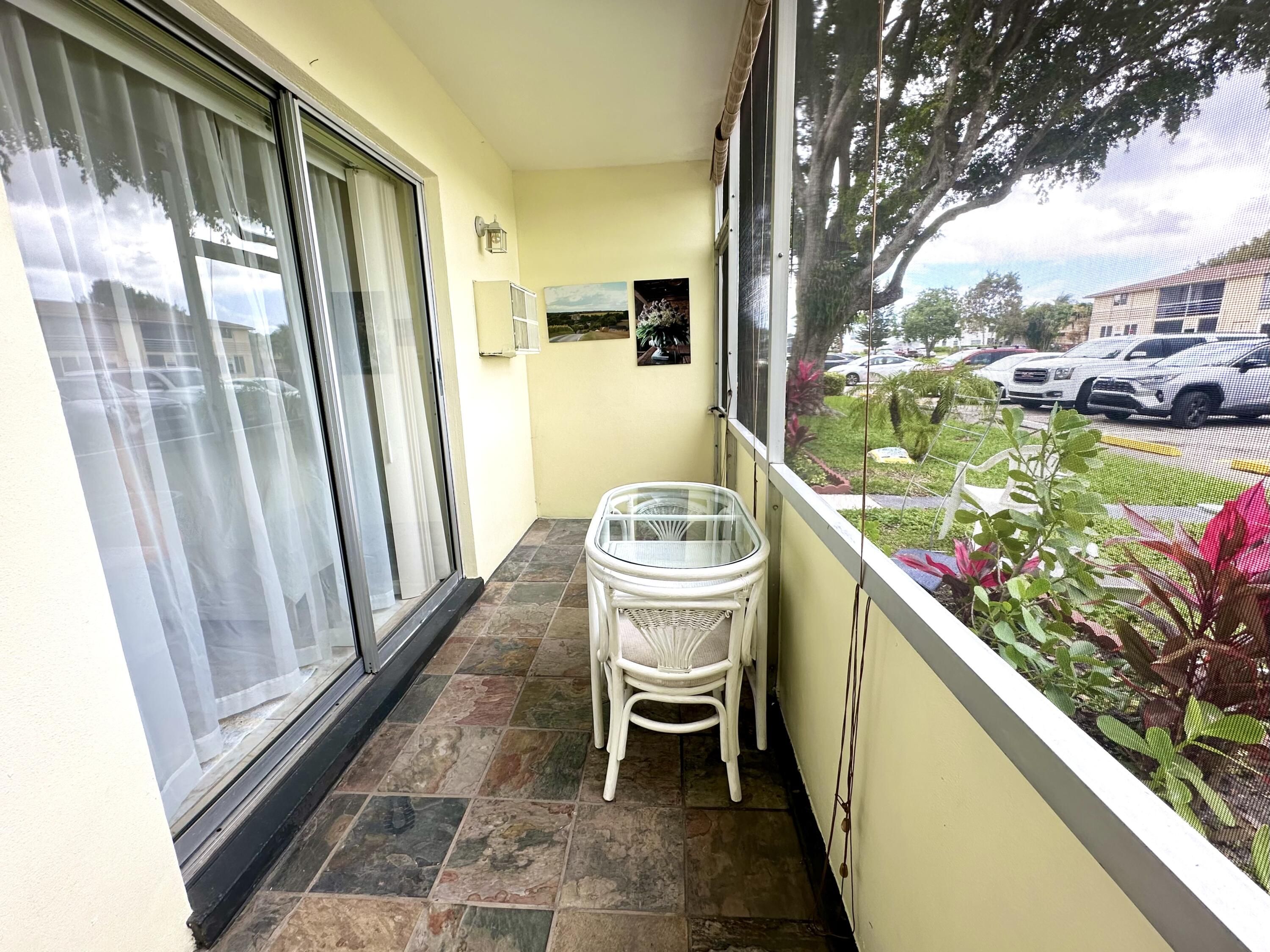 Welcome to your corner of paradise! Enjoy this light, bright and fully updated turnkey treasure in a timeless Coastal style In Century Village 55+ community. This fully furnished 1 bed is ideally located on the first floor overlooking one of the nicest gardens as well gorgeous water views .The condo features a pristine new modern kitchen with quartz countertops, recessed lighting, ceiling fan, new stainless steel appliances, and new hot water heater. New bathroom.Slate floor in screened in patio adds another level of quality to this charming one-of-a-kind condo lovingly designed. The building was freshly painted. New roof was just installed leaving the association with a healthy reserve.
