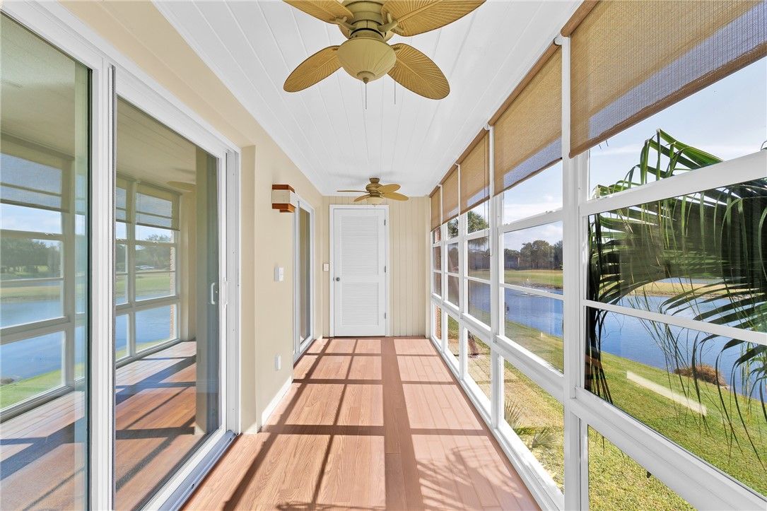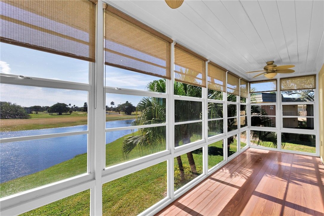 Beautifully updated, move-in-ready 2BR/2BA end-unit featuring the popular B floor plan with some of the best golf & water views in Vista Gardens. Features incl impact windows/sliders (excl front door & lanai), California shutters, in-unit W/D, & 2025 A/C. Open kitchen with high-end cabinetry, granite counters & tile backsplash. Additional highlights incl crown molding, solid wood doors throughout, wood-look laminate flooring, and carpet. Master BR offers custom closets and updated en-suite bath with tiled shower & dual shower heads. Active 55+ community w/ heated pool, tennis, fitness & more.