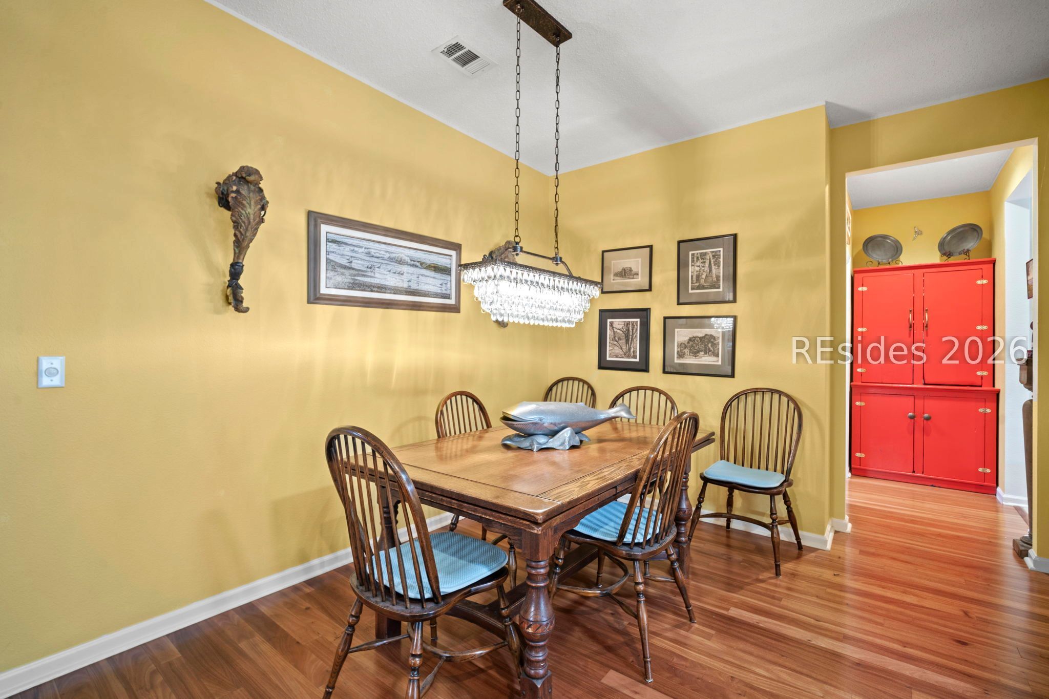 Don't miss this spacious and airy Dogwood model with open living and dining areas, den with French doors, and two bedrooms and two baths. Enjoy a large 12'x24' Carolina Room, and a bright eat-in kitchen with a bay window. Wood floors and plantation shutters throughout. Relax on the 12'x22' patio and appreciate the serene lagoon view. Upgrades include a solar tube, a new guest shower, a new insulated garage door system, new hot water heater coils and new HVAC (2025). Schedule your showing today and discover the lifestyle Sun City offers.