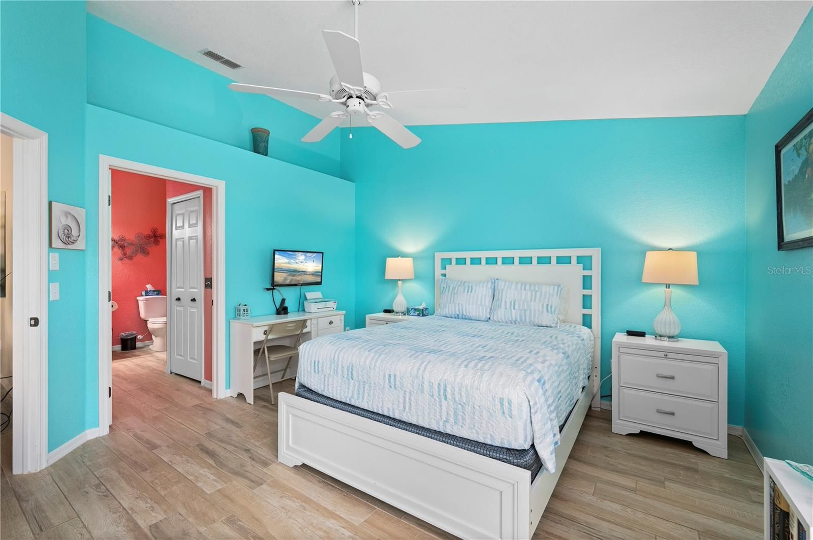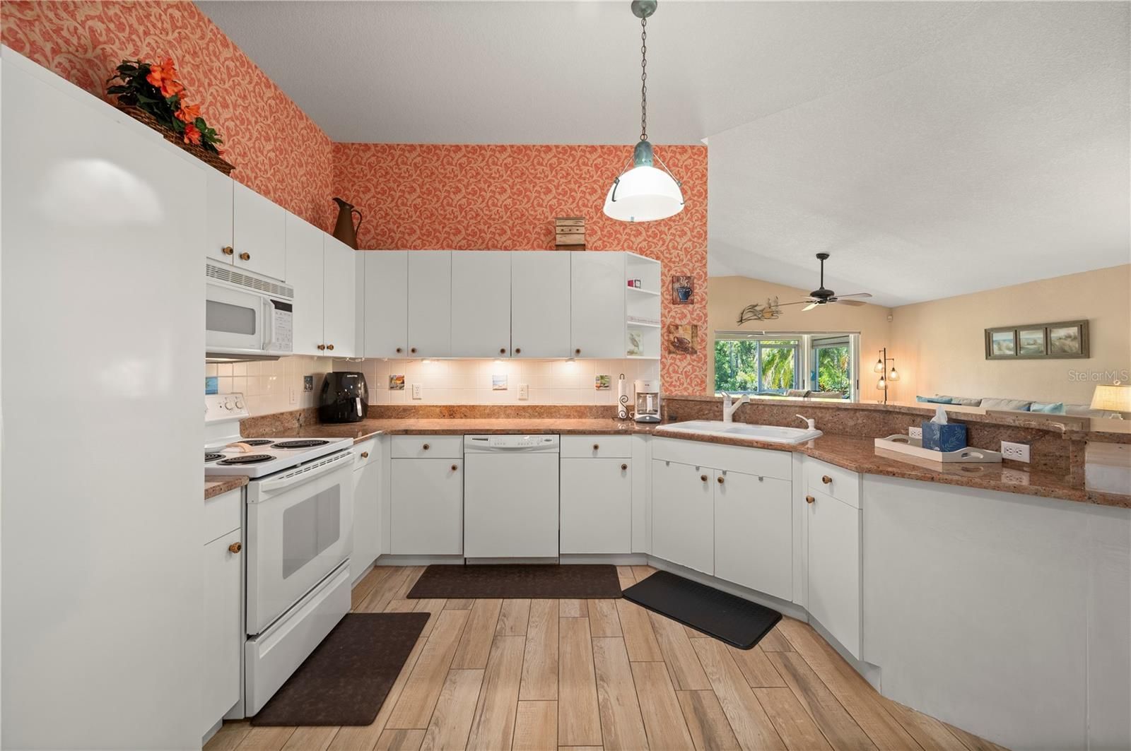 - Cathedral Ceiling(s), Ceiling Fan(s), High Ceilings, Living/Dining Room, Open Floorplan, Split Bedrooms, Stone Counters, Thermostat, Vaulted Ceiling(s), Walk-In Closet(s), Window Treatments
