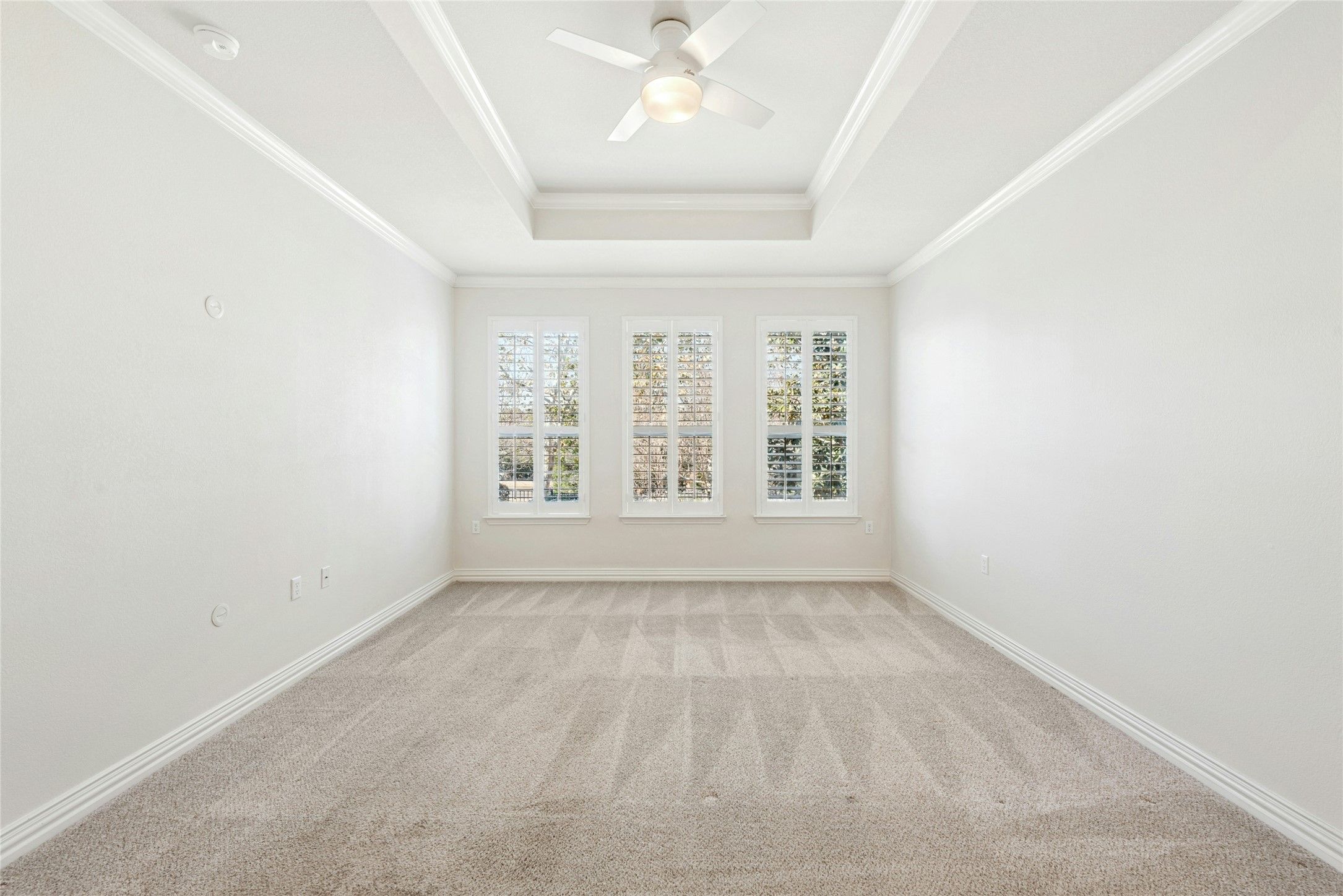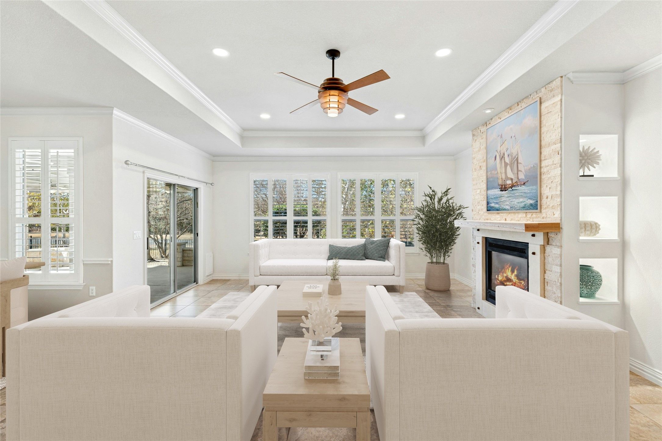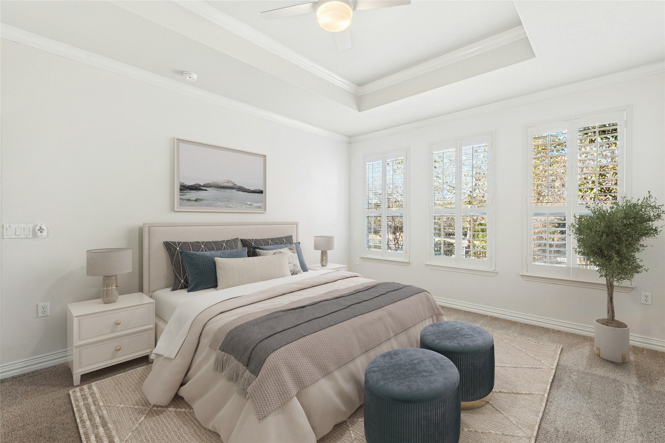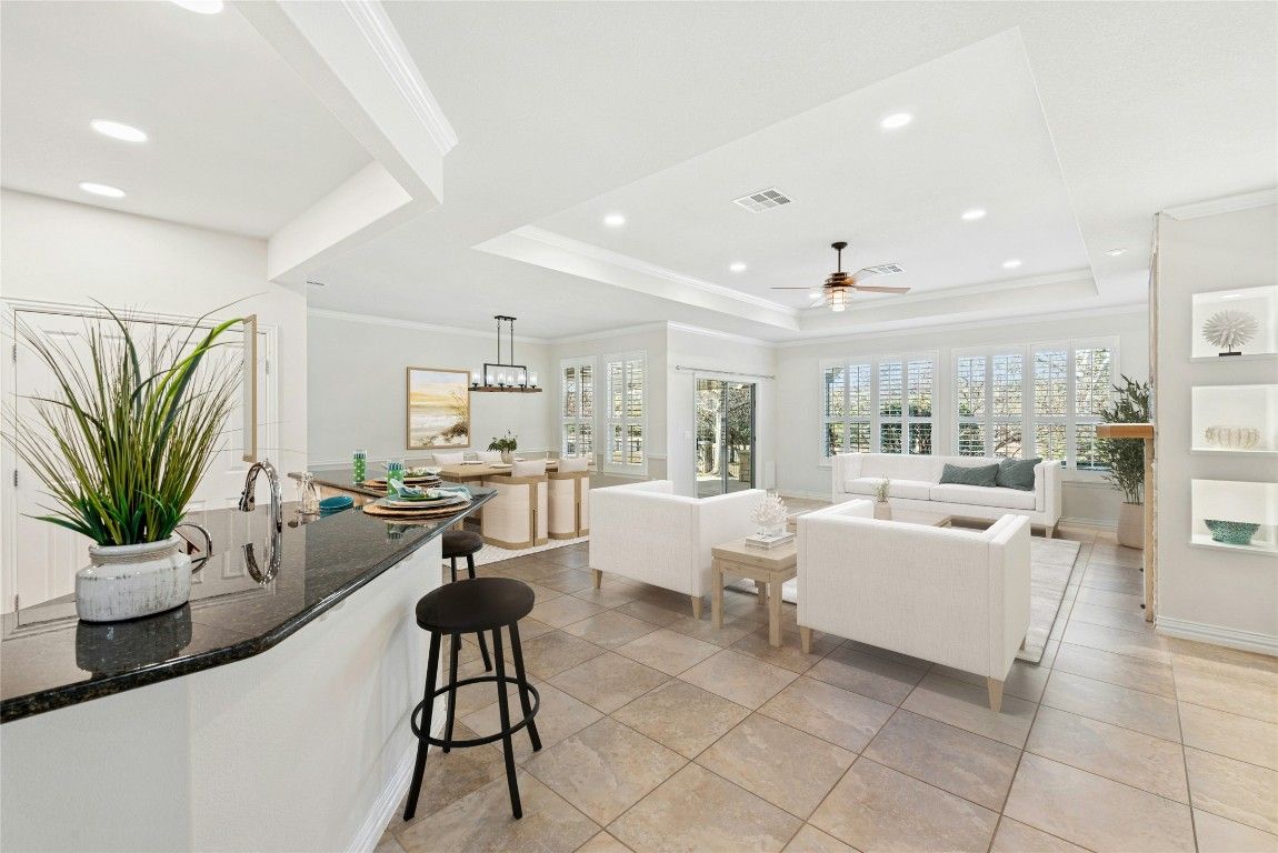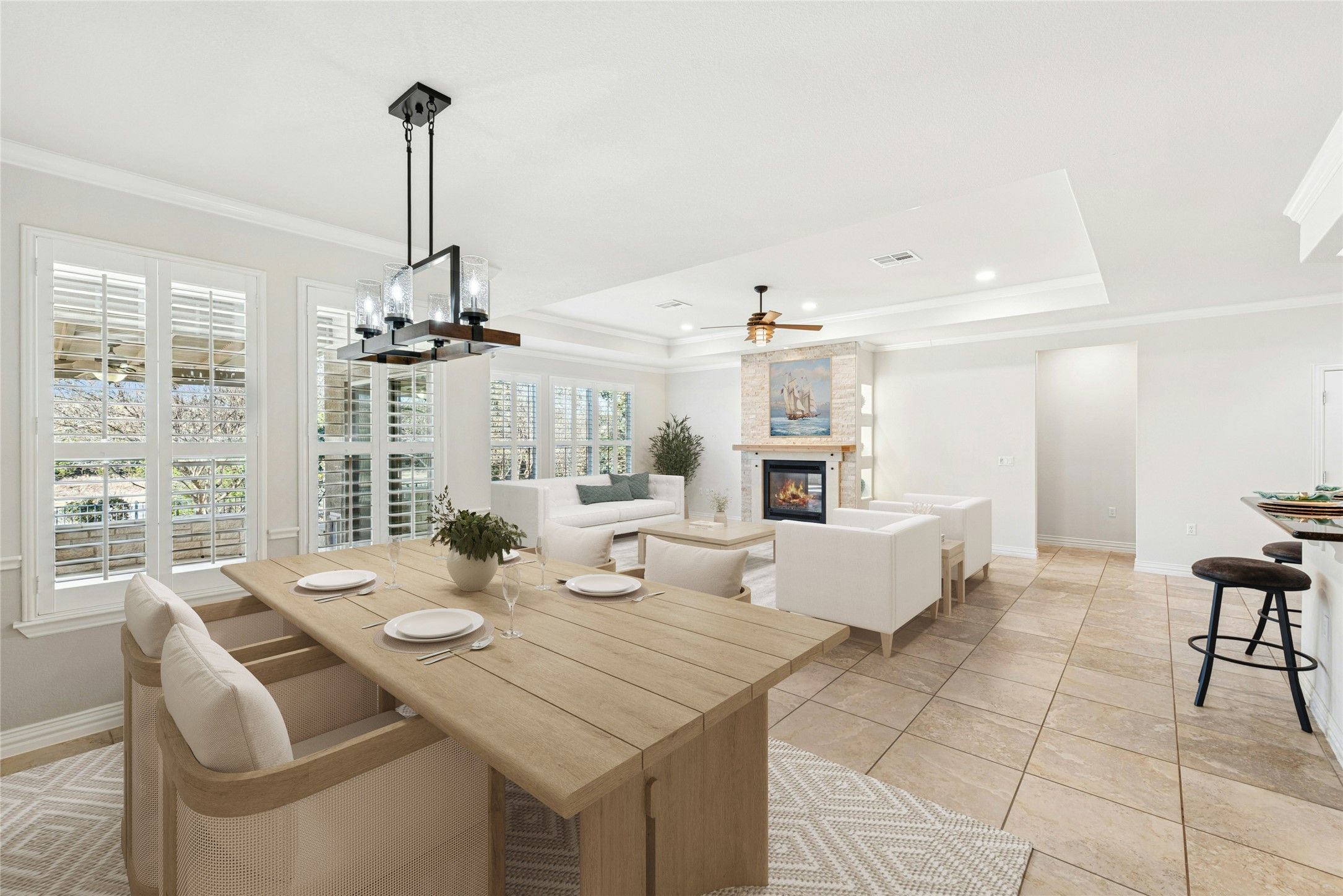 - Breakfast Bar, Built-in Features, Tray Ceiling(s), Ceiling Fan(s), Crown Molding, Separate/Formal Dining Room, Double Vanity, Entrance Foyer, French Door(s)/Atrium Door(s), Granite Counters, Kitchen Island, Multiple Dining Areas, Main Level Primary, NoInteriorSteps, Open Floorplan, Pantry, Recessed Lighting, Walk-In Closet(s)