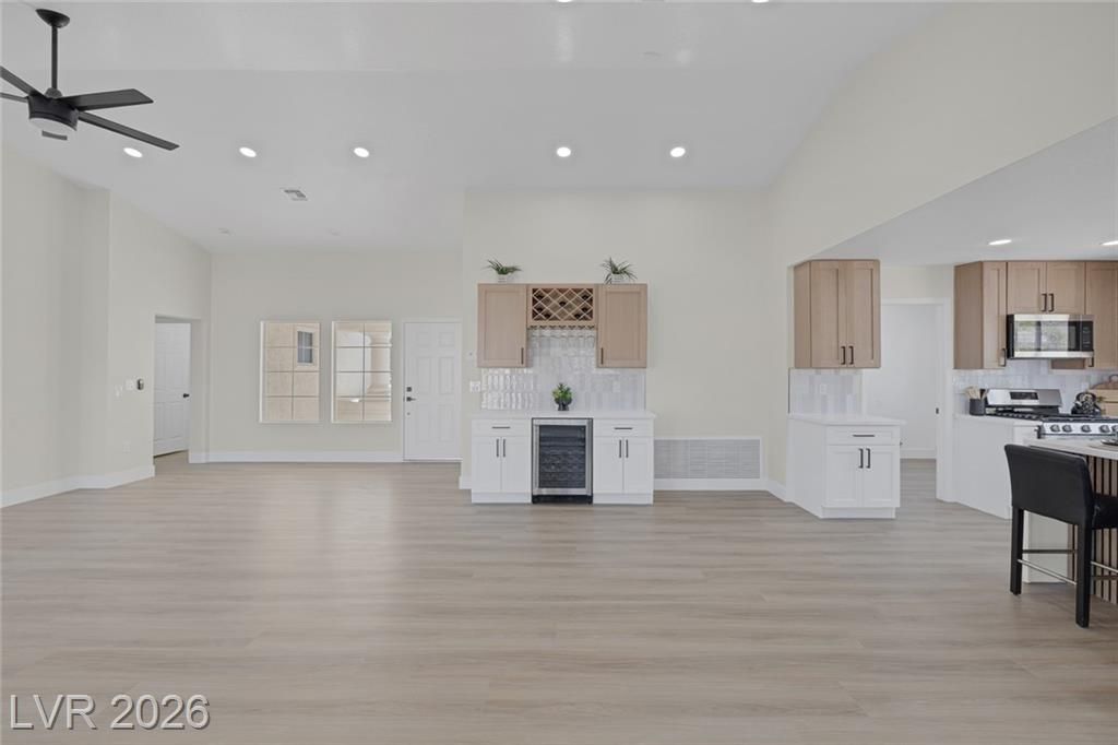 Enjoy a backyard enhanced with new privacy hedging, thoughtfully added for a more secluded outdoor feel over time! Located in the desirable 55+ community of Sun City Summerlin, this fully remodeled single-story home showcases top-quality upgrades throughout. Features include brand new luxury vinyl plank flooring, fresh two-tone paint, custom two-tone cabinetry with designer hardware, custom wine bar with mini fridge, quartz countertops, and a high-end stainless steel appliance package. Enjoy beautifully finished electric fireplace wall, designer lighting, and stylish fixtures. Spacious and epoxied two car garage has sufficient room for your golf cart. Completely turn-key and move-in ready, offering the perfect blend of comfort, elegance, and functionality in a premier community!