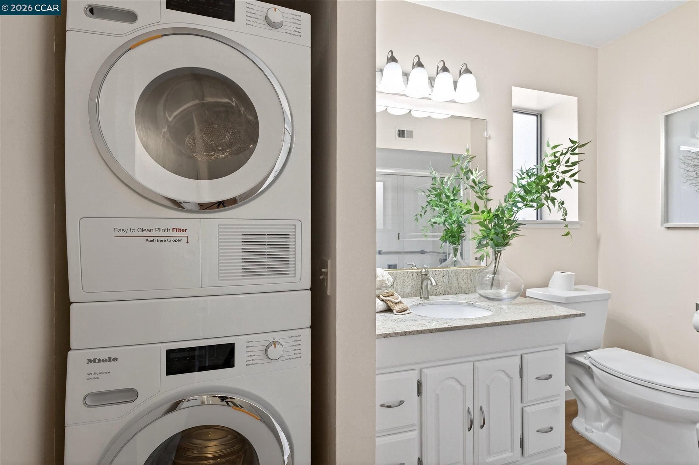 Step into this warm and inviting Sonoma Wrap co-op designed to maximize both comfort and lifestyle. The expanded living and dining room creates a bright and spacious gathering area, while the covered side veranda offers the perfect setting for outdoor entertaining, relaxing, or enjoying your own container garden retreat. Large dual-pane windows frame serene views of surrounding hills and mature trees, bringing natural light and a sense of tranquility into the space. For added comfort and privacy, the living room wall has been enhanced with special sound-proof drywall. Recent updates include stylish laminate flooring in the entry and kitchen, mirrored closet doors, and full-size stacked washer and dryer. Just steps away, the carport offers parking and additional storage cabinets. You’ll also enjoy close proximity to the Hillside Clubhouse, featuring a swimming pool, table tennis, and bocce ball—perfect for staying active and social. Move-in ready so you can start enjoying the active Rossmoor lifestyle!