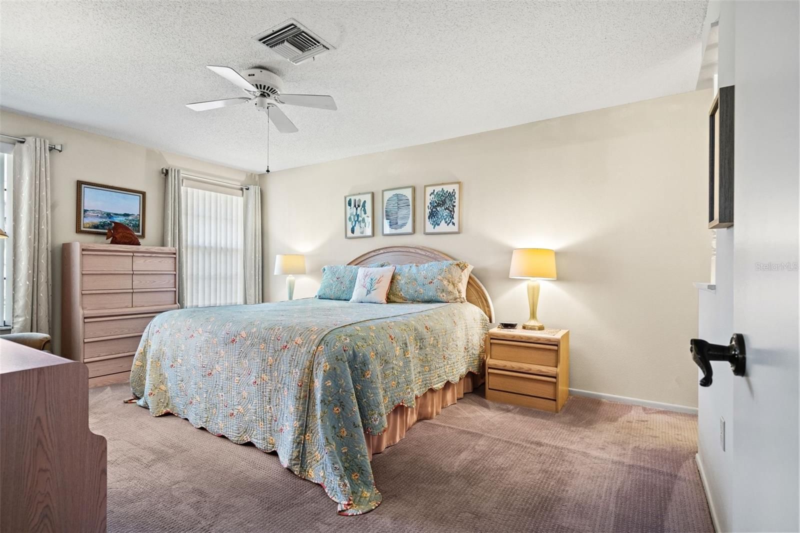 - Ceiling Fan(s), Dry Bar, Eat-in Kitchen, Open Floorplan, Main Level Primary, Solid-Wood Cabinets, Stone Counters, Walk-In Closet(s), Window Treatments