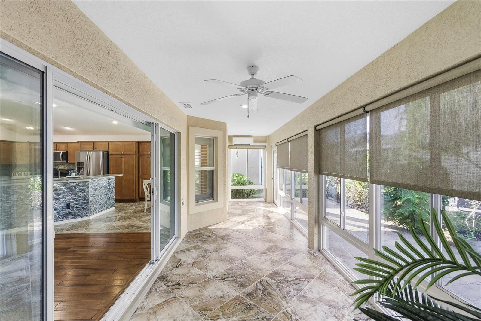 Welcome Home to this beautifully maintained IRIS model located in the desirable Village of Sanibel, perfectly positioned on a LARGE CORNER LOT lot with classic Florida landscaping, flowering palms, and a pavered patio that creates inviting curb appeal from the moment you arrive. Step inside to an open, light-filled floor plan featuring engineered wood and tile flooring, volume ceilings, and seamless flow through the living and dining areas, ideal for both everyday living and entertaining. The kitchen is thoughtfully designed with GRANITE countertops, stainless steel appliances, ample cabinetry that includes 2 add'l pantry cabinets flanking the eat-in nook space, and open sightlines to the main living spaces, making it a natural gathering point for family and friends. The spacious primary suite offers ABUNDANT NATURAL LIGHT, a generous walk-in closet with customized storage, and a relaxing retreat at the end of the day. Primary bathroom is appointed with double vanities, a spacious step-in shower with a bench. Two guest bedrooms are well separated for privacy and both feature customized closets, providing comfortable accommodations for visitors or flexible space for hobbies or a home office. The guest bathroom is nicely appointed with granite and a tub/shower combo. At the rear of the home, the enclosed lanai with privacy shades creates a peaceful extension of the living space, perfect for enjoying the Florida lifestyle year-round. Completing the home is a convenient 2-plus GOLF CART GARAGE with utility sink, offering excellent storage and convenience. HVAC approx 2 years old. Built in 2012. Ideally located just minutes from Brownwood Paddock Square and Lake Sumter Landing, the Village of Sanibel provides easy access to executive golf courses, recreation centers, pools, shopping, dining, and nightly entertainment, making this home an exceptional opportunity to enjoy everything The Villages lifestyle has to offer.
