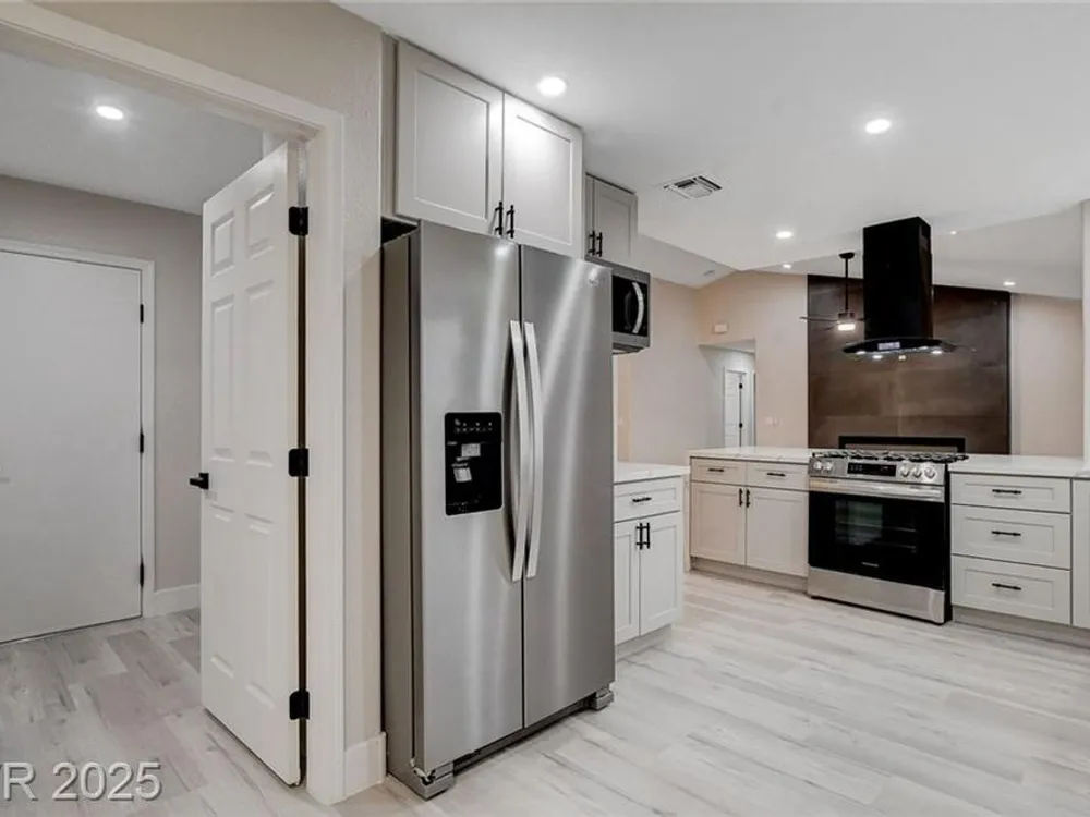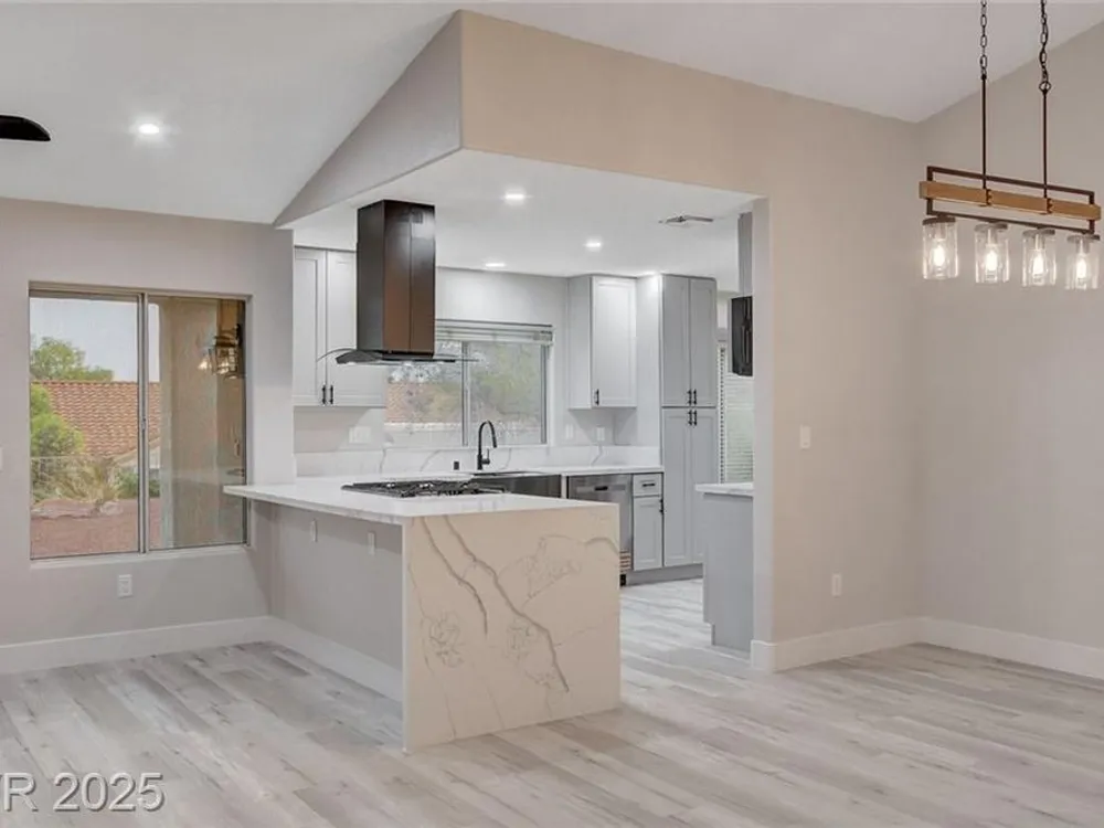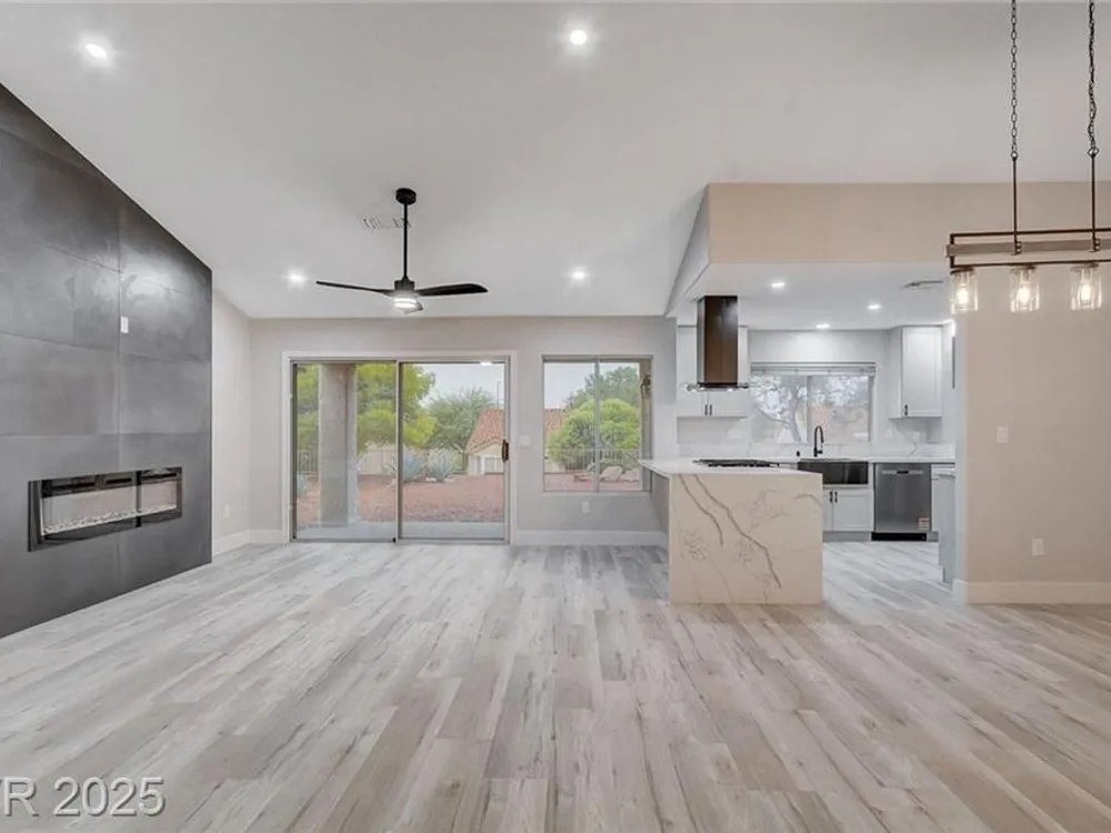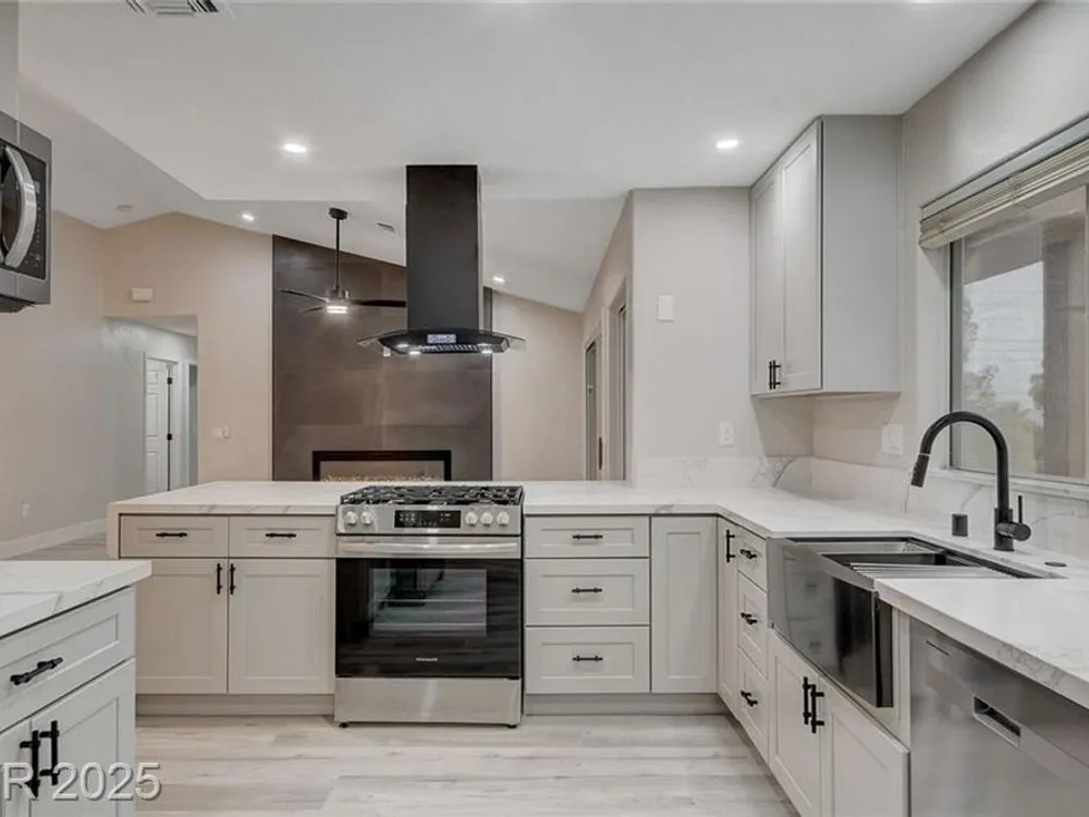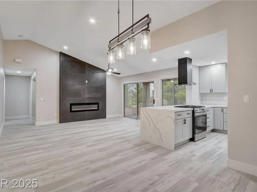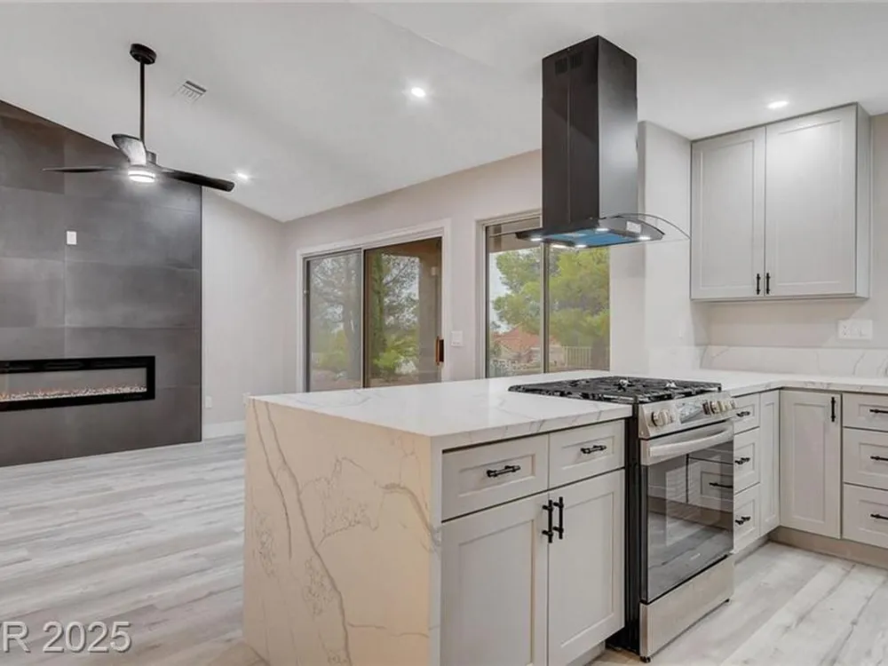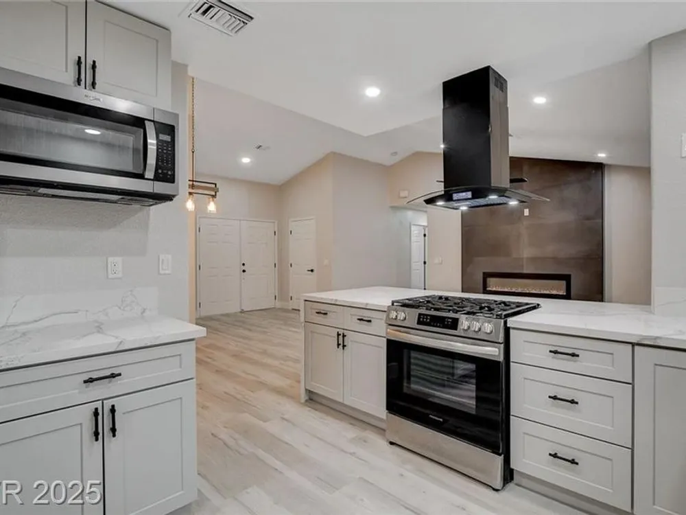 Beautifully remodeled home, featuring open concept kitchen/living room/dining area. Stunning island with waterfall, augmented by a slide in range and an island hood, pantry cabinet, electric fireplace with a tiled wall, recessed lights and luxury vinyl flooring through out. Fully tiled walk-in shower and bathtub. LED mirrors in bathrooms.