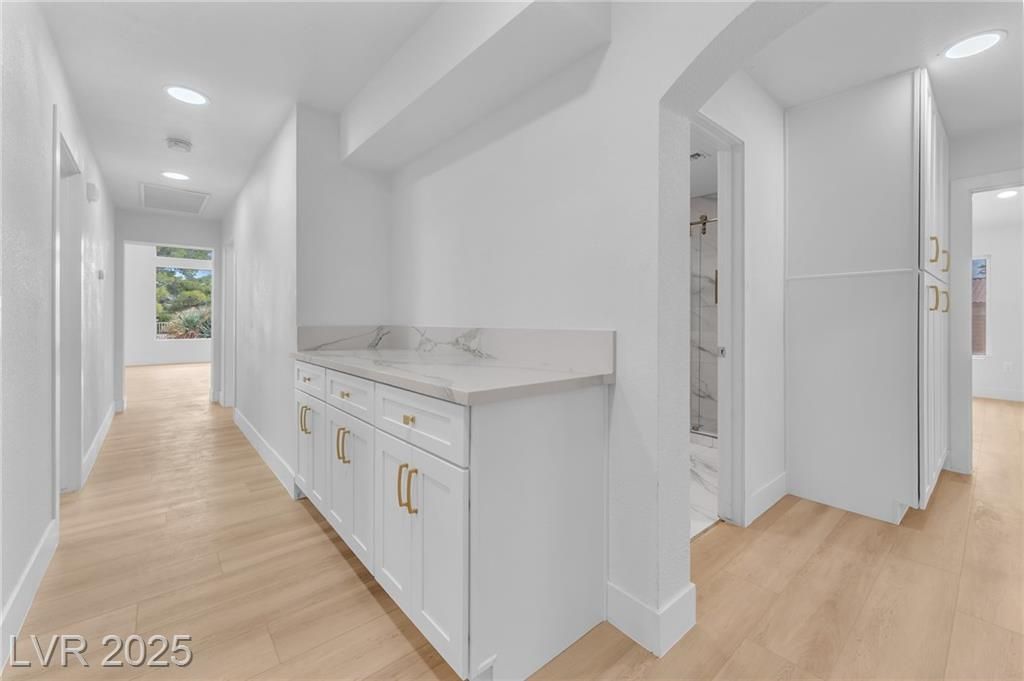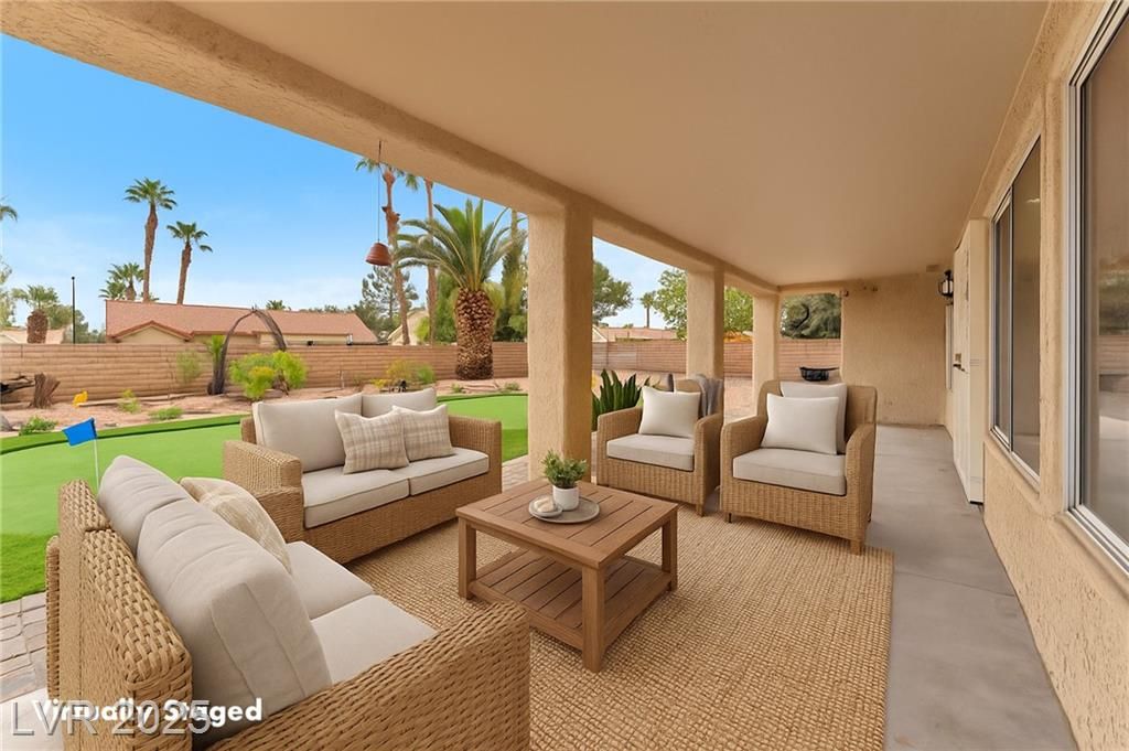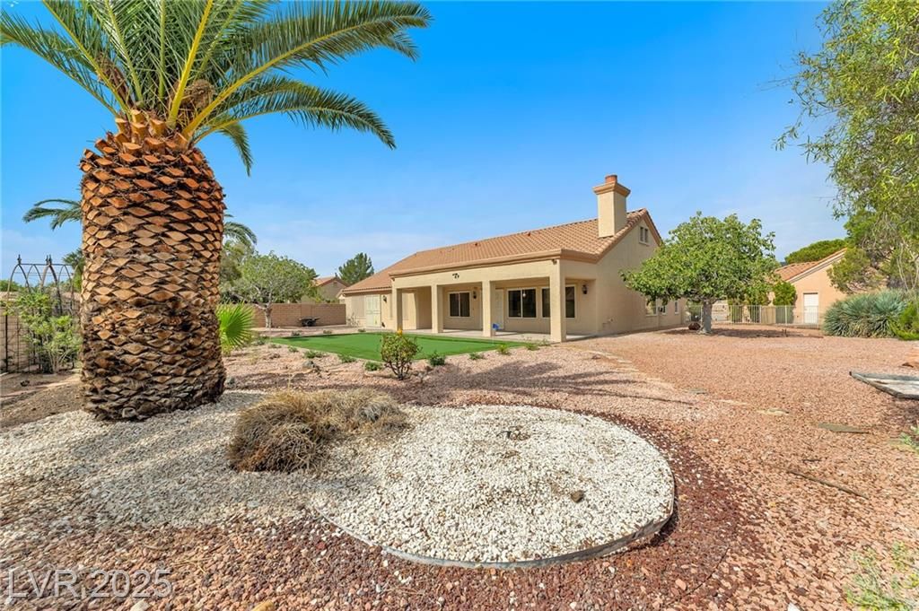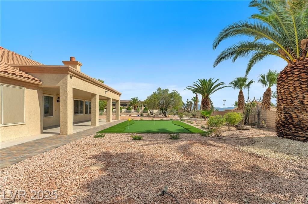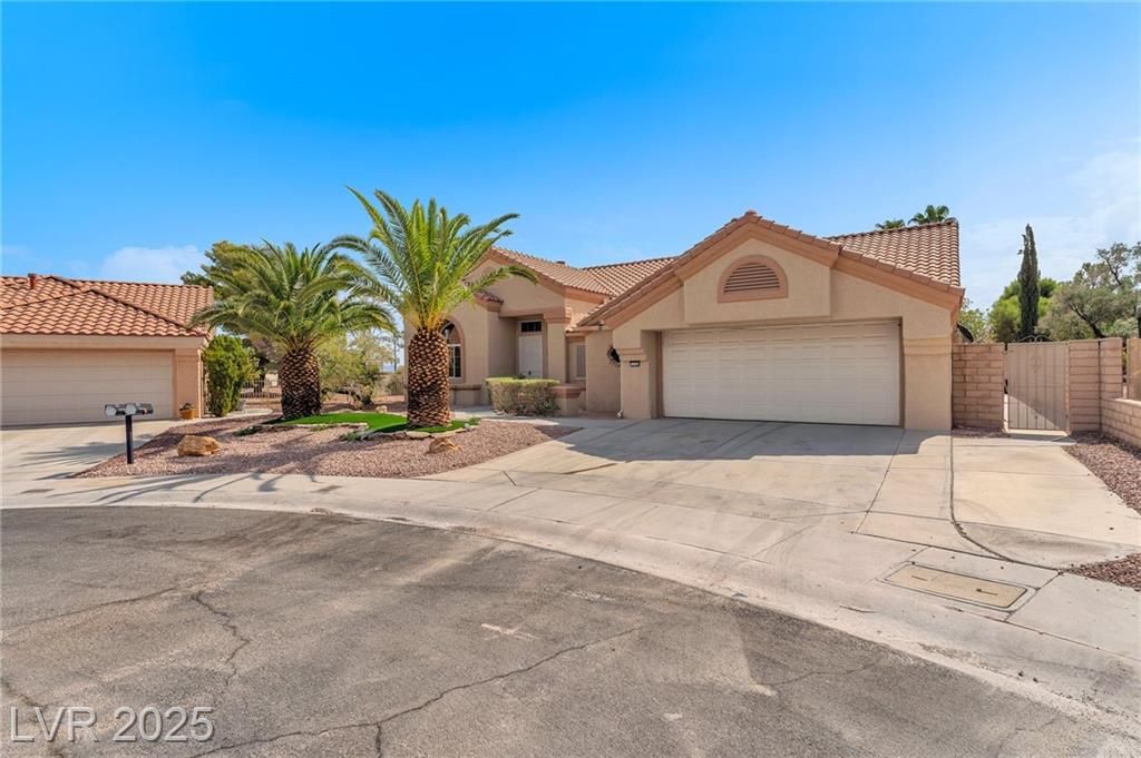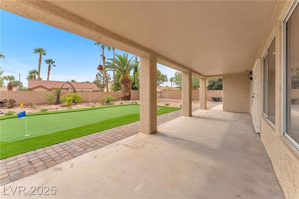Beautifully remodeled 3-bedroom, 2-bath single-story in the heart of Sun City Summerlin’s 55+ community! Set on a rare 1/3 acre cul-de-sac lot, this home features vaulted ceilings, recessed lighting, abundant natural light, new wood laminate flooring, and ceiling fans in every room. The fully updated kitchen boasts quartz counters, gold fixtures, ample cabinetry, a large breakfast bar, and matching KitchenAid appliances. Bathrooms shine with new tile, glass enclosures, and a spa-like primary with walk-in closet, stand-alone tub, and separate shower. Enjoy year-round comfort with 2 newer AC units (2019) and an electric fireplace. The oversized backyard offers desert landscaping, a covered patio, and a turf putting green with 4 holes—perfect for entertaining. With a newly replumbed indoor laundry room, quiet cul-de-sac location, and access to resort-style amenities, this home blends luxury and convenience in one of Summerlin’s most desirable active adult communities.