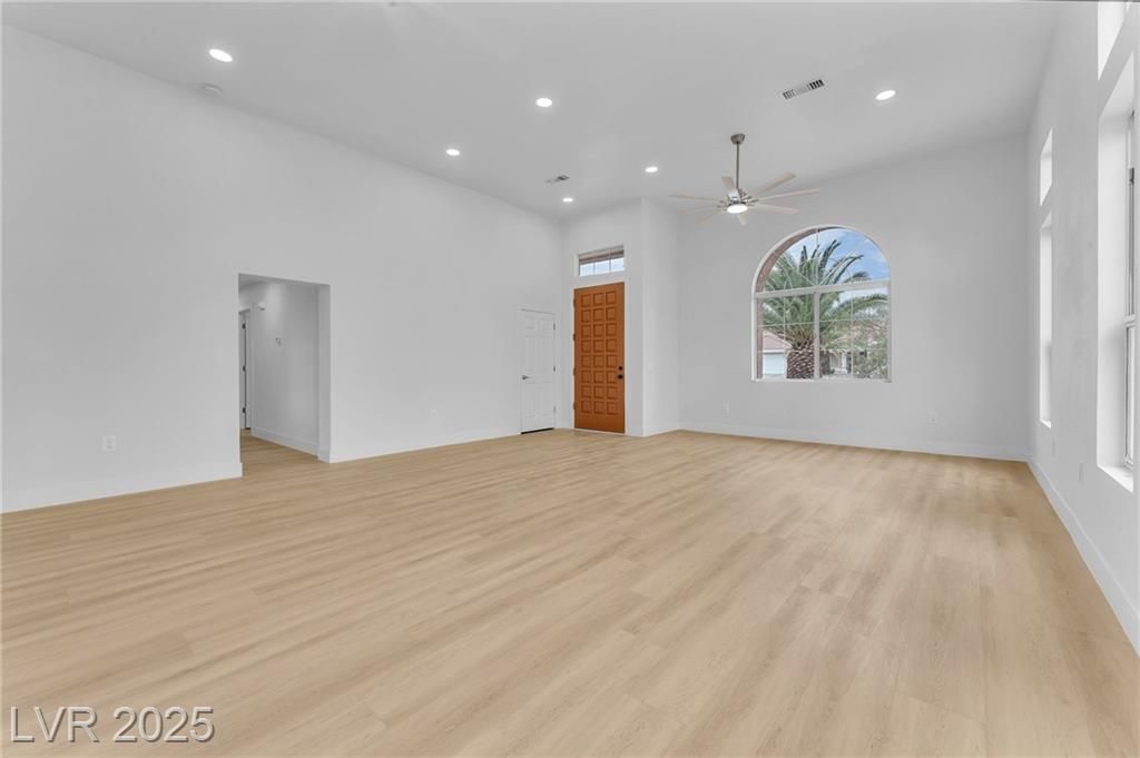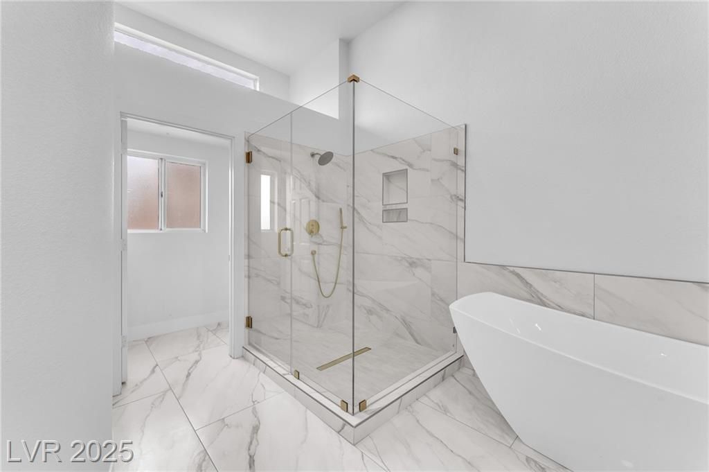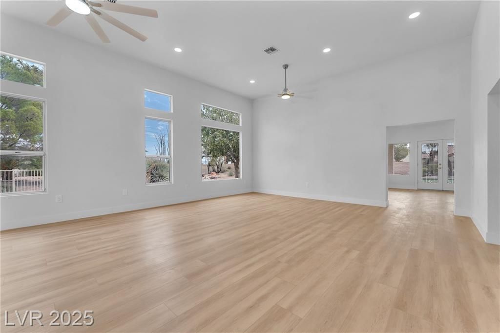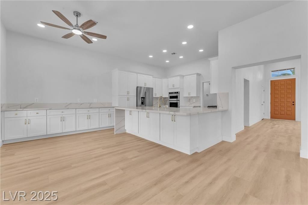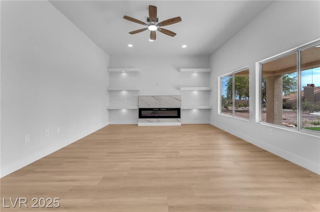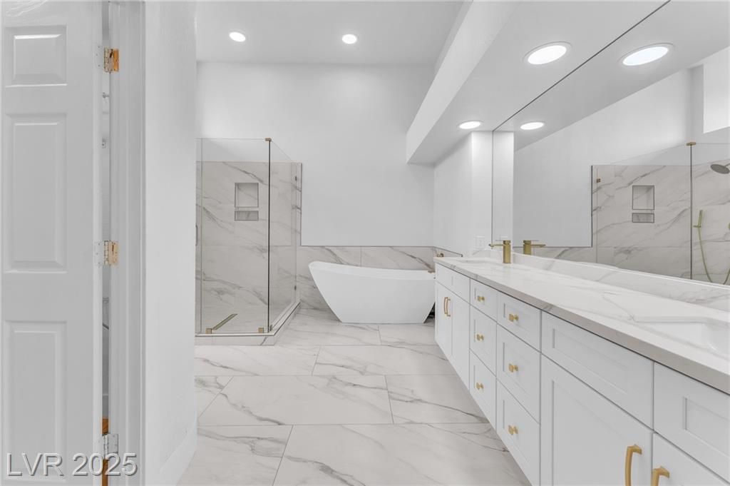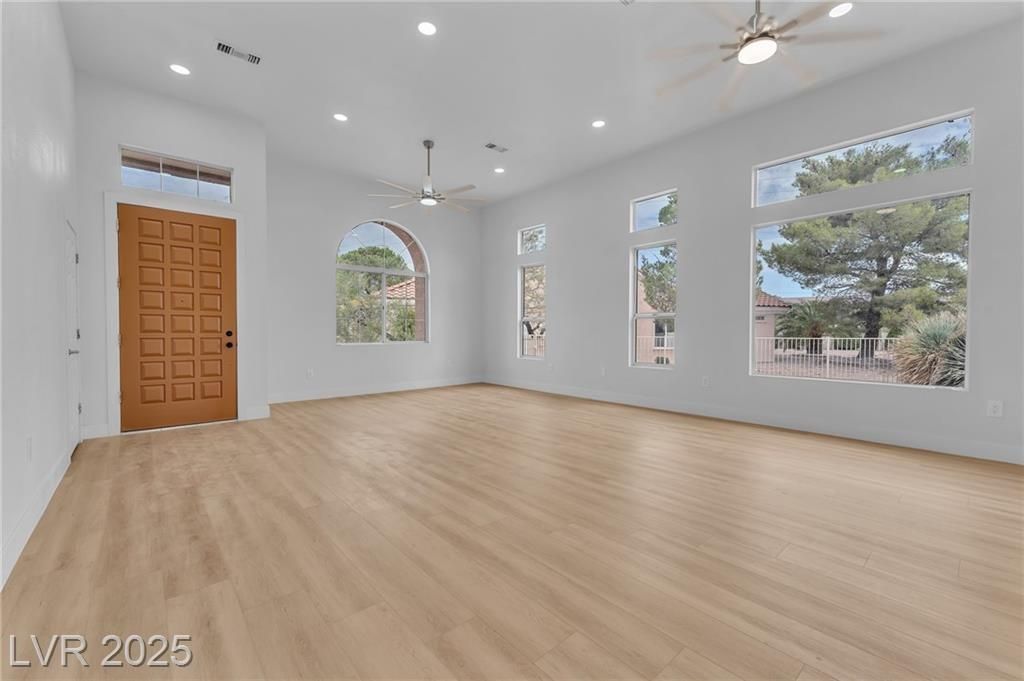 Beautifully remodeled 3-bedroom, 2-bath single-story in the heart of Sun City Summerlin’s 55+ community! Set on a rare 1/3 acre cul-de-sac lot, this home features vaulted ceilings, recessed lighting, abundant natural light, new wood laminate flooring, and ceiling fans in every room. The fully updated kitchen boasts quartz counters, gold fixtures, ample cabinetry, a large breakfast bar, and matching KitchenAid appliances. Bathrooms shine with new tile, glass enclosures, and a spa-like primary with walk-in closet, stand-alone tub, and separate shower. Enjoy year-round comfort with 2 newer AC units (2019) and an electric fireplace. The oversized backyard offers desert landscaping, a covered patio, and a turf putting green with 4 holes—perfect for entertaining. With a newly replumbed indoor laundry room, quiet cul-de-sac location, and access to resort-style amenities, this home blends luxury and convenience in one of Summerlin’s most desirable active adult communities.