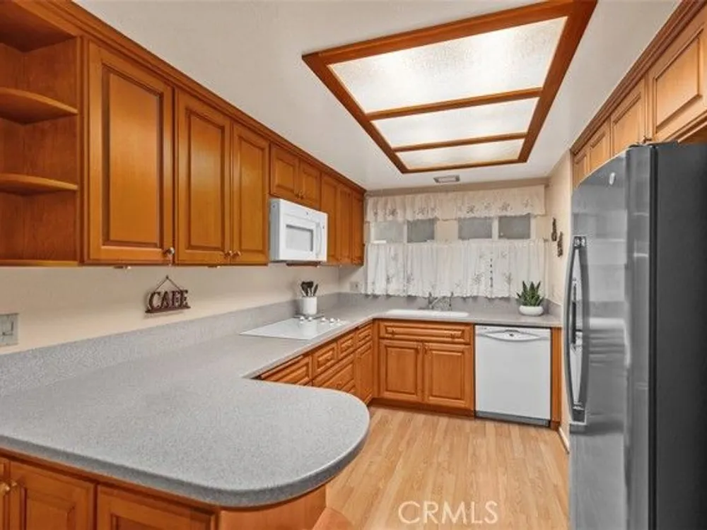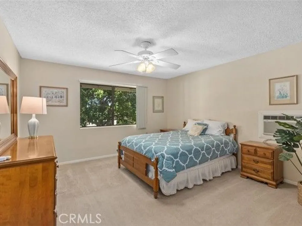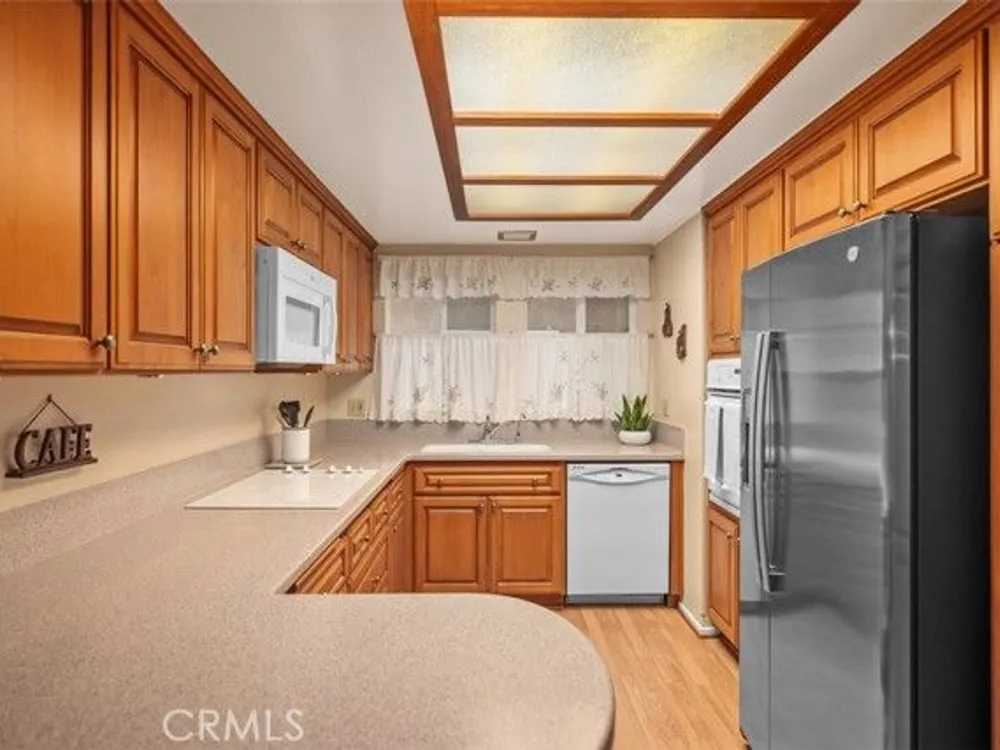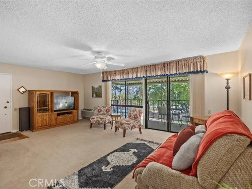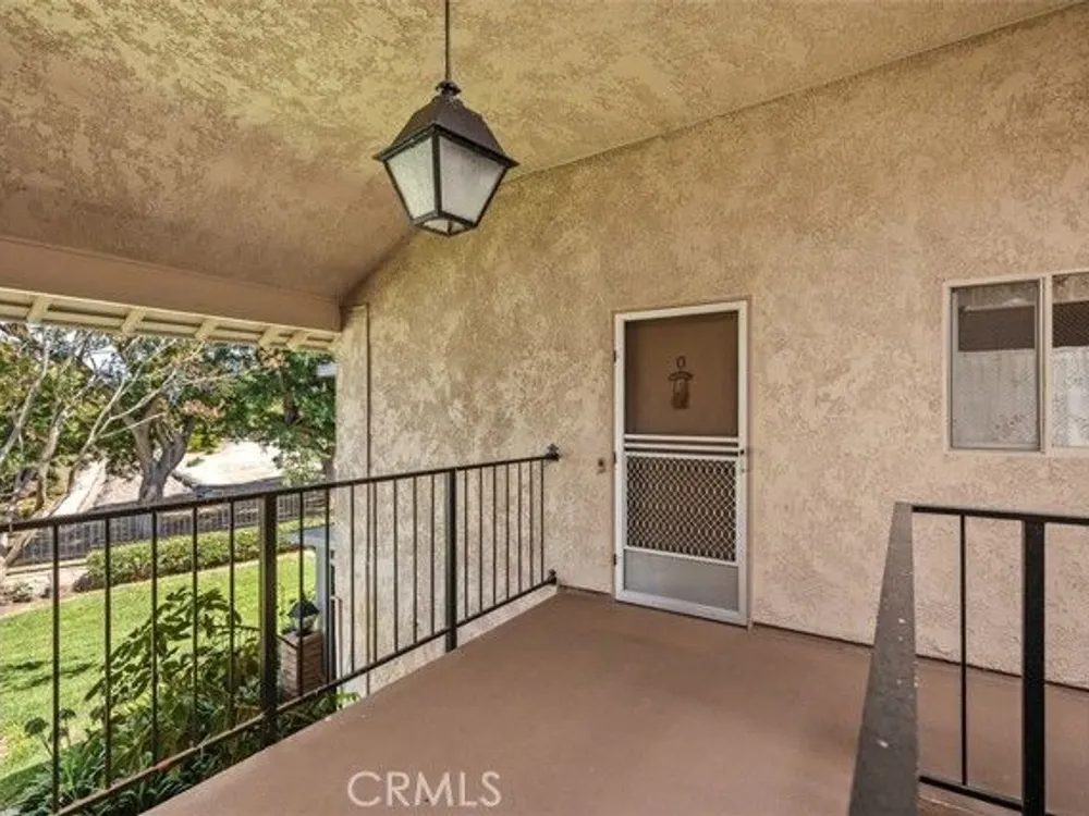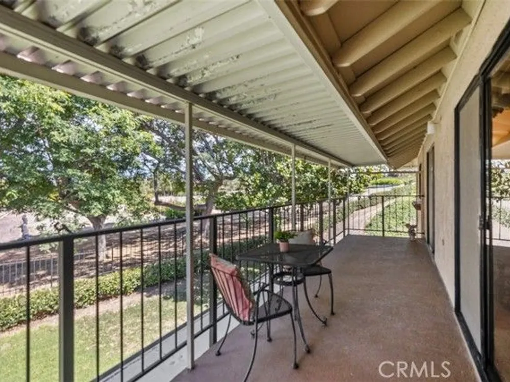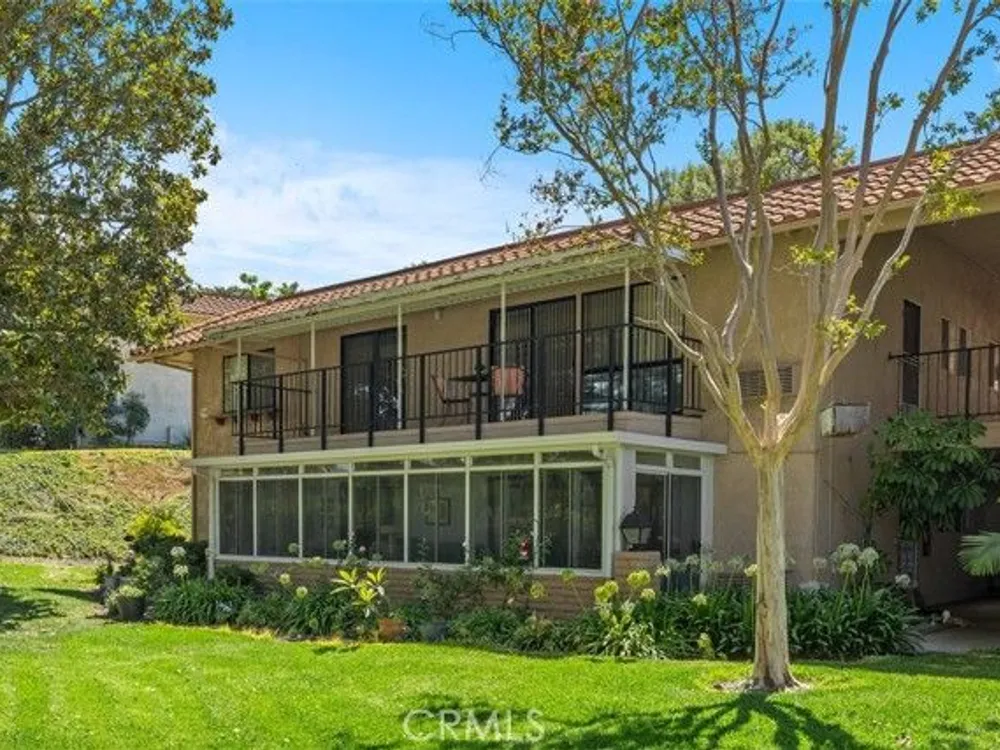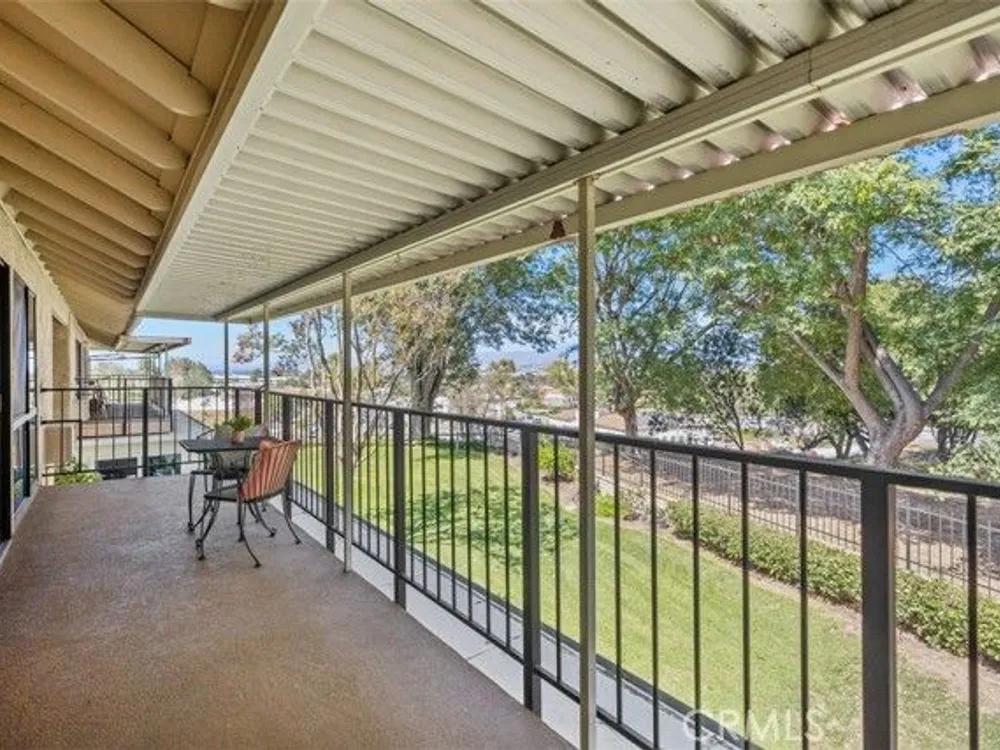 PANORAMIC TREETOP AND MOUNTAIN VIEWS. This popular "CASA VISTA" model has no stairs, no one above, and an end location, which features in-unit laundry and is situated above an expansive greenbelt with beautiful open views from the balcony. The model offers the relaxed indoor-outdoor lifestyle that many buyers seek in Laguna Woods. The sliding glass doors in the living room open to an extra-long covered balcony that is perfect for morning coffee, afternoon reading, and barbecuing while you enjoy the scenery. Also, a fantastic location between gates 7 and 8. The kitchen offers abundant cabinetry, solid custom surface counters, a breakfast and serving bar, and a full suite of appliances that includes a cooktop, wall oven, microwave, dishwasher, and a side-by-side refrigerator. Both bedrooms are generous. The primary suite features a large walk-in closet and an ensuite bath. The guest bedroom opens directly to the balcony to enjoy the view and fresh breezes, along with natural light. The hall bath provides a convenient step-in shower and a stacked washer and dryer, which is a coveted feature in this community. Added comforts include multiple ceiling fans, wall AC units, neutral finishes, and excellent storage. This is an all-around wonderful home in every way possible! Add all this to the amenities offered by Laguna Woods Village. You have a winning combination -- 27-hole championship golf courses or the 9-hole executive par three courses, tennis, paddle tennis, lawn bowling, two fitness centers, seven clubhouses, five swimming pools, an equestrian center, gardening opportunities, an art studio, a world-class woodshop, over 200 clubs and organizations ensure you will never get bored here! Plus, free bus transportation around the community, nearby shopping, and bus trips. Also, there is a very economical RV storage area to park your RV. Country Club Living is at its BEST and just approximately 6 miles from beautiful Laguna Beach! Discover the best-kept secret in Orange County. Your dream lifestyle awaits—do not miss this rare opportunity! "SEE VIRTUAL VIDEO" and 3D TOUR"