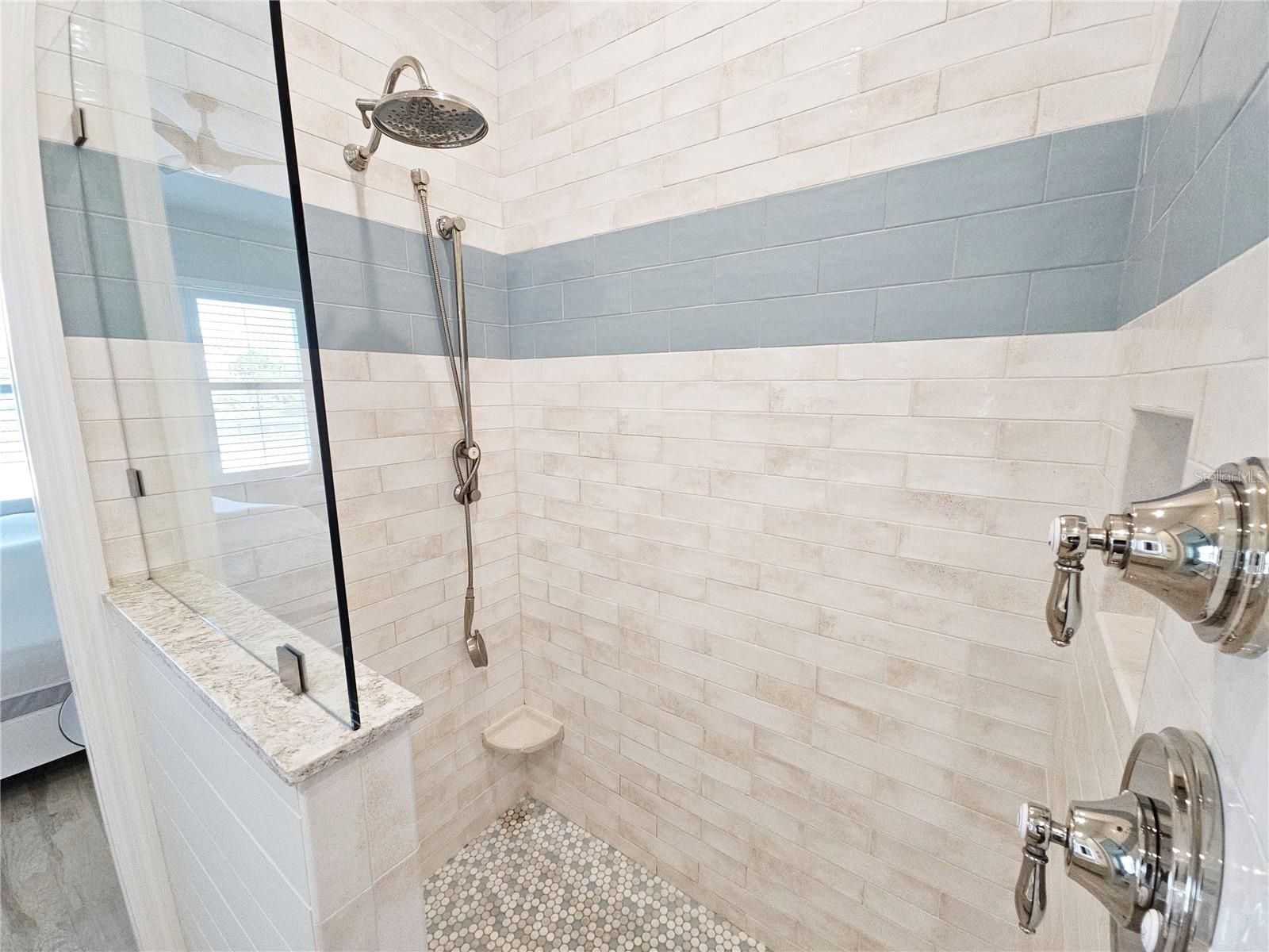 - Ceiling Fan(s), Eat-in Kitchen, High Ceilings, Kitchen/Family Room Combo, Main Level Primary, Solid Surface Counters, Solid-Wood Cabinets, Split Bedrooms, Walk-In Closet(s), Window Treatments