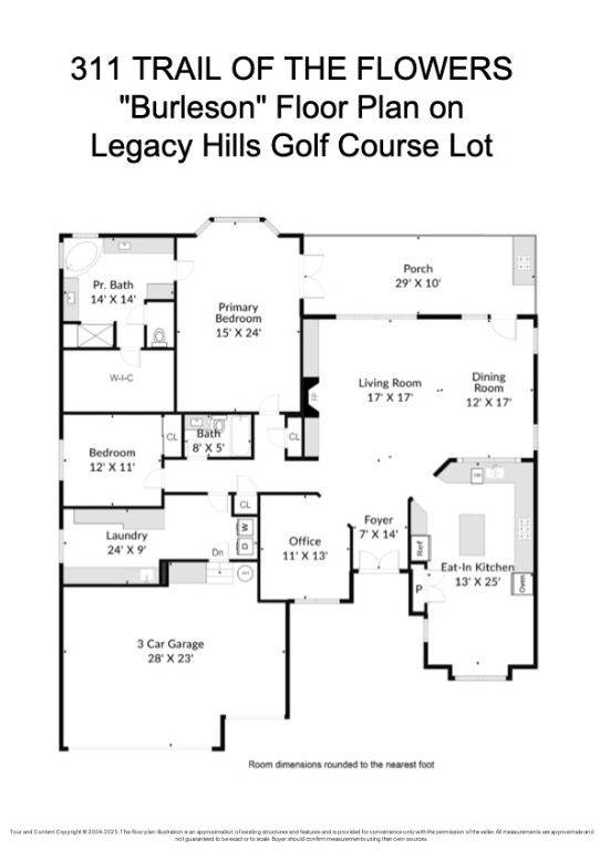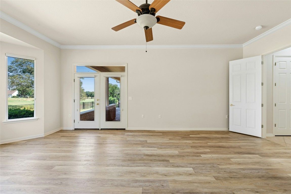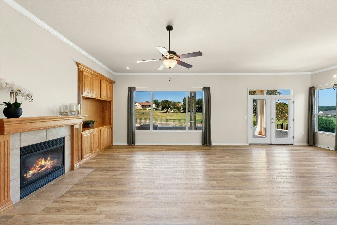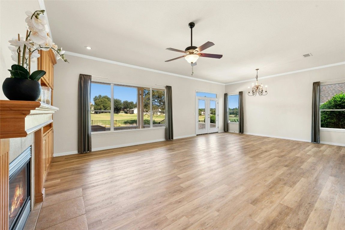 A beautiful Burleson floor plan by Del Webb sitting on a prime lot along the #7 fairway of the Legacy Oaks golf course. This Sun City home features 2 spacious bedrooms, a front study, formal living and dining areas and a 2-car garage with a separate bay ideal for golf cart parking. Step through the elegant double 8’ front doors into a home with soaring 10’ ceilings, crown molding, and upgraded Luxury Vinyl Plank flooring in the living areas paired with hard tile throughout—no carpet here! The kitchen is a cook’s delight with granite counters, a center island, Hickory wood cabinetry with pull-out cabinet trays and stainless steel built-in oven and microwave. The electric cooktop is pre-plumbed for gas if preferred. An oversized laundry room provides additional space perfect for a second office, craft room, or hobby area. Both bathrooms are upgraded with granite counters, and the main bathroom features a dual vanity and tiled walk-in shower. Enjoy serene golf course views from the main bedroom’s windows and private access to the extended covered back porch and generous patio. The fully fenced and landscaped backyard provides both beauty and privacy. Recent updates include: • 2025 Interior Paint • 2025 A/C • 2020 Water Heater • 2020 Roof • 2016 Furnace