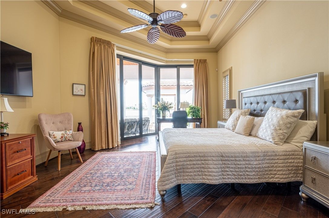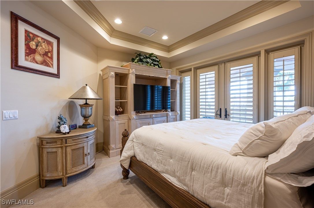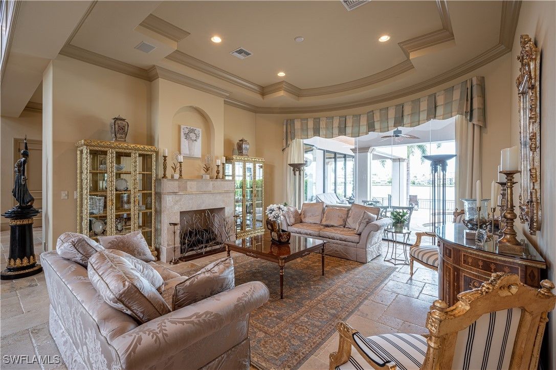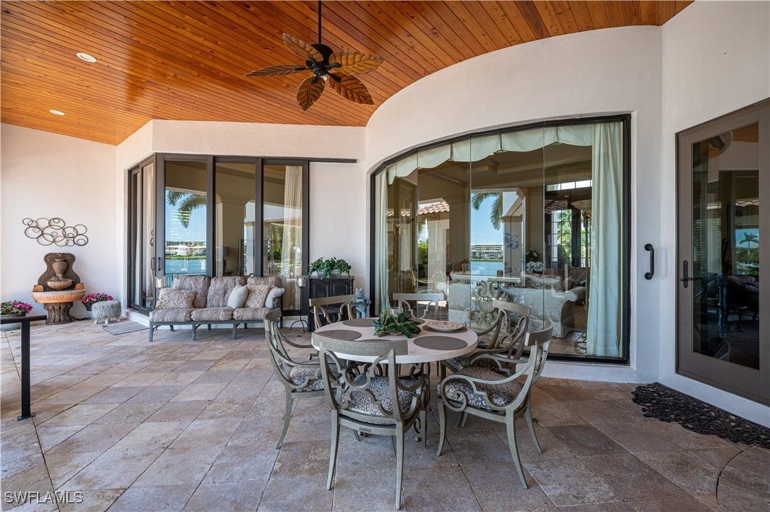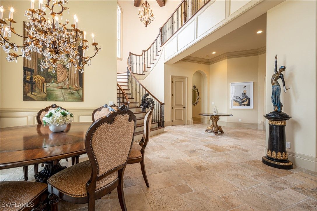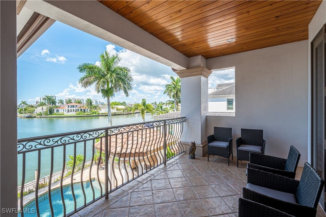 High and dry no Ian damage, water line only half up the driveway! House sits on hill. Available Today - move in ready! A stunning mansion, perfectly located in the Moorings with excellent deep wide bay views and soothing sunsets! The front foyer leads you up a winding staircase to the 2nd floor personal library, showcasing the lots of wood floorings and gorgeous, wood beam, coffered ceilings. Fully equipped with a top-of-the-line kitchen, exterior grilling accommodations, and an amply spaced 4-car garage -- this home will not disappoint! With over 5000 square feet of living area, full furnishings, and a fully heated pool/spa for optimal end-of-day relaxation, there is plenty of room to unwind. Just a few steps take you from the custom lanai to the boat dock, ready for your next adventure.