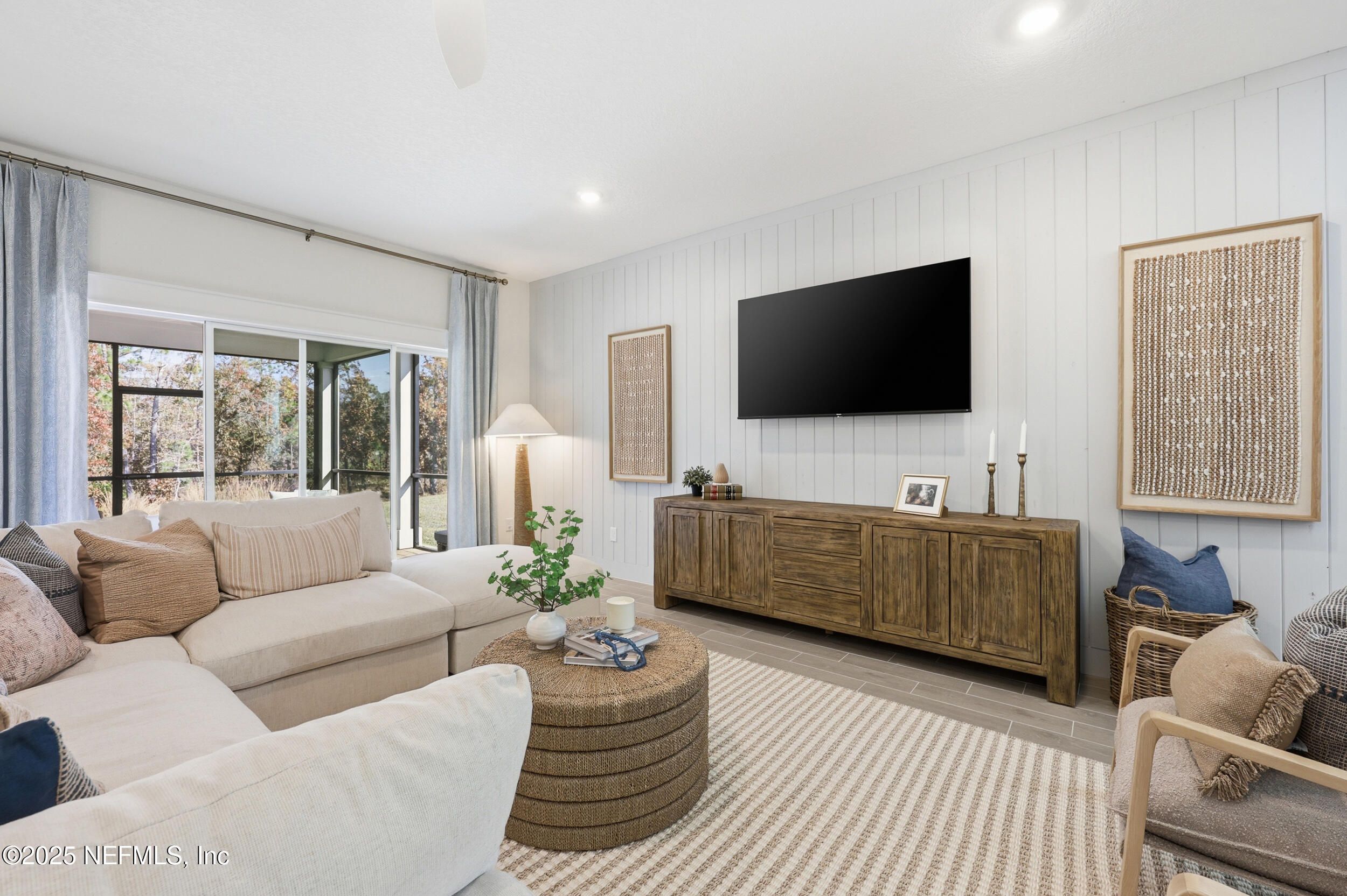 55+Actice Adult New Construction Model home, Sierra II floorplan, 4 bedrooms, 2.5 baths, plus flex/den, and a 2-car garage. This beautifully designed home features a paver driveway and entry, wood-look tile throughout (no carpet), crown molding, blinds, w/ gold-tone lighting. The flex space showcases a slatted wood ceiling and wood paneling accents extend into the entryway. The gourmet kitchen includes white cabinets, white quartz counters, double wall ovens, a 5-burner electric cooktop, microwave, stainless fridge and sink, and a walk-in pantry. The open living/dining area features a slat-wood accent wall & fan/light, leading to the screened paver lanai through 2-panel sliders with preserve-to-road views. Guest rooms include custom molding and panel features, plus a full bath with walk-in shower & a separate half bath. The primary suite offers wood panel detailing, gold fixtures, a large walk-in closet, double sinks, & an upgraded rain-head shower. A stunning move-in ready home.