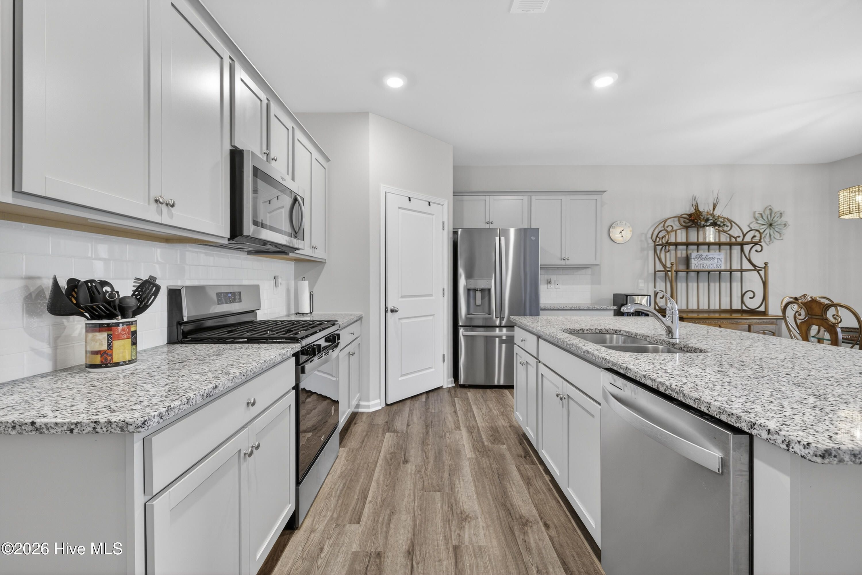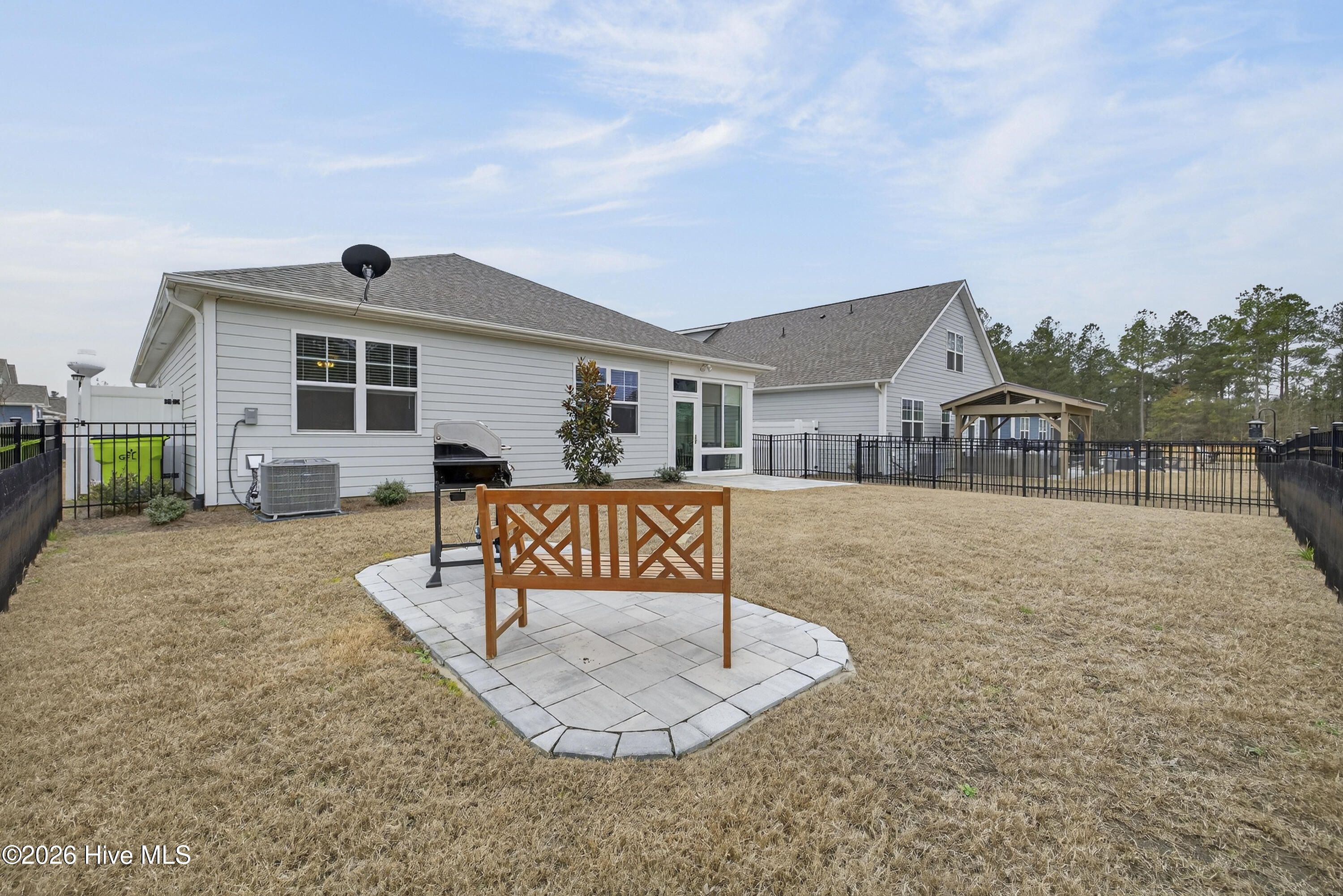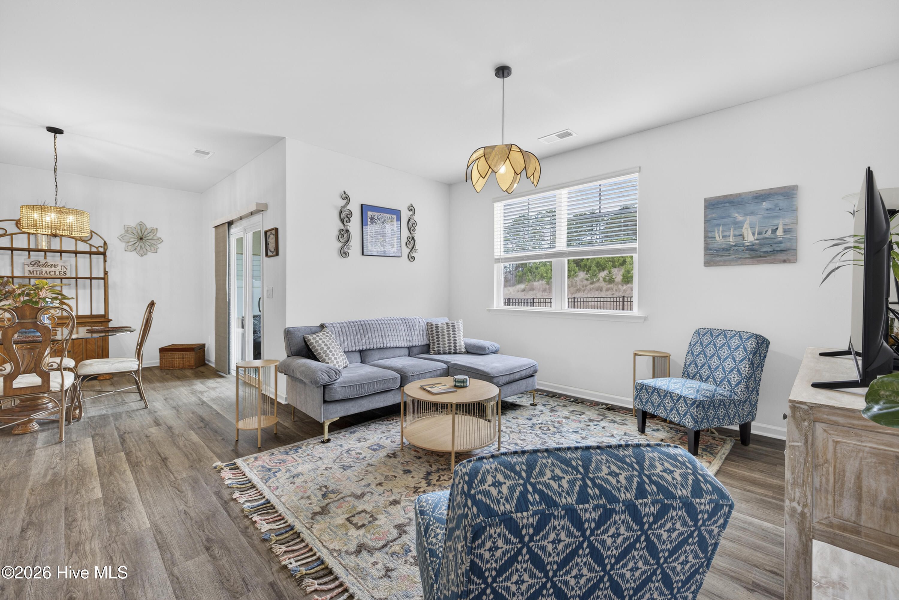 Located in Hazel Branch at Brunswick Forest, 3113 Lochgreen Drive features the popular Cali floorplan--a spacious one-story home with four bedrooms and an open-concept layout designed for comfortable living and easy entertaining. The kitchen offers granite countertops, stainless steel appliances, including a natural gas stove, and a large island that flows seamlessly into the living and dining areas. LVP flooring runs throughout the living areas and all bedrooms. The primary suite is located off the main living space and includes an ensuite bath along with a walk-in closet and a second large closet for extra storage. Three additional bedrooms and a shared bath are situated toward the front of the home. A bright sunroom overlooks the fully fenced backyard and opens to patios that create inviting outdoor spaces for relaxing or entertaining. The home also includes ADT smart home technology with a touchscreen interface, video doorbell, smart thermostat, and door lock, along with a natural gas water heater. Lawn maintenance is included in the HOA dues, allowing for low-maintenance living while enjoying Brunswick Forest's resort-style amenities, including outdoor pools and an indoor pool, fitness and wellness centers, tennis and pickleball courts, basketball, parks, a dog park, and miles of walking trails. The Villages at Brunswick Forest are located at the community entrance and offer convenient access to restaurants, medical offices, shops, and a grocery store. Historic Downtown Wilmington and the beautiful beaches of Wrightsville Beach, Carolina Beach, and Oak Island are just a short drive away, offering the perfect balance of comfort, community, and coastal living.