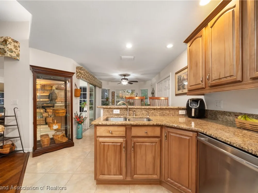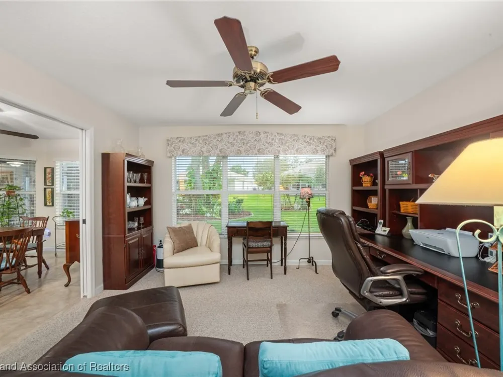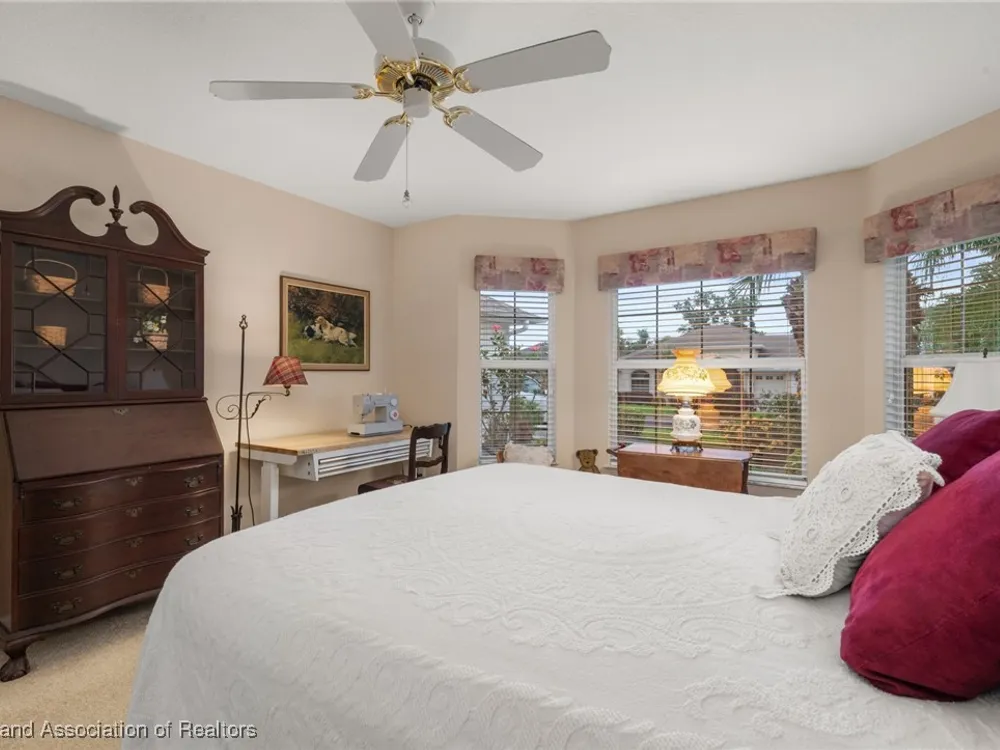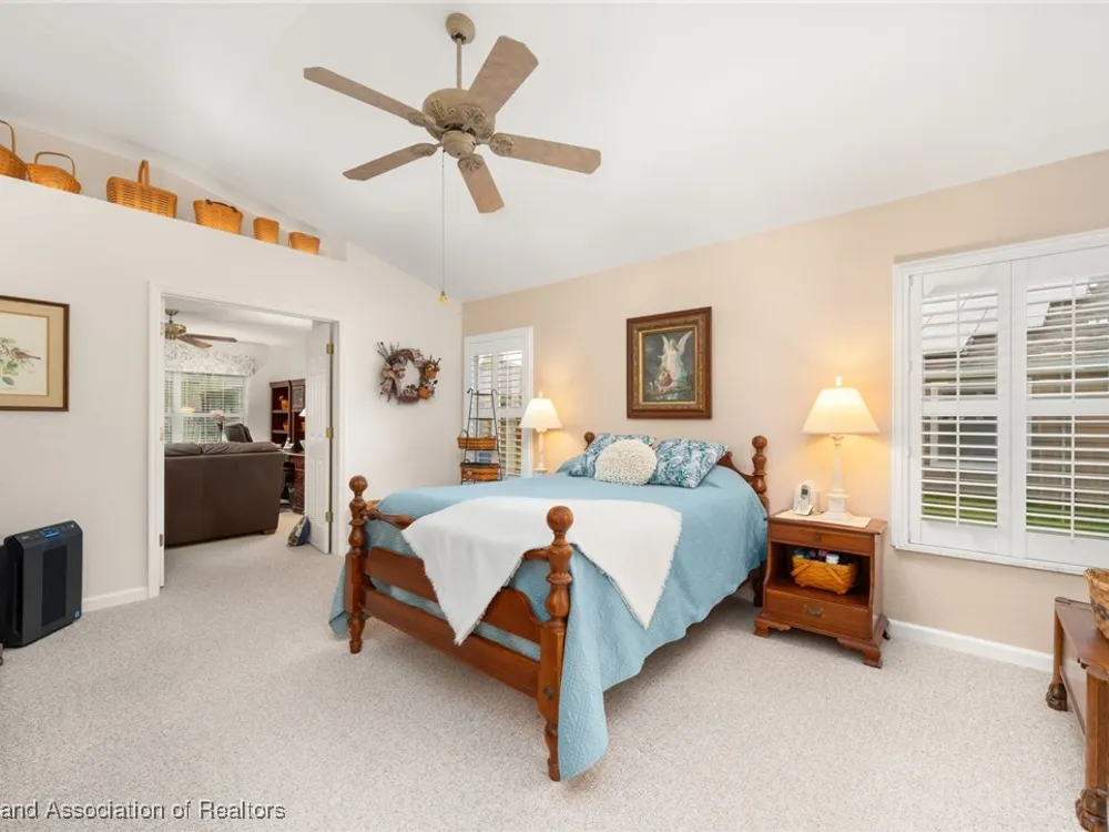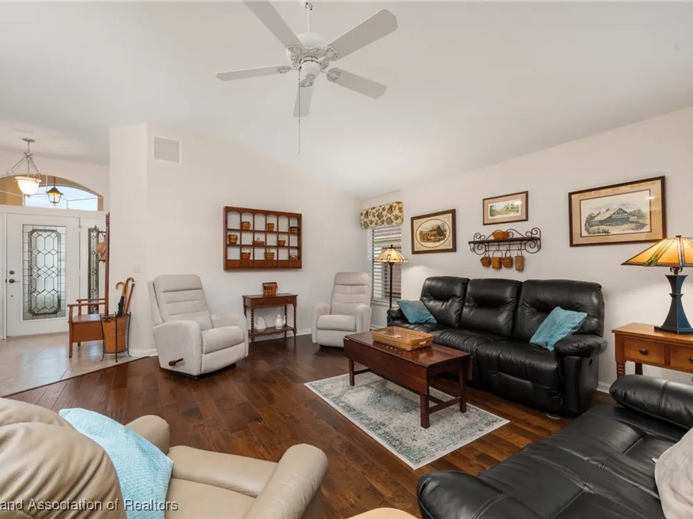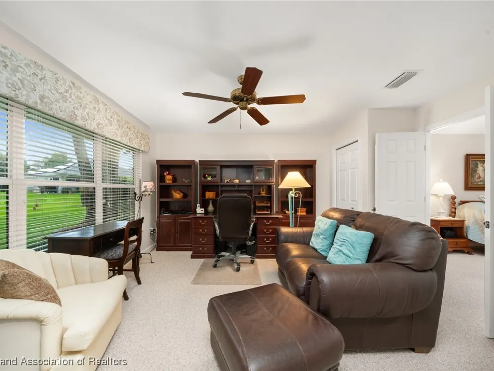 LOCATION! LOCATION! This Highlands Ridge home is located near the entrance and community center. No worries about losing power with the whole house Generac and 500 gallon propane tank in 2021, new roof in 2022, save $$ with the well irrigation, and HVAC with upgrade filter replaced in 2015. The 3 Bedroom, 2 Bath plus a Bonus room gives you plenty of room for entertaining. The central kitchen has granite counters, stainless steel appliances with the dining area at the end of kitchen with nice views of the landscaped backyard. The living room has a lighted overhead plant shelf, engineered hardwood flooring. Entrance to the bonus room can be from the living room or dining area. The owners suite, designed to comfortably fit a king-sized bed, with a lighted plant shelf, two walk-in closets features a generous bathroom with a walk-in shower with grab bars, and double vanities. Third bedroom/den has an entry from the owners suite and the dining area. Large private guest bedroom and 2nd bath located in the front of the home. Large screen porch off the bonus room overlooking the landscaped back yard. Laundry room exits into the kitchen along with entry to the two car garage plus golf cart garage. (a 2020 Club Car 4 seat Onward is available for sale). Garage has a built in work bench, with wall mounted cabinets, storage shelves as well as overhead storage in attic. The hot water tank has a Thermal Expansion Tank attached. Amenities include lawn care, community center with card room, Library, two outdoor heated pools, hot tub, fitness center, golfing, pickleball courts, tennis courts, shuffleboard, bocci ball and more.