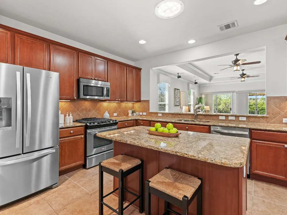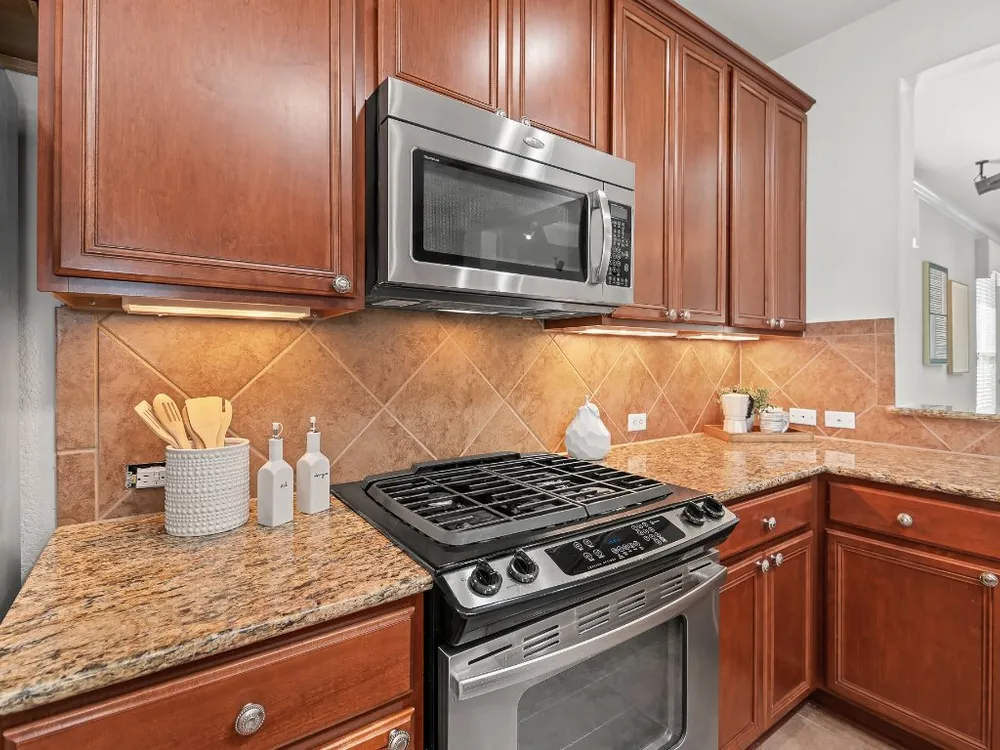 - Dishwasher, Free-Standing Gas Range, Disposal, Gas Water Heater, Microwave, Oven, Plumbed For Ice Maker, Refrigerator, Stainless Steel Appliance(s), Water Softener, Vented Exhaust Fan