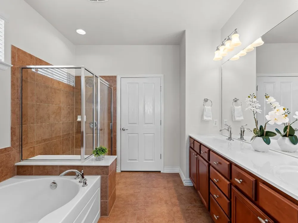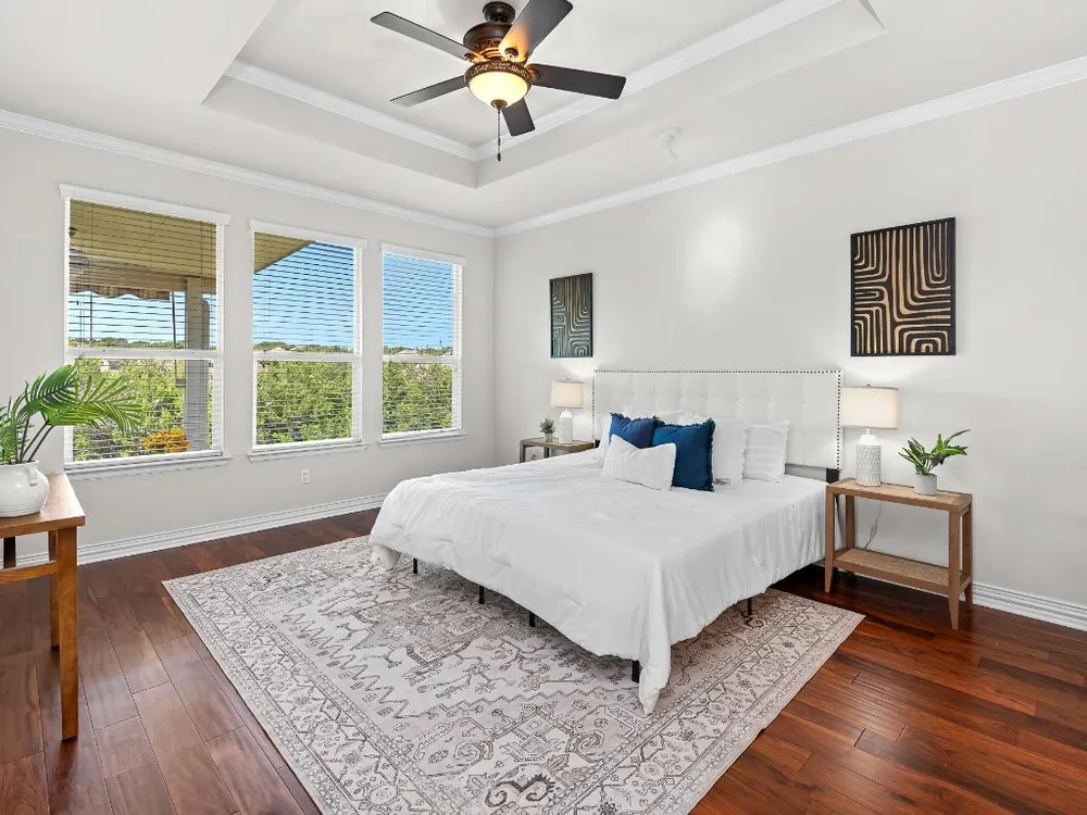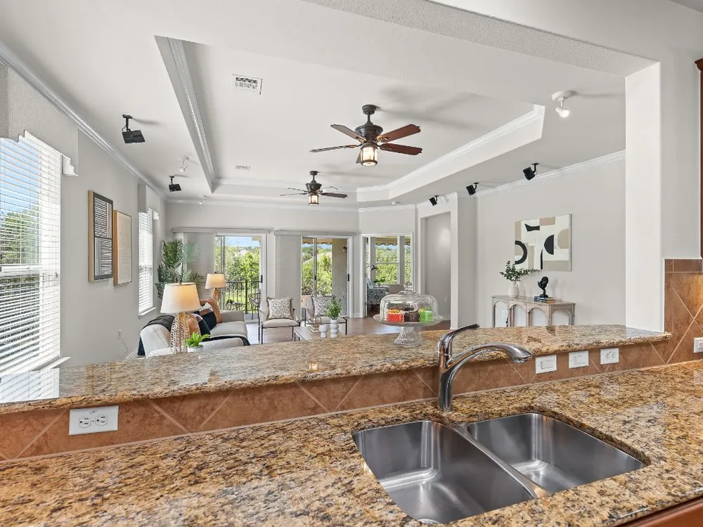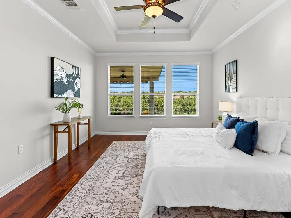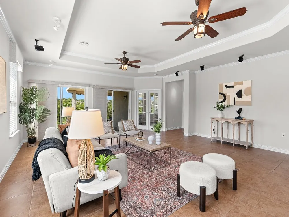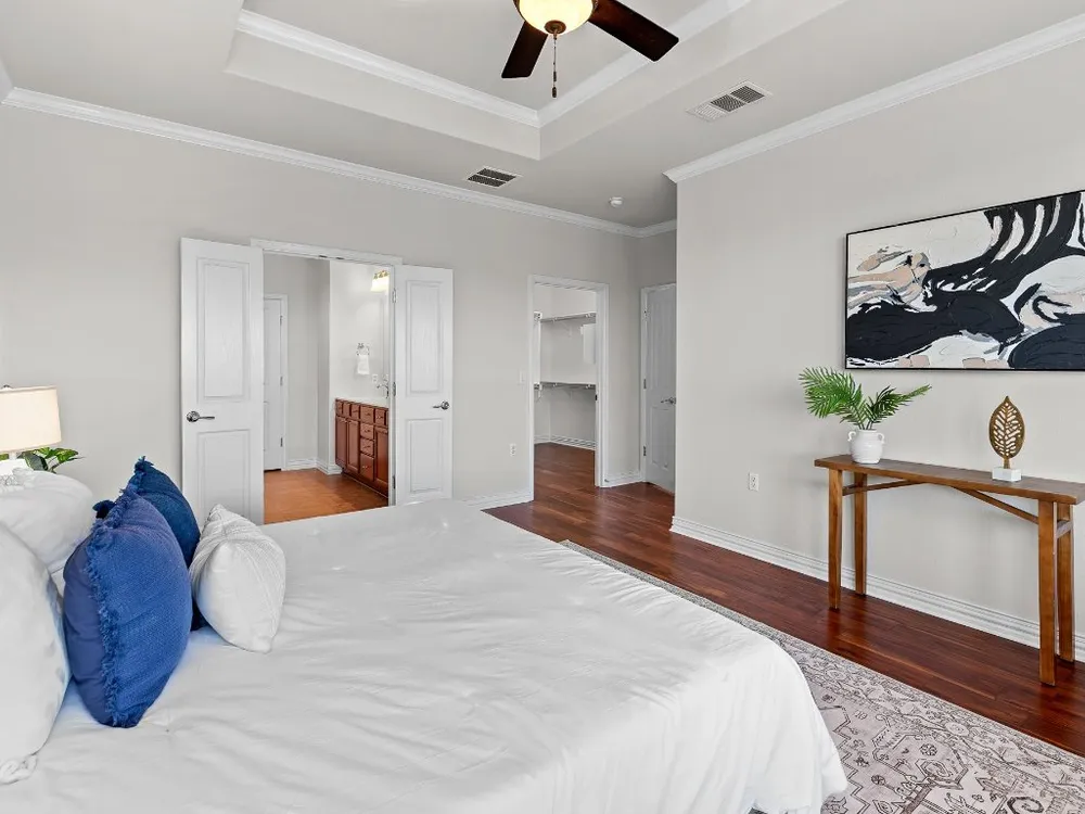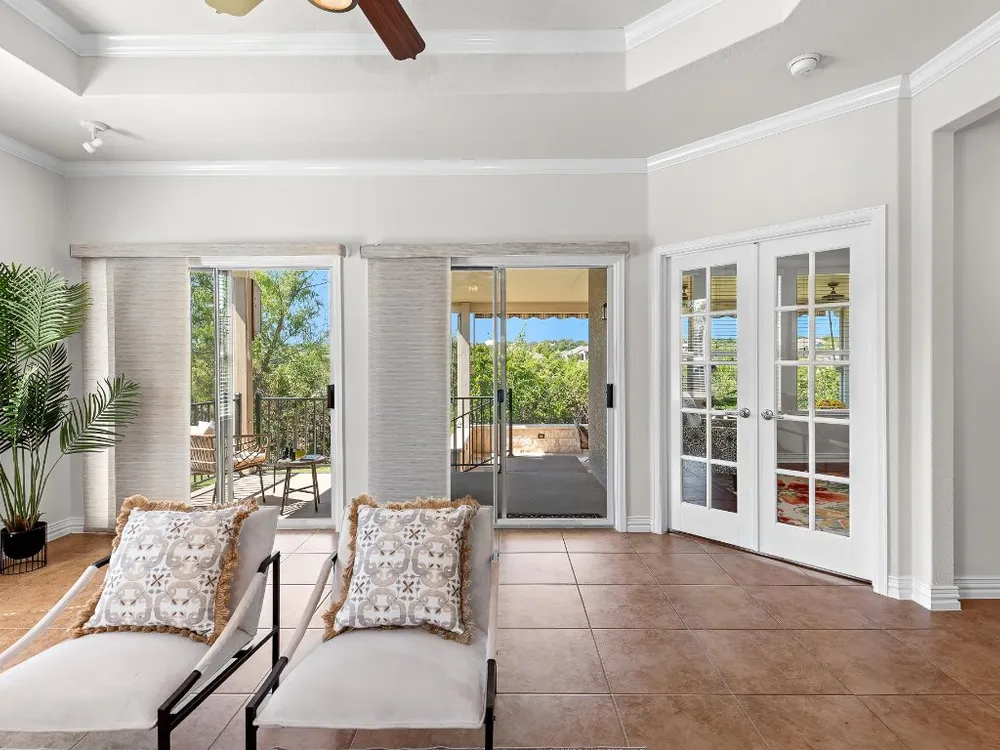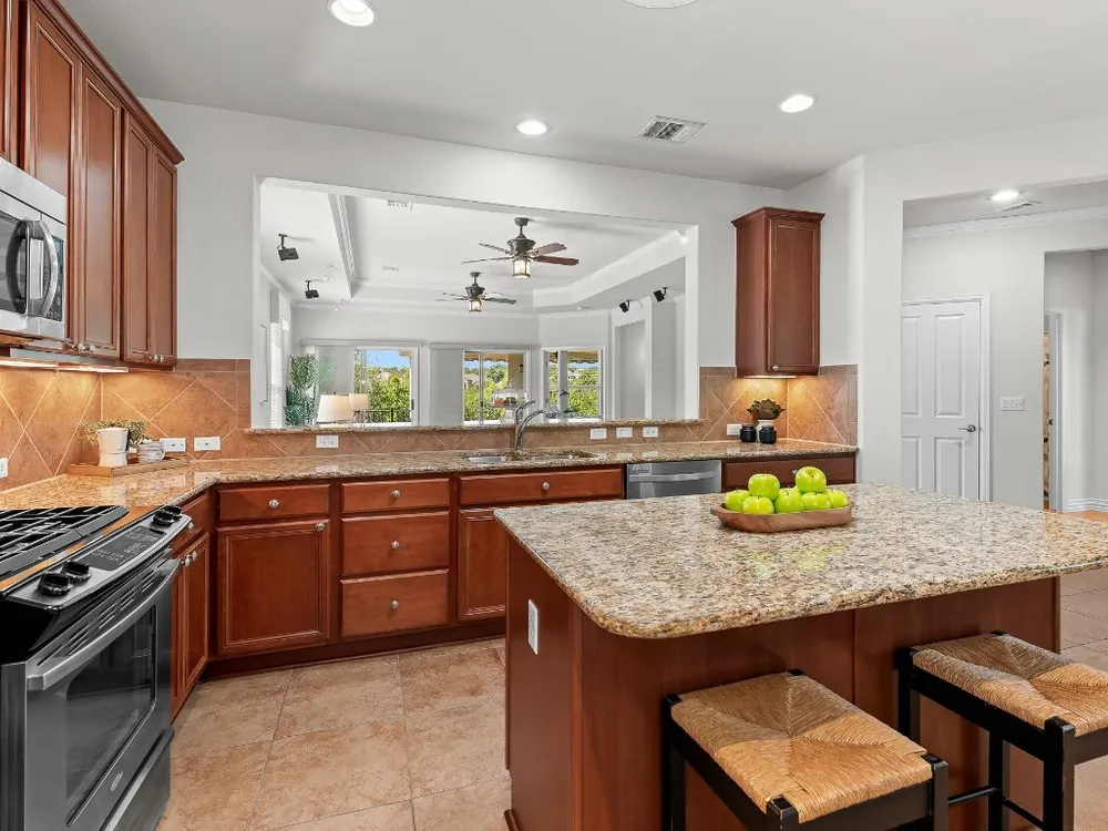 - Tray Ceiling(s), Ceiling Fan(s), Chandelier, Crown Molding, Separate/Formal Dining Room, Double Vanity, Eat-in Kitchen, French Door(s)/Atrium Door(s), Granite Counters, Kitchen Island, Multiple Dining Areas, Main Level Primary, NoInteriorSteps, Open Floorplan, Pantry, Recessed Lighting, Soaking Tub, Natural Woodwork, Walk-In Closet(s), Wired for Sound, High Speed Internet