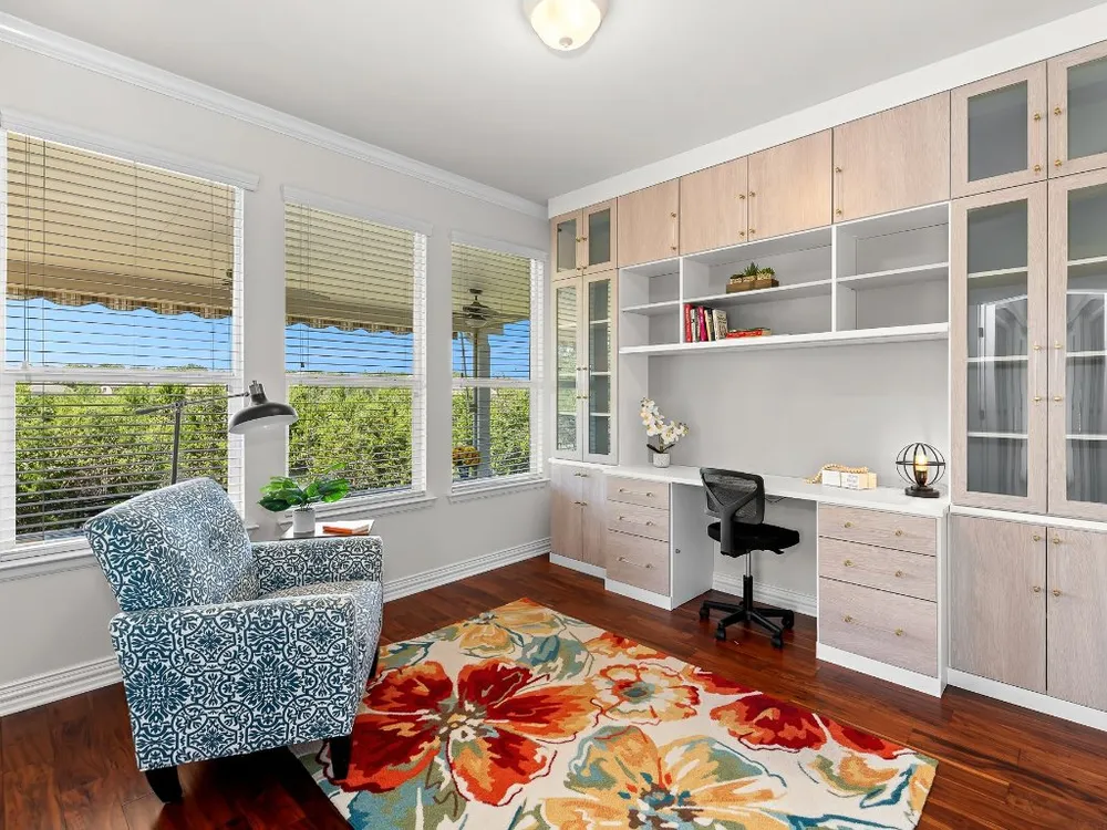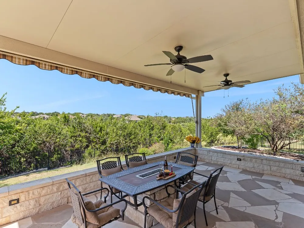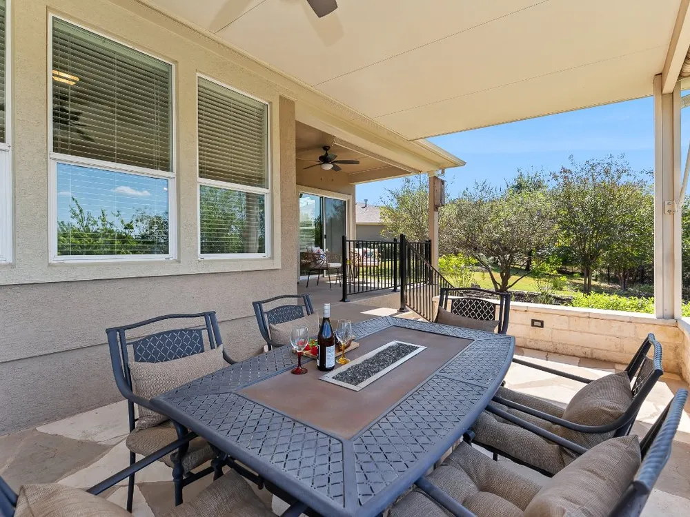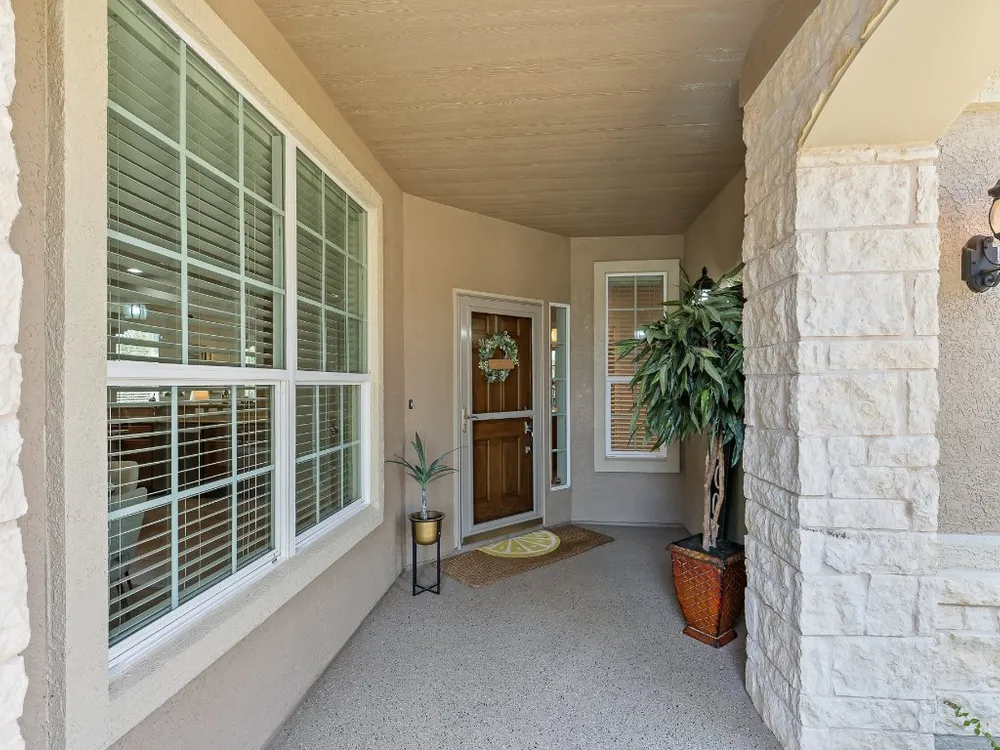 Looking for privacy, in a move-in ready home? This Surrey Crest is on a cul-de-sac, greenbelt lot, and with the built-in firepit under the covered extended patio, the sunsets are yours to enjoy. Automatic SunSetter awning, wood and tile floors (no carpet), interior painted Sept. 2025, exterior painted Mar. 2025, it is move-in ready! Office with wall of built-ins by California Closets has french doors, and greenbelt views. Spotlights for your special pieces of art, Bose surround sound, professionally landscaped yard, tray ceilings in living and bedroom, full-length glass storm door, and we're just getting started! Garage has overhead storage racks, cabinets, and epoxy coated floor and driveway. Partially fenced yard plus an Invisible Fence system. Upgraded baseboards, whole house water filtration system and water softener, and solar tube in kitchen. Sunny laundry room offers more storage, and sink too. Level driveway and no steps in front or garage. If being a part of Sun City's 55+ community is next on your list, this home is ready and waiting- just unpack your bags! Pre-inspected also, for your buying confidence.
