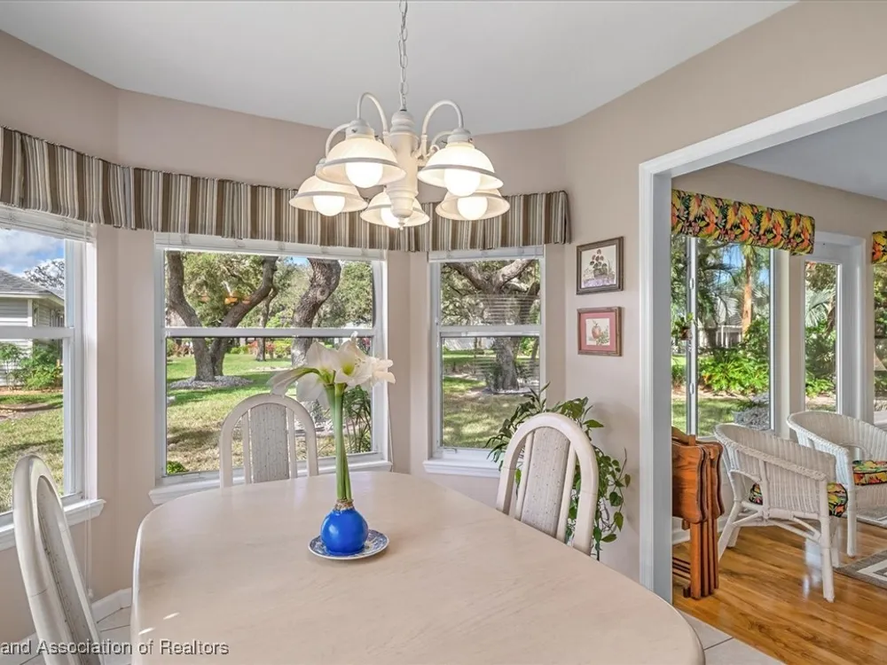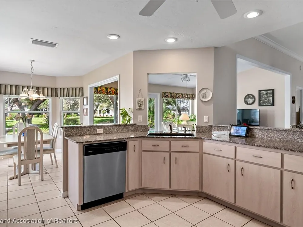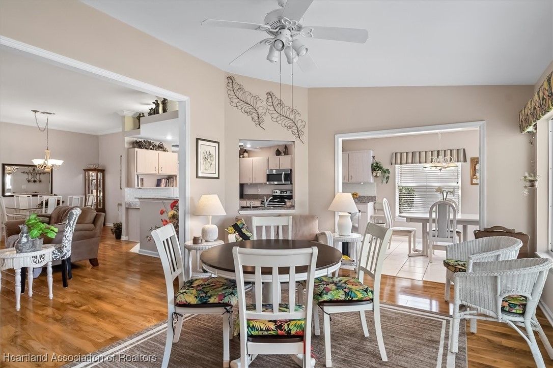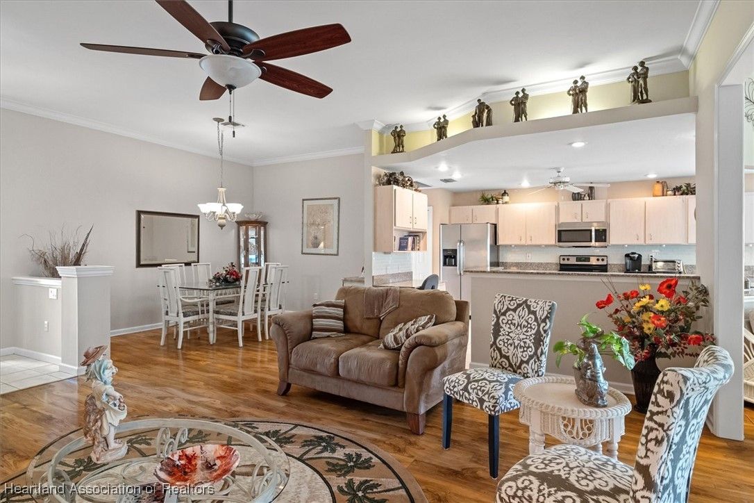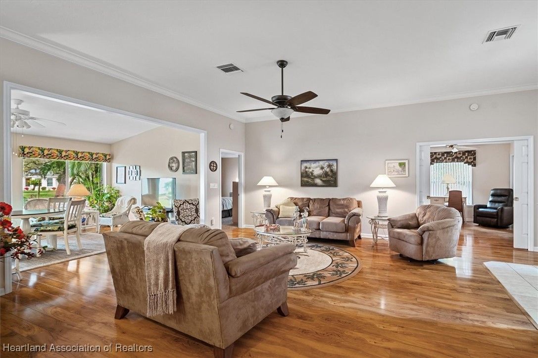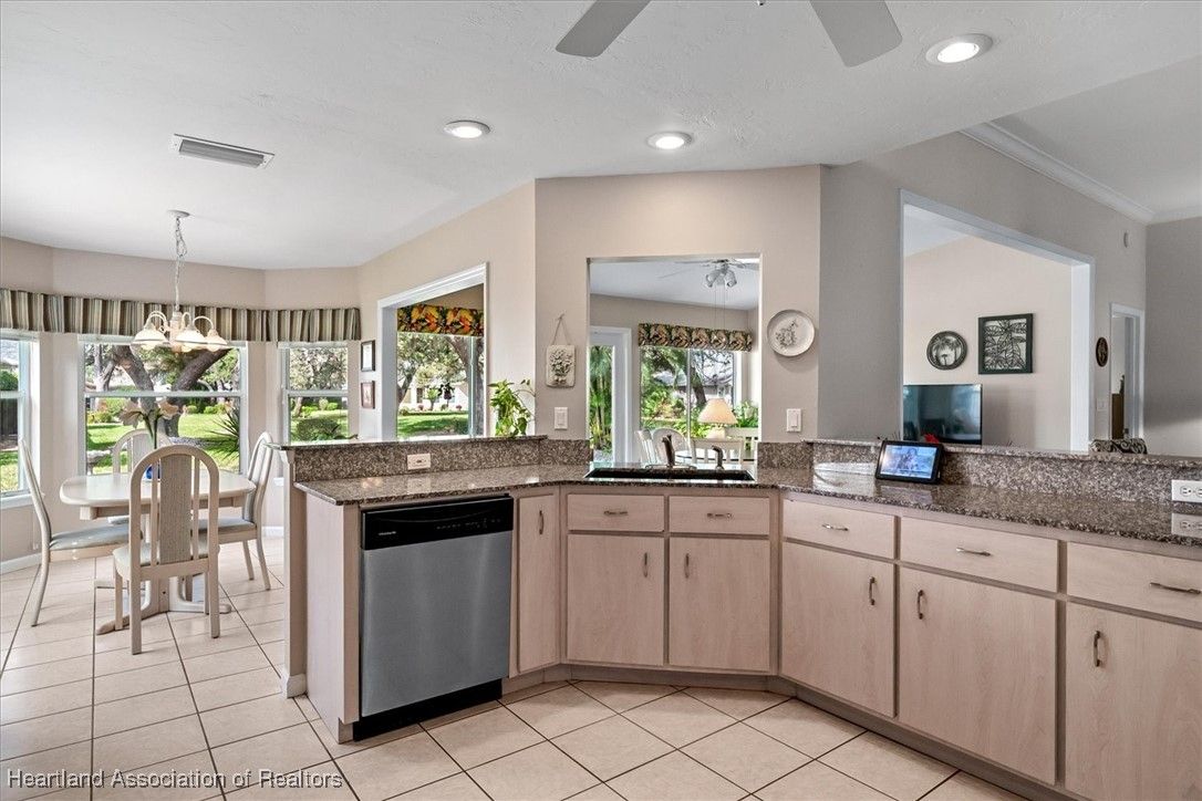 MOVE-IN READY, FULLY FURNISHED+GOLF CART, ONE-OWNER HOME! This lovely home in Highlands Ridge is a retiree's dream! Open plan, 3 bedrooms, 2 baths, 2-car garage, 2018 roof. The spacious updated kitchen is open to the living area and features an abundance of cabinets, granite countertops, stainless steel appliances, built-in desk, pantry, breakfast bar & nook overlooking the lushly landscaped backyard. You'll find crown molding and beautiful wood laminate flooring in the formal dining room, living room and family room. The primary bedroom features a cove ceiling, his & her closets, and a gorgeous updated bathroom with dual sink vanity with granite top, and tiled walk-in shower with bench seat. There are two guest bedrooms and an updated guest bath with granite. One of the guest bedrooms has pocket doors and would make a nice in-home office if needed. The family room has a wall of windows looking out to the beautiful backyard and patio. There's also a convenient inside laundry room, and the garage has a sink and cabinets for storage. On the outside you'll find a screened front entry, rain gutters, and nicely landscaped lawn with decorative curbing. This home has been very well maintained inside & out. Highlands Ridge is an active 55+ gated, golf course community with tennis, pickle ball, shuffleboard, 2 pools, a community center and restaurant. Come retire in style! Seller has a golf membership. There is no golf initiation fee for new buyers.