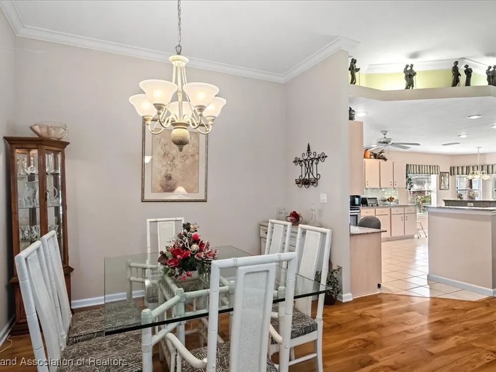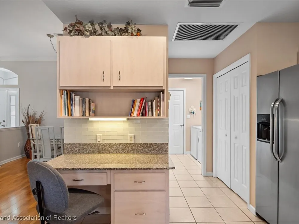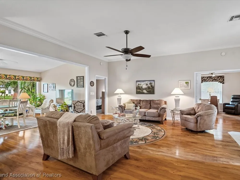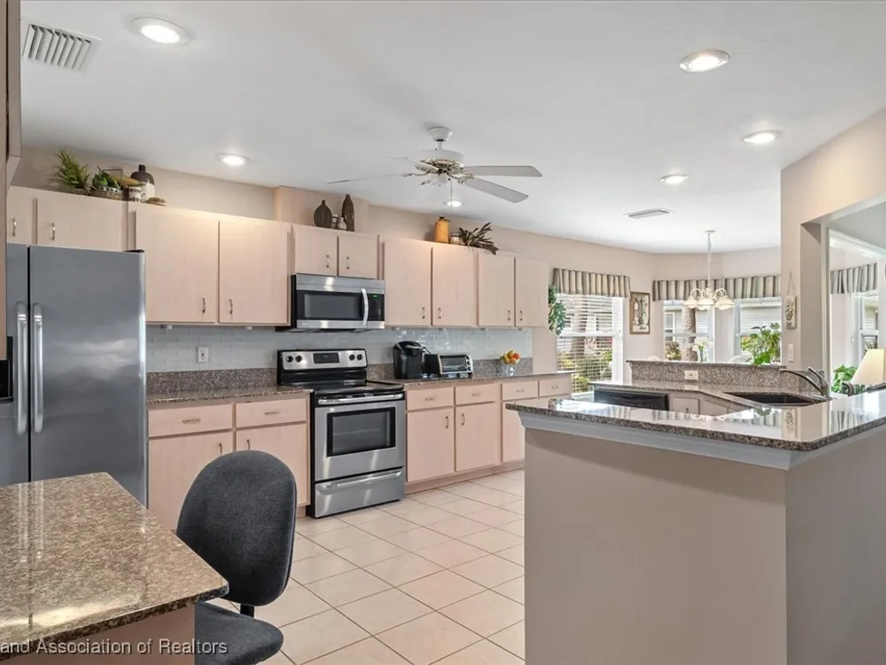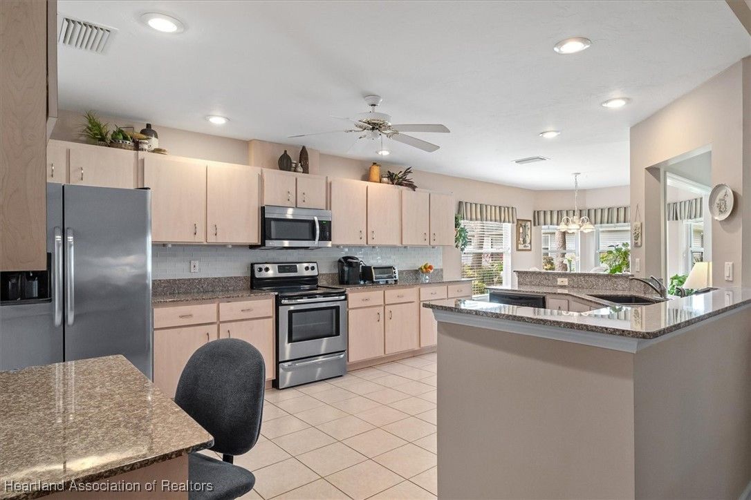 MOVE-IN READY, FULLY FURNISHED+GOLF CART, ONE-OWNER HOME! This lovely home in Highlands Ridge is a retiree's dream! Open plan, 3 bedrooms, 2 baths, 2-car garage, 2018 roof. The spacious updated kitchen is open to the living area and features an abundance of cabinets, granite countertops, stainless steel appliances, built-in desk, pantry, breakfast bar & nook overlooking the lushly landscaped backyard. You'll find crown molding and beautiful wood laminate flooring in the formal dining room, living room and family room. The primary bedroom features a cove ceiling, his & her closets, and a gorgeous updated bathroom with dual sink vanity with granite top, and tiled walk-in shower with bench seat. There are two guest bedrooms and an updated guest bath with granite. One of the guest bedrooms has pocket doors and would make a nice in-home office if needed. The family room has a wall of windows looking out to the beautiful backyard and patio. There's also a convenient inside laundry room, and the garage has a sink and cabinets for storage. On the outside you'll find a screened front entry, rain gutters, and nicely landscaped lawn with decorative curbing. This home has been very well maintained inside & out. Highlands Ridge is an active 55+ gated, golf course community with tennis, pickle ball, shuffleboard, 2 pools, a community center and restaurant. Come retire in style! Seller has a golf membership. There is no golf initiation fee for new buyers.