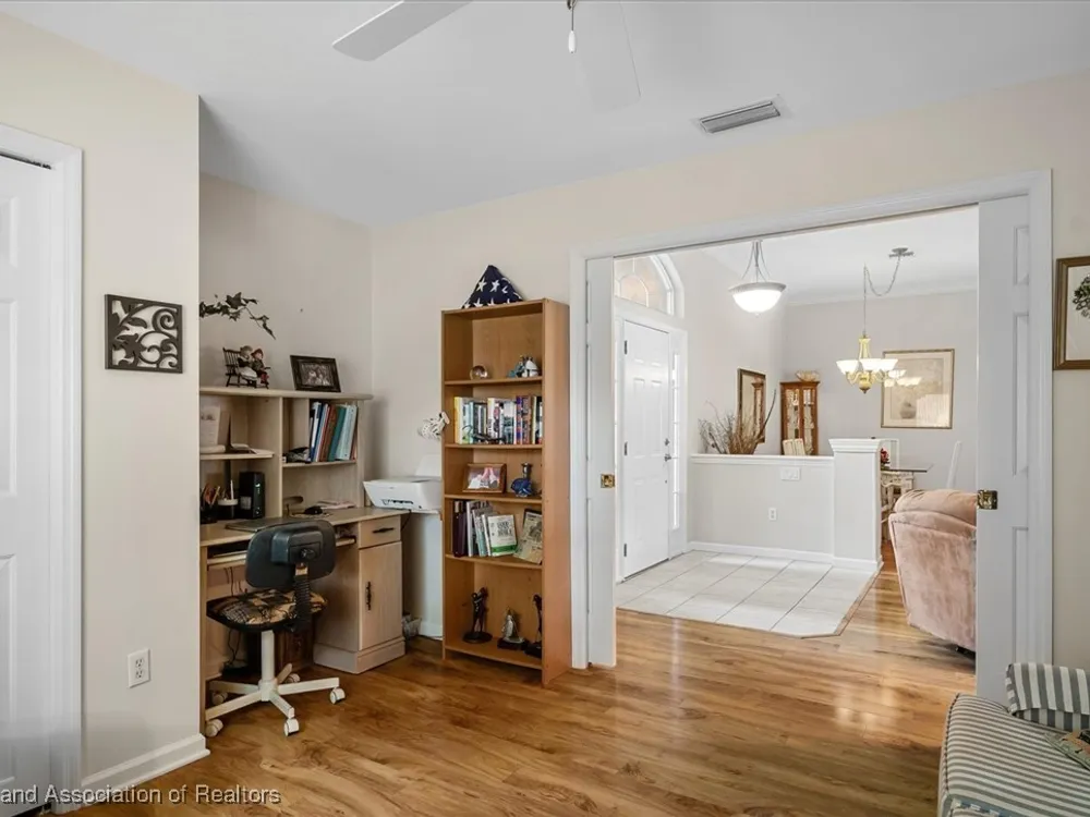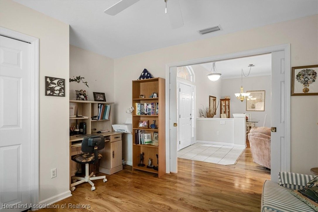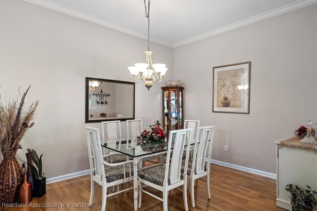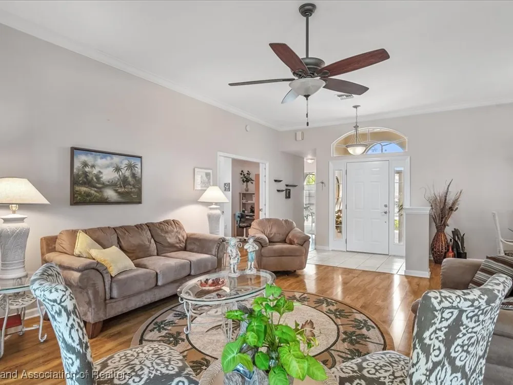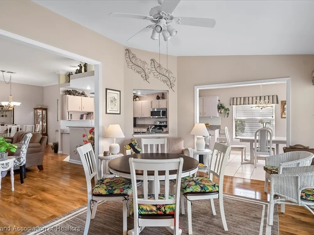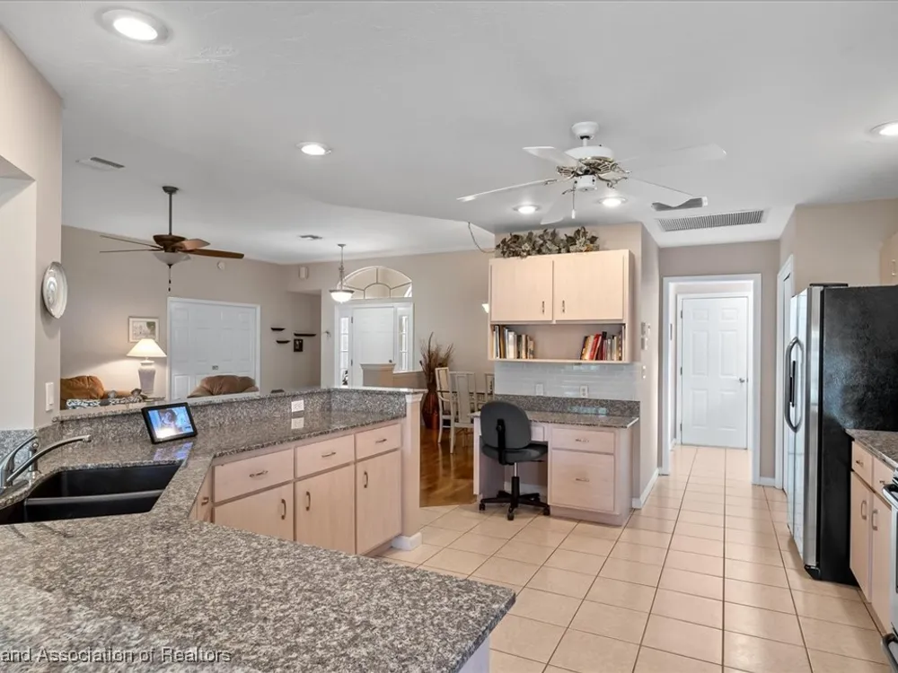 MOVE-IN READY, FULLY FURNISHED+GOLF CART, ONE-OWNER HOME! This lovely home in Highlands Ridge is a retiree's dream! Open plan, 3 bedrooms, 2 baths, 2-car garage, 2018 roof. The spacious updated kitchen is open to the living area and features an abundance of cabinets, granite countertops, stainless steel appliances, built-in desk, pantry, breakfast bar & nook overlooking the lushly landscaped backyard. You'll find crown molding and beautiful wood laminate flooring in the formal dining room, living room and family room. The primary bedroom features a cove ceiling, his & her closets, and a gorgeous updated bathroom with dual sink vanity with granite top, and tiled walk-in shower with bench seat. There are two guest bedrooms and an updated guest bath with granite. One of the guest bedrooms has pocket doors and would make a nice in-home office if needed. The family room has a wall of windows looking out to the beautiful backyard and patio. There's also a convenient inside laundry room, and the garage has a sink and cabinets for storage. On the outside you'll find a screened front entry, rain gutters, and nicely landscaped lawn with decorative curbing. This home has been very well maintained inside & out. Highlands Ridge is an active 55+ gated, golf course community with tennis, pickle ball, shuffleboard, 2 pools, a community center and restaurant. Come retire in style! Seller has a golf membership. There is no golf initiation fee for new buyers.