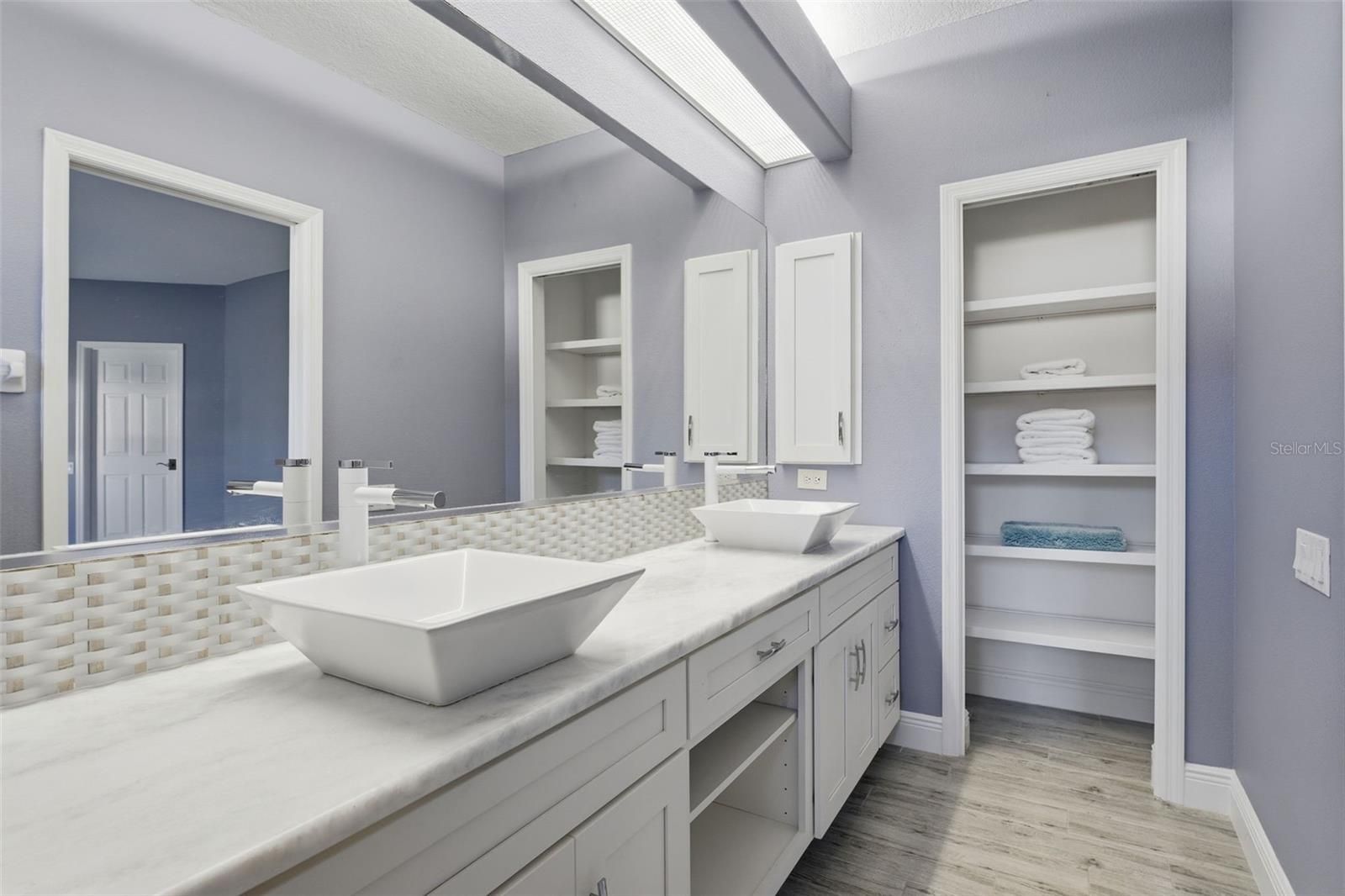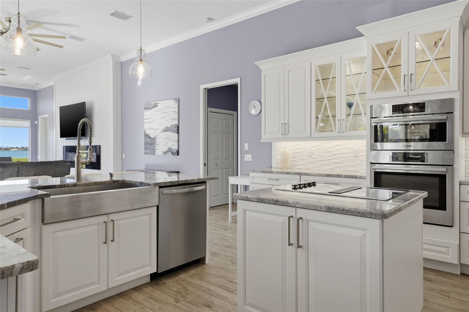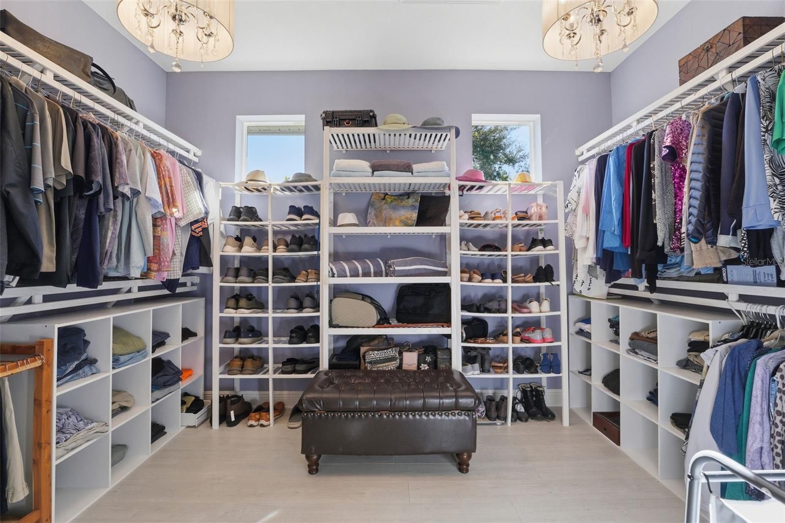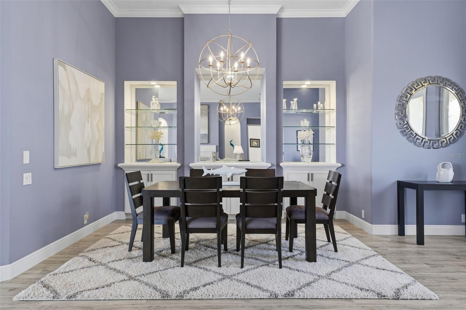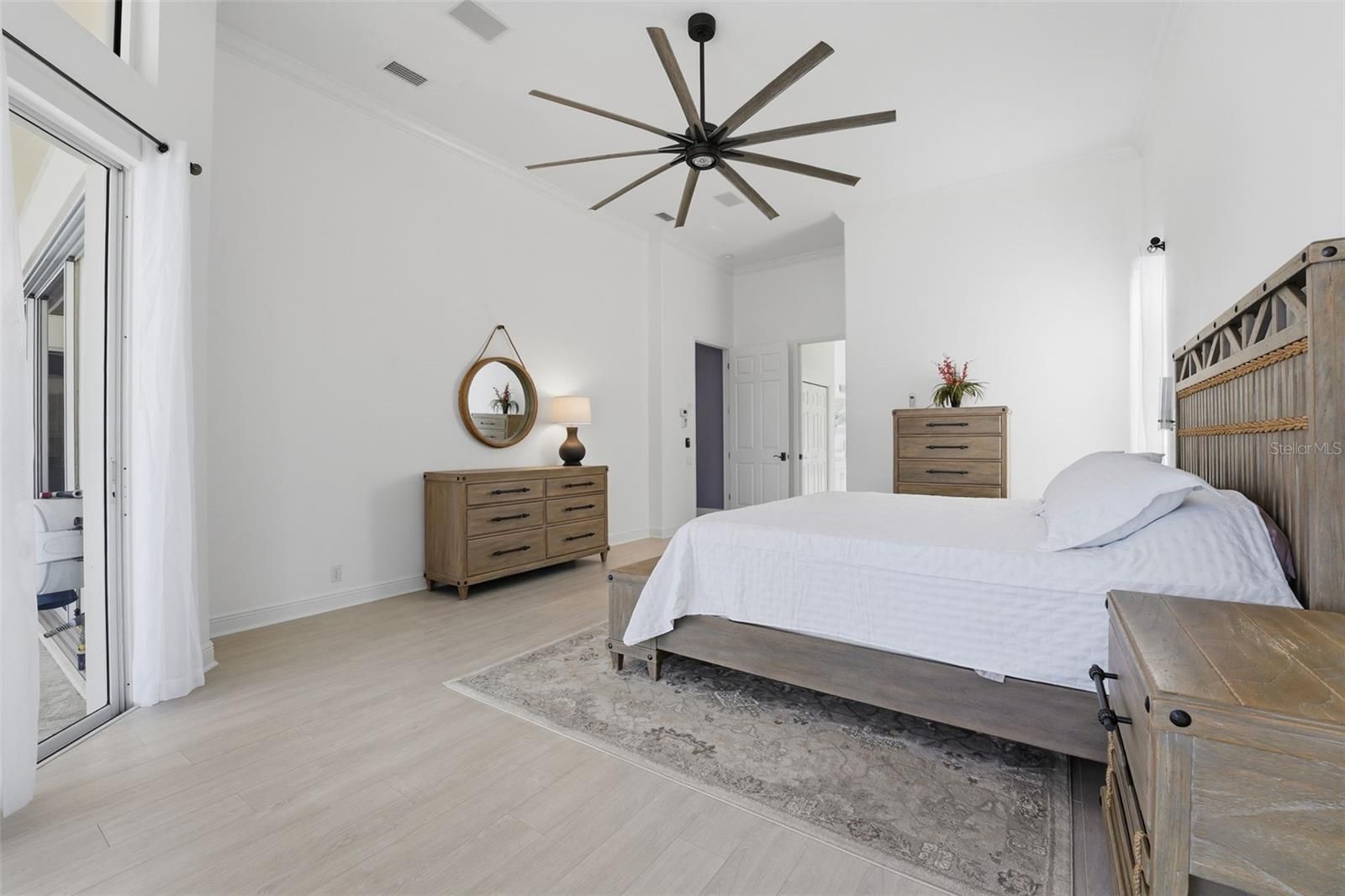- Ceiling Fan(s), Crown Molding, Eat-in Kitchen, High Ceilings, Kitchen/Family Room Combo, Living/Dining Room, Main Level Primary, Solid Surface Counters, Solid-Wood Cabinets, Split Bedrooms, Walk-In Closet(s), Window Treatments