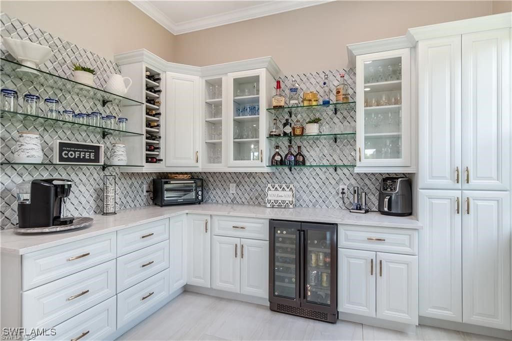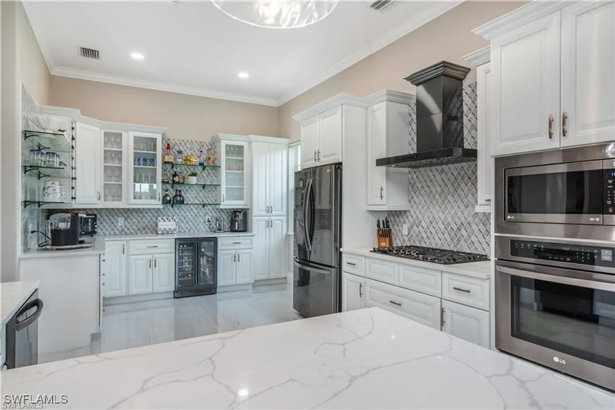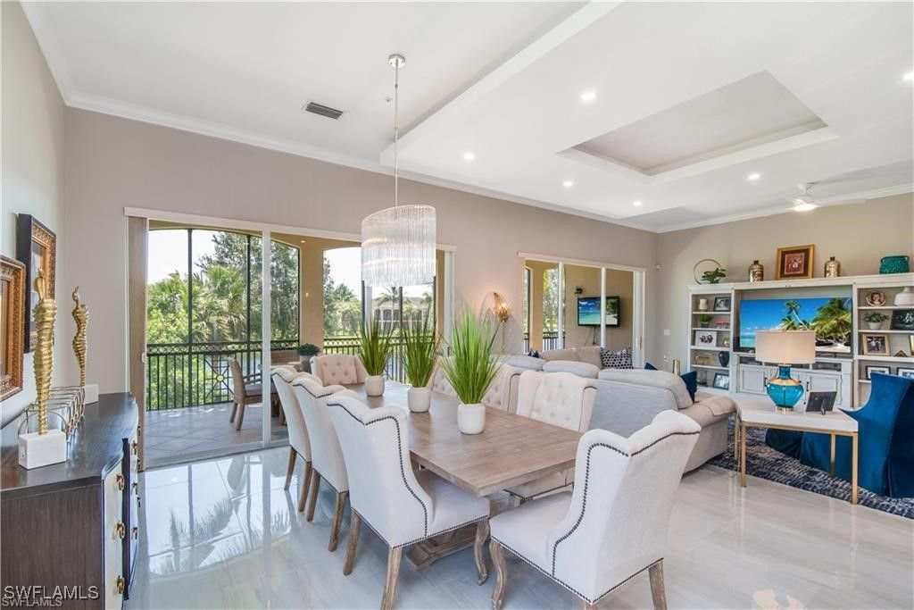 Exquisitely renovated second-floor residence offered fully furnished, blending sophisticated design with effortless elegance. The home has been artfully reimagined with select walls removed to create a light-filled, open-concept layout ideal for refined entertaining. The gourmet kitchen is a showpiece, featuring natural gas cooking, black stainless steel appliances, a beverage cooler, bespoke cabinetry, glass shelving, quartz countertops, and a designer backsplash, all complemented by generous storage. New terrazzo tile flows gracefully throughout the main living areas and entry, enhancing the home’s timeless yet contemporary aesthetic. The expansive lanai provides a serene retreat, overlooking a picturesque pond and lush tropical landscaping—perfect for morning coffee or sunset relaxation. Residents of Fiddler’s Creek enjoy an unparalleled resort-style lifestyle, highlighted by a 54,000-square-foot clubhouse and spa, state-of-the-art fitness center, championship golf courses, tennis, 10 pickleball courts, bocce, multiple dining venues, and an engaging calendar of curated social events. The intimate Marengo enclave also offers its own private community pool, completing this exceptional Naples living experience.