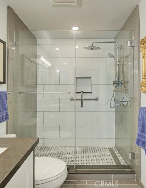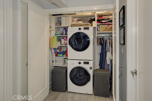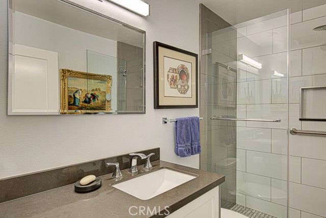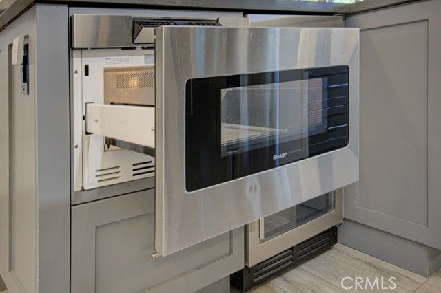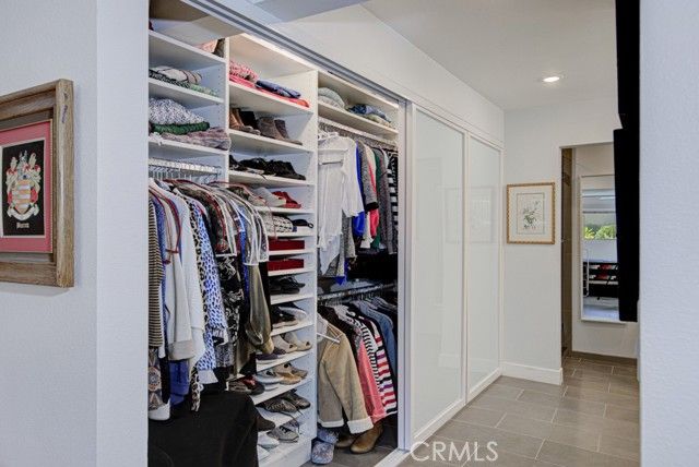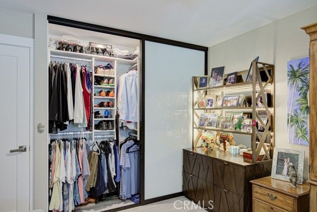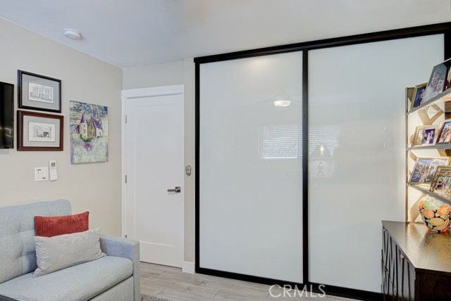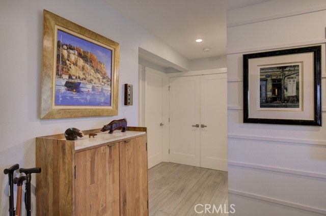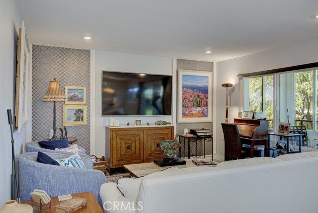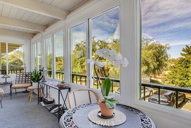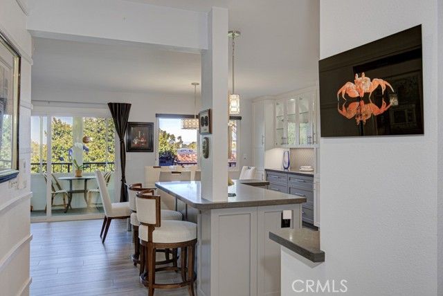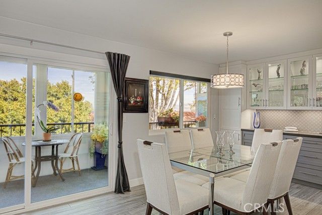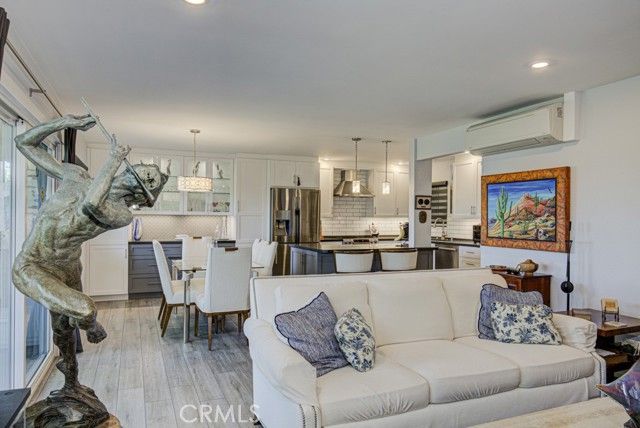 GREAT NEW PRICE! Exquisitely remodeled La Brisa residence in the highly sought-after 55+ community of Laguna Woods Village. This thoughtfully expanded home blends refined design, modern efficiency, and exceptional craftsmanship throughout. Step inside to soaring smooth ceilings raised to 8 feet, elegant recessed LED lighting with dimmers, and premium Cortec luxury vinyl flooring. The balcony sunroom has been largely enclosed to create additional interior living space, seamlessly enhancing the home’s open feel, while a dedicated outdoor portion remains—perfect for BBQs and relaxing amid tranquil tree-lined and distant mountain views. The designer kitchen is a true centerpiece, showcasing shaker cabinetry, quartz countertops, & a generous island with built-in microwave & wine refrigerator. High-end appliances include a Bosch dishwasher, induction range with exterior-vented chimney hood, and a Samsung four-door refrigerator featuring two convertible lower compartments that function as either refrigerator or freezer for ultimate flexibility. The dining area is enhanced by a custom built-in wall unit with accent lighting and abundant storage. Comfort and efficiency are paramount with dual-pane windows and slider, plus three Daikin split HVAC systems providing whisper-quiet climate control. Both bedrooms feature ceiling fans with remotes and custom closet doors, while the bedroom closets & spacious laundry closet are beautifully appointed with Classy Closet organizers for elevated functionality. Spa-inspired bathrooms offer shaker vanities, quartz countertops, tiled flooring, and custom-tiled showers with frameless glass enclosures. Additional highlights include a stacked in-home laundry area with storage, two mounted TVs wired for cable, and a newly upgraded electrical panel. Ideally situated in the desirable Gates 7–10 area with wide streets and a prime location. Residents enjoy world-class amenities including 5 swimming pools, 7 clubhouses, 3 fitness centers, two golf courses (27-hole championship and 9-hole par-3), over 250 clubs, performing arts theater, tennis and pickleball courts, lawn bowling, equestrian trails, fare-free transportation, & 24-hour security. All just minutes from Laguna Beach, premier shopping, fine dining, medical facilities, and easy access to the 5, 405 & 73 Freeways. A rare opportunity to own a turnkey, design-forward home in one of Southern California’s most prestigious active adult communities.