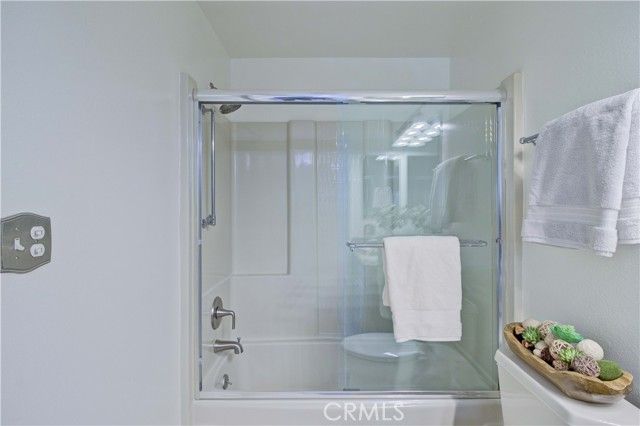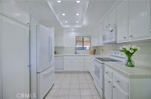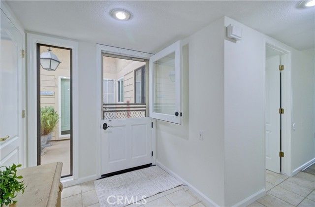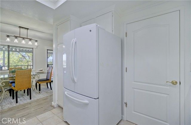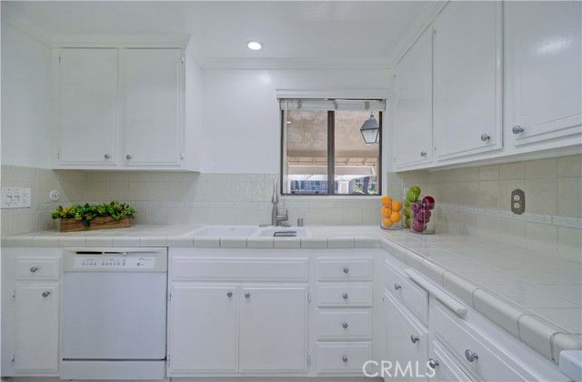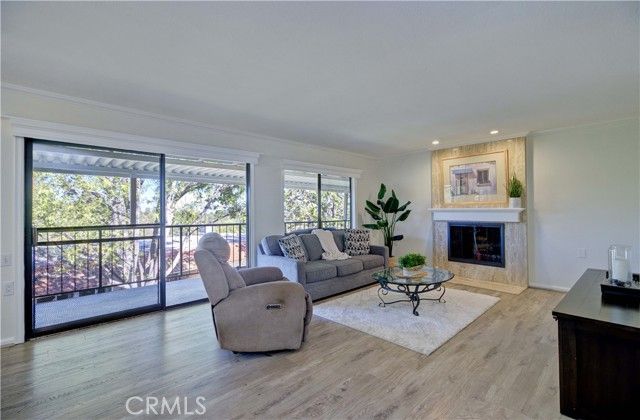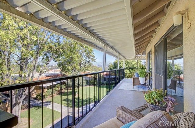 Upper level CONDO with 8 steps, end unit "La Brisa" with a VIEW! Enjoy the beautiful location close to Gate 7 and 8 for easy access to the community. Dutch door entry with glass insert provides a welcoming entry, inside you'll love this ranch style floorplan with living areas on one side and sleeping areas on the other. Interior has been freshly painted, ceilings are smooth and interior doors have been upgraded to paneled. Tiled entry/kitchen/hall/bathrooms and vinyl plank on the remainder of the floors provide an easy care home. Bright kitchen area features recessed lighting, tile counters and white appliances. Dining area enjoys the view and upgraded with a contemporary light fixture. The dining and living room flow together nicely for a great space anchored by the fireplace feature wall with access to the covered, wrap around balcony facing northwest with view of canyon hills, city light and mountain view to the east. Guest bathroom has been updated with granite vanity top, skylight, fiberglass tub/shower with glass enclosure along with new faucets and fixtures. Adjacent guest bedroom features full wall of built-in shelving and mirrored closet doors. Both bedroom windows face southeast enjoying some morning sun and afternoon brightness. Stack WASHER/DRYER and TANKLESS WATER HEATER are located in the hallway closet along with laundry storage center. Spacious primary suite has long, mirrored closet area with generously sized vanity, overhead skylight and walk-in shower behind the privacy door. A beautiful home with great light, view and breezes! This move-in-ready condo offers the perfect blend of scenic beauty, well-thought updates, and low-maintenance living—an ideal place to enjoy everything Laguna Woods Village has to offer! Residents enjoy an exceptional lifestyle with access to championship and executive golf courses, swimming pools, fitness centers, pickleball and tennis courts, lawn bowling, multiple clubhouses, horse stables, gardening centers, art studios, computer labs, educational classes, and over 200 clubs and organizations.